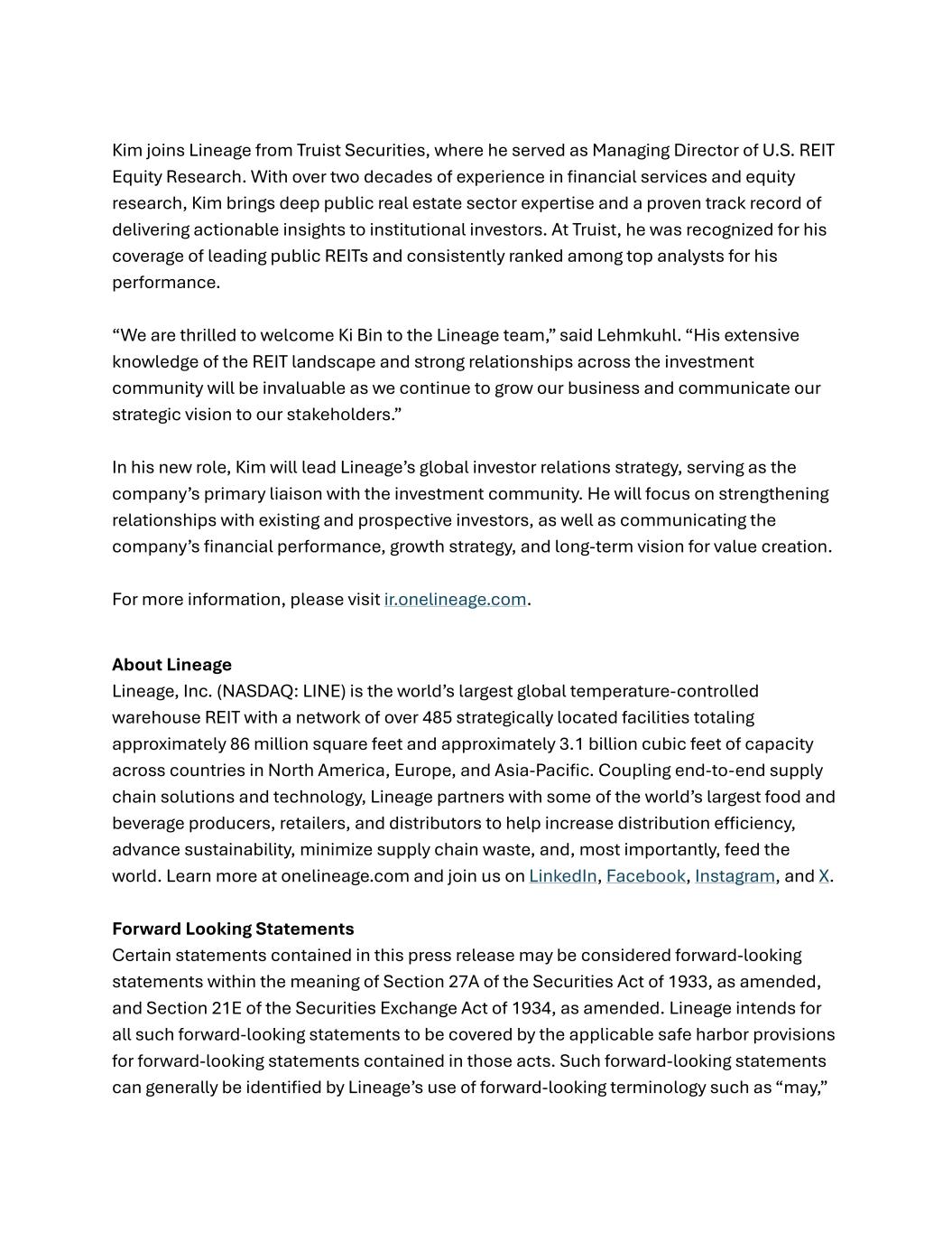 Kim joins Lineage from Truist Securities, where he served as Managing Director of U.S. REIT Equity Research. With over two decades of experience in financial services and equity research, Kim brings deep public real estate sector expertise and a proven track record of delivering actionable insights to institutional investors. At Truist, he was recognized for his coverage of leading public REITs and consistently ranked among top analysts for his performance. “We are thrilled to welcome Ki Bin to the Lineage team,” said Lehmkuhl. “His extensive knowledge of the REIT landscape and strong relationships across the investment community will be invaluable as we continue to grow our business and communicate our strategic vision to our stakeholders.” In his new role, Kim will lead Lineage’s global investor relations strategy, serving as the company’s primary liaison with the investment community. He will focus on strengthening relationships with existing and prospective investors, as well as communicating the company’s financial performance, growth strategy, and long-term vision for value creation. For more information, please visit ir.onelineage.com. About Lineage Lineage, Inc. (NASDAQ: LINE) is the world’s largest global temperature-controlled warehouse REIT with a network of over 485 strategically located facilities totaling approximately 86 million square feet and approximately 3.1 billion cubic feet of capacity across countries in North America, Europe, and Asia-Pacific. Coupling end-to-end supply chain solutions and technology, Lineage partners with some of the world’s largest food and beverage producers, retailers, and distributors to help increase distribution efficiency, advance sustainability, minimize supply chain waste, and, most importantly, feed the world. Learn more at onelineage.com and join us on LinkedIn, Facebook, Instagram, and X. Forward Looking Statements Certain statements contained in this press release may be considered forward-looking statements within the meaning of Section 27A of the Securities Act of 1933, as amended, and Section 21E of the Securities Exchange Act of 1934, as amended. Lineage intends for all such forward-looking statements to be covered by the applicable safe harbor provisions for forward-looking statements contained in those acts. Such forward-looking statements can generally be identified by Lineage’s use of forward-looking terminology such as “may,”