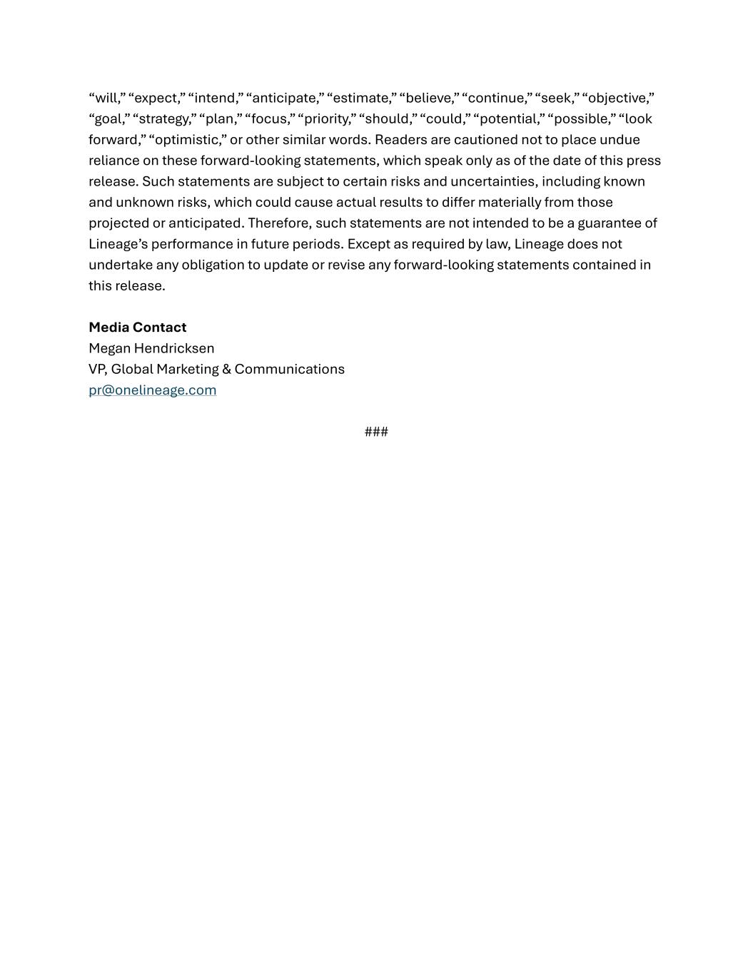 “will,” “expect,” “intend,” “anticipate,” “estimate,” “believe,” “continue,” “seek,” “objective,” “goal,” “strategy,” “plan,” “focus,” “priority,” “should,” “could,” “potential,” “possible,” “look forward,” “optimistic,” or other similar words. Readers are cautioned not to place undue reliance on these forward-looking statements, which speak only as of the date of this press release. Such statements are subject to certain risks and uncertainties, including known and unknown risks, which could cause actual results to differ materially from those projected or anticipated. Therefore, such statements are not intended to be a guarantee of Lineage’s performance in future periods. Except as required by law, Lineage does not undertake any obligation to update or revise any forward-looking statements contained in this release. Media Contact Megan Hendricksen VP, Global Marketing & Communications pr@onelineage.com ###