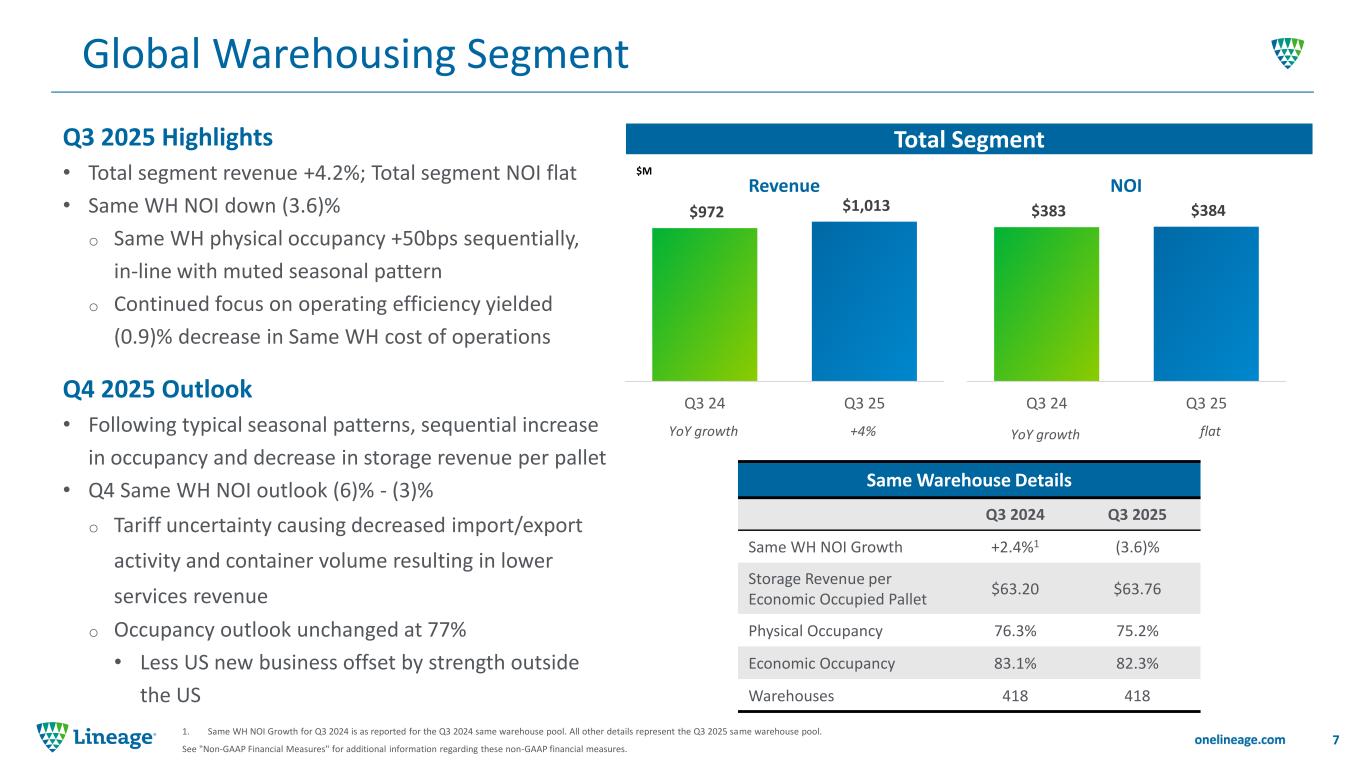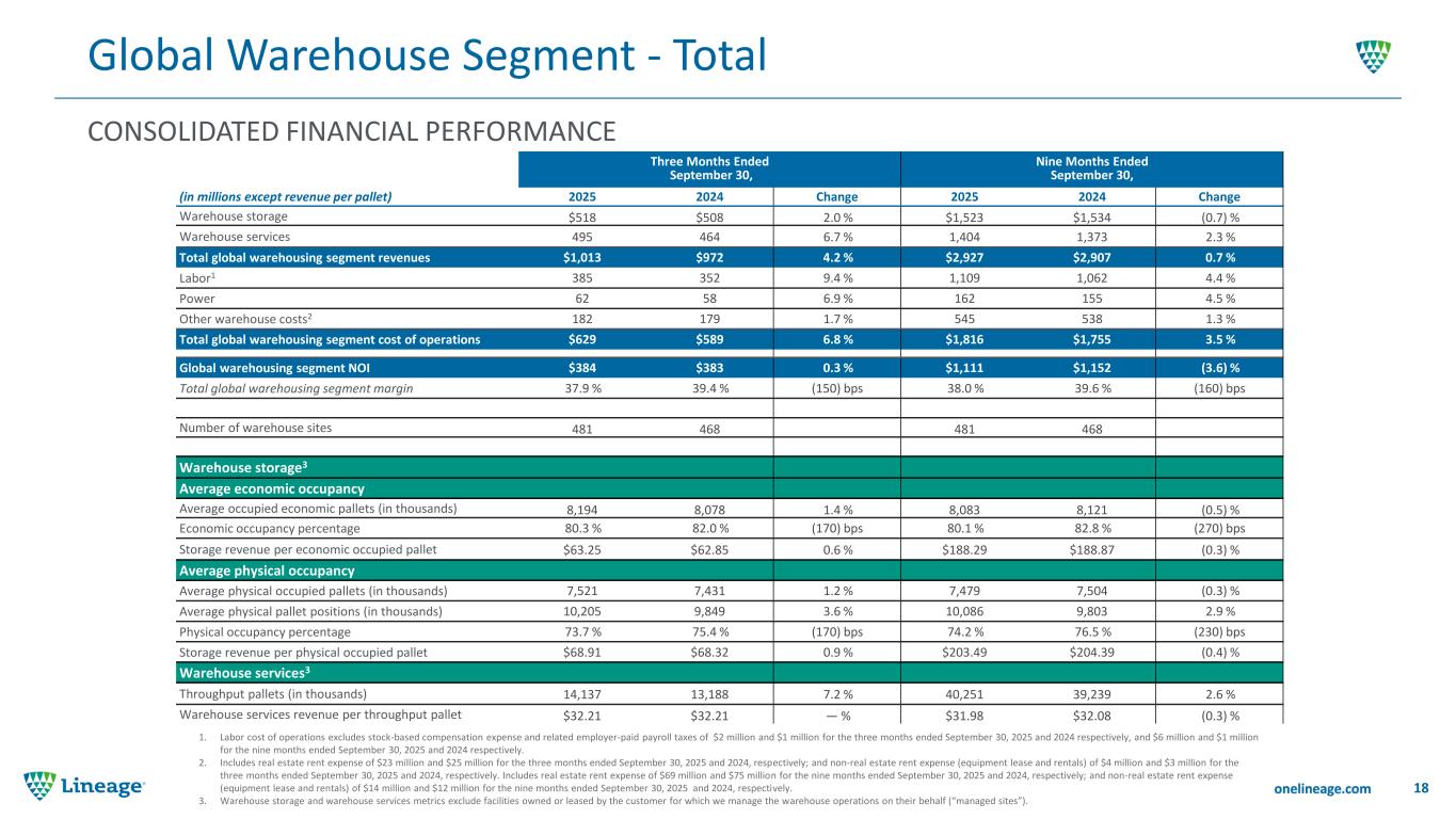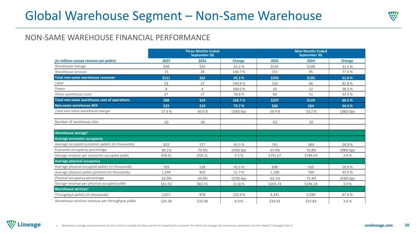 NON-SAME WAREHOUSE FINANCIAL PERFORMANCE Global Warehouse Segment – Non-Same Warehouse 201. Warehouse storage and warehouse services metrics exclude facilities owned or leased by the customer for which we manage the warehouse operations on their behalf (“managed sites”). Three Months Ended September 30, Nine Months Ended September 30, (in millions except revenue per pallet) 2025 2024 Change 2025 2024 Change Warehouse storage $48 $34 41.2 % $142 $108 31.5 % Warehouse services 73 28 160.7 % 151 85 77.6 % Total non-same warehouse revenues $121 $62 95.2 % $293 $193 51.8 % Labor 53 22 140.9 % 120 66 81.8 % Power 8 4 100.0 % 19 12 58.3 % Other warehouse costs 27 17 58.8 % 68 51 33.3 % Total non-same warehouse cost of operations $88 $43 104.7 % $207 $129 60.5 % Non-same warehouse NOI $33 $19 73.7 % $86 $64 34.4 % Total non-same warehouse margin 27.3 % 30.6 % (330) bps 29.4 % 33.2 % (380) bps Number of warehouse sites 63 50 63 50 Warehouse storage1 Average economic occupancy Average occupied economic pallets (in thousands) 822 577 42.5 % 741 584 26.9 % Economic occupancy percentage 66.1% 70.4% (430) bps 67.0% 76.8% (980) bps Storage revenue per economic occupied pallet $58.61 $58.31 0.5 % $191.67 $184.64 3.8 % Average physical occupancy Average physical occupied pallets (in thousands) 783 538 45.5 % 698 550 26.9 % Average physical pallet positions (in thousands) 1,244 820 51.7 % 1,106 760 45.5 % Physical occupancy percentage 62.9% 65.6% (270) bps 63.1% 72.4% (930) bps Storage revenue per physical occupied pallet $61.52 $62.51 (1.6) % $203.74 $196.18 3.9 % Warehouse services1 Throughput pallets (in thousands) 2,071 878 135.9 % 4,341 2,590 67.6 % Warehouse services revenue per throughput pallet $35.39 $33.40 6.0 % $34.02 $32.83 3.6 %