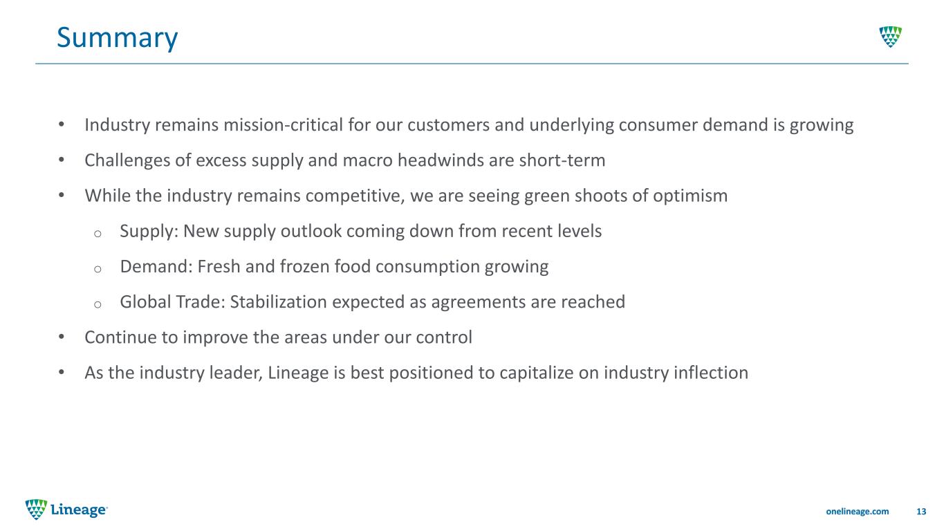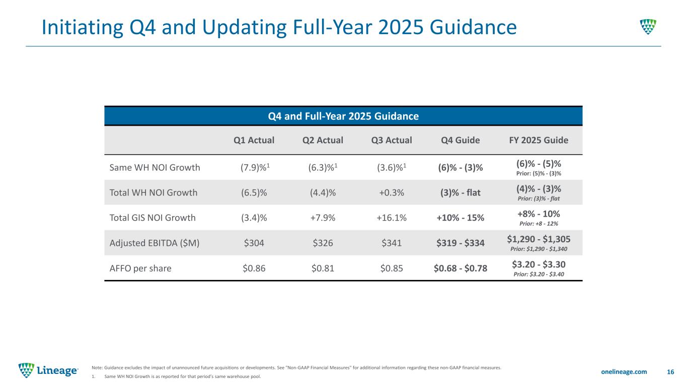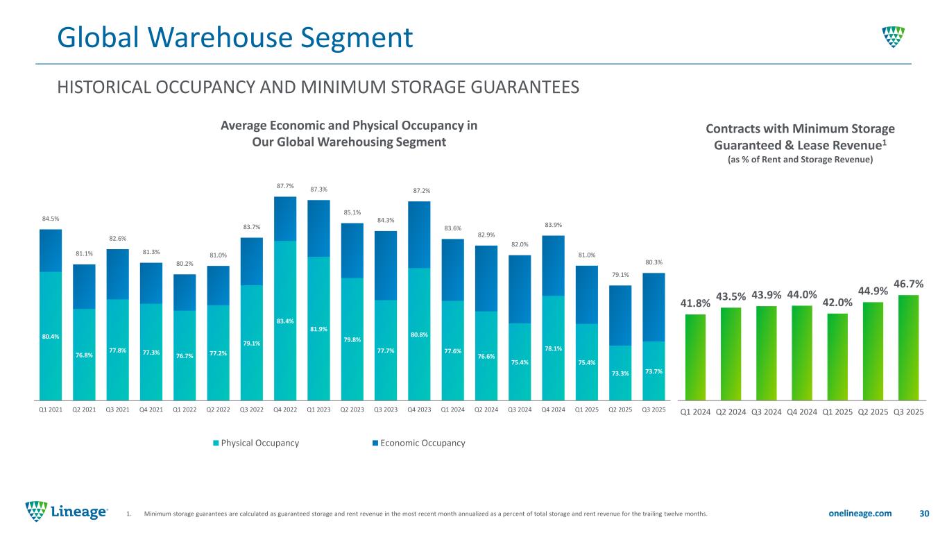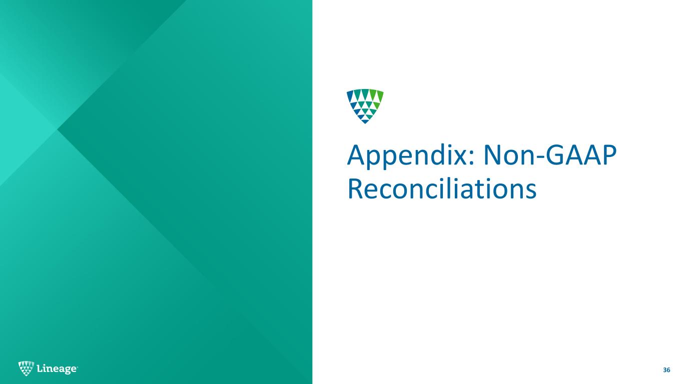 Forward-Looking Statements. Certain statements contained in this Presentation, other than historical facts, may be considered forward-looking statements within the meaning of the Private Securities Litigation Reform Act of 1995. These forward-looking statements are based on current expectations, estimates and projections about the industry and markets in which Lineage operates, and beliefs of, and assumptions made by, the Company and involve uncertainties that could significantly affect Lineage’s financial results. Such forward-looking statements generally can be identified by the use of forward-looking terminology such as “may,” “will,” “can,” “intend,” “anticipate,” “estimate,” “believe,” “continue,” “possible,” “initiatives,” “measures,” “poised,” “focus,” “seek,” “objective,” “goal,” “vision,” “drive,” “opportunity,” “target,” “strategy,” “expect,” “plan,” “potential,” “potentially,” “preparing,” “projected,” “future,” “tomorrow,” “long-term,” “should,” “could,” “would,” “might,” “help,” “aimed”, or other similar words. You are cautioned not to place undue reliance on these forward-looking statements, which speak only as of the date of this Presentation. Such statements include, but are not limited to statements about Lineage’s plans, strategies, initiatives, and prospects and statements about its future results of operations, capital expenditures and liquidity. Such statements are subject to known and unknown risks and uncertainties, which could cause actual results to differ materially from those projected or anticipated, including, without limitation: general business and economic conditions; continued volatility and uncertainty in the credit markets and broader financial markets, including potential fluctuations in the Consumer Price Index and changes in foreign currency exchange rates; the impact of tariffs and global trade disruptions on us and our customers; other risks inherent in the real estate business, including customer defaults, potential liability related to environmental matters, illiquidity of real estate investments and potential damages from natural disasters; the availability of suitable acquisitions and our ability to acquire properties or businesses on favorable terms; our success in implementing our business strategy and our ability to identify, underwrite, finance, consummate, integrate and manage diversifying acquisitions or investments; our ability to meet budgeted or stabilized returns on our development and expansion projects within expected time frames, or at all; our ability to manage our expanded operations, including expansion into new markets or business lines; our failure to realize the intended benefits from, or disruptions to our plans and operations or unknown or contingent liabilities related to, our recent and future acquisitions and greenfield developments; our failure to successfully integrate and operate acquired or developed properties or businesses; our ability to renew significant customer contracts; the impact of supply chain disruptions, including the impact on labor availability, raw material availability, manufacturing and food production, and transportation; difficulties managing an international business and acquiring or operating properties in foreign jurisdictions and unfamiliar metropolitan areas; changes in political conditions, geopolitical turmoil, political instability, civil disturbances, restrictive governmental actions or nationalization in the countries in which we operate; the degree and nature of our competition; our failure to generate sufficient cash flows to service our outstanding indebtedness; our ability to access debt and equity capital markets; continued volatility in interest rates; increased power, labor, or construction costs; changes in consumer demand or preferences for products we store in our warehouses; decreased storage rates or increased vacancy rates; labor shortages or our inability to attract and retain talent; changes in, or the failure or inability to comply with, government regulation; a failure of our information technology systems, systems conversions and integrations, cybersecurity attacks or a breach of our information security systems, networks, or processes; our failure to maintain our status as a real estate investment trust (“REIT”) for U.S. federal income tax purposes; changes in local, state, federal, and international laws and regulations, including related to taxation, tariffs, real estate and zoning laws, and increases in real property tax rates; the impact of any financial, accounting, legal, tax or regulatory issues or litigation that may affect us; and any other risks discussed in the Company’s filings with the SEC, including our Annual Report on Form 10-K for the year ended December 31, 2024. Should one of more of the risks or uncertainties described above occur, or should underlying assumptions prove incorrect, actual results and plans could differ materially from those expressed in any forward-looking statements. Forward-looking statements in this Presentation speak only as of the date of this Presentation, and undue reliance should not be placed on such statements. We undertake no obligation to, nor do we intend to, update, or otherwise revise, any such statements that may become untrue because of subsequent events. There can be no assurance that the forward-looking statements can or will be attained or maintained. The forward-looking statements included in this Presentation have been included for purposes of illustration only, and no assurance can be given that the actual results will correspond with the results contemplated in the forward-looking statements. Market Data. We use market data throughout this Presentation that has generally been obtained from external, independent, and publicly available information and industry