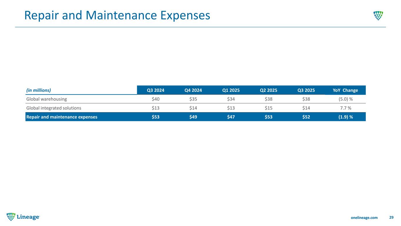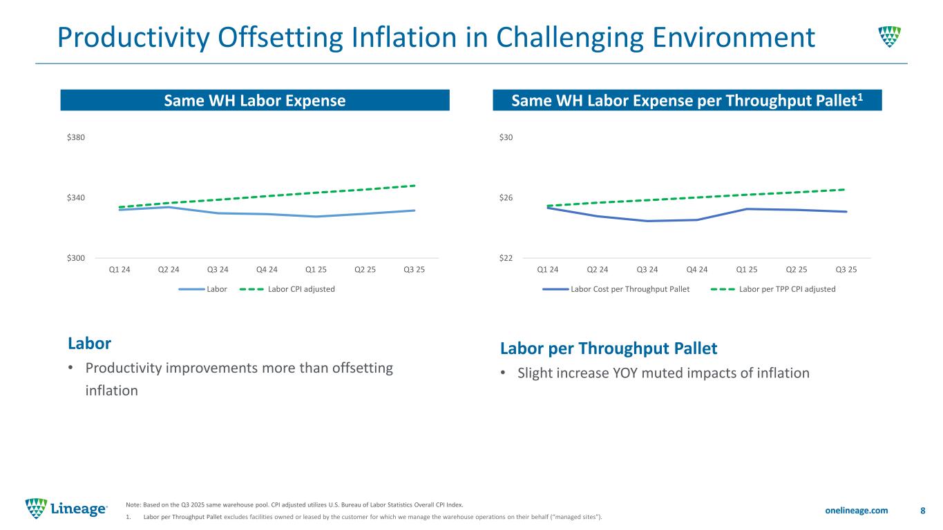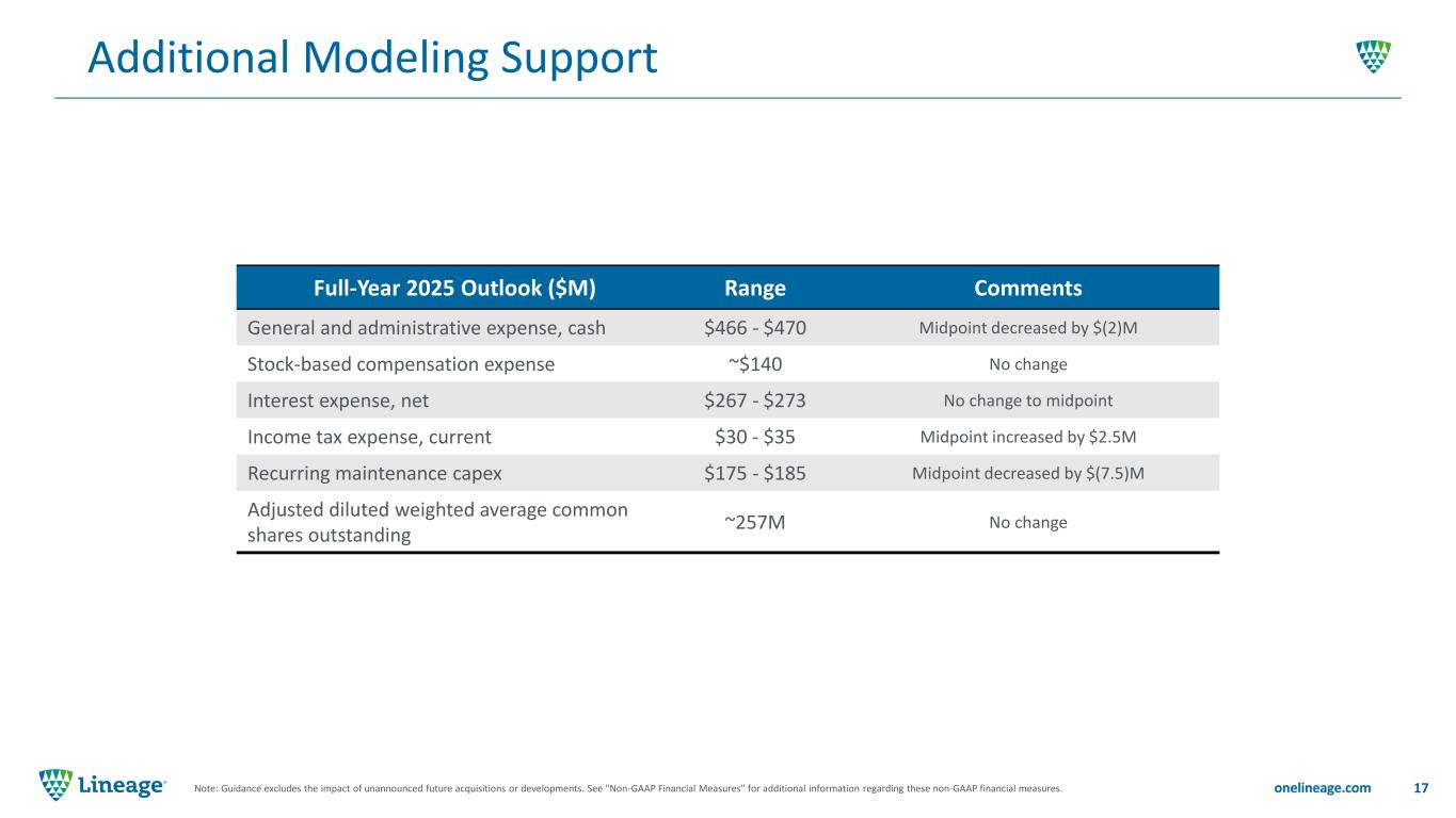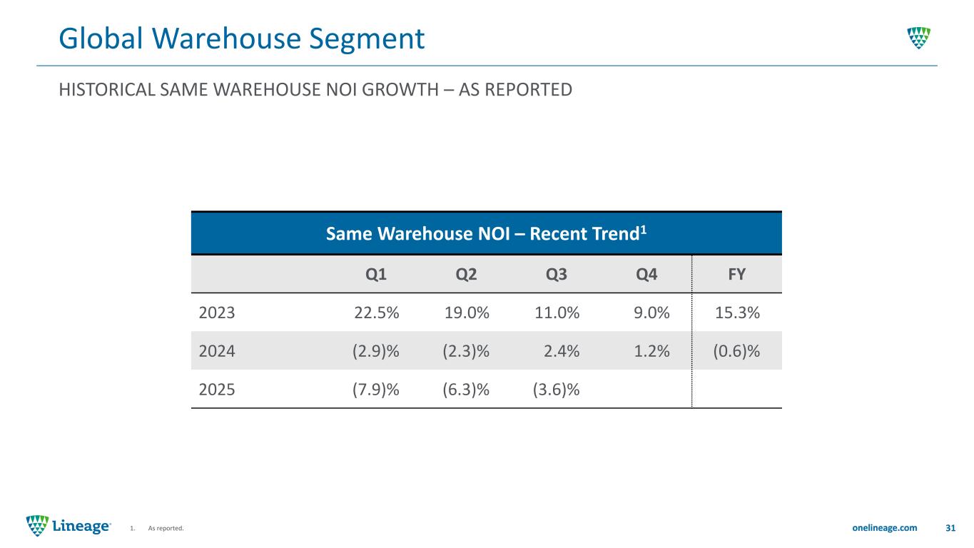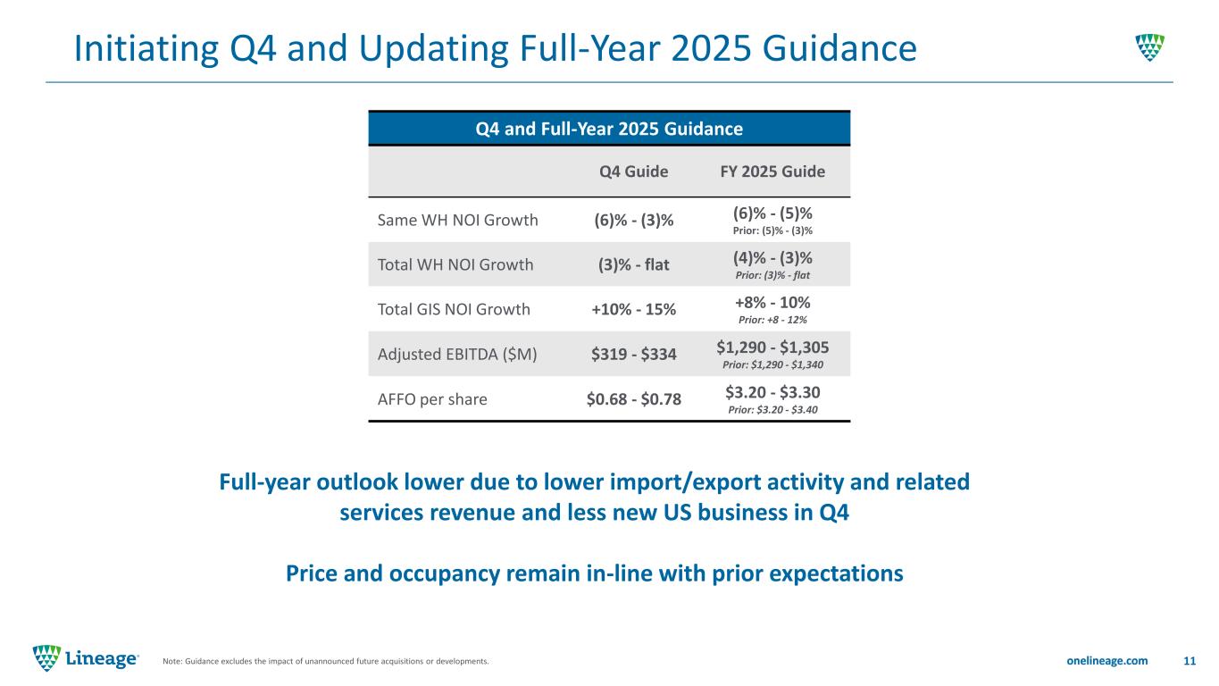 Forward-Looking Statements. Certain statements contained in this Presentation, other than historical facts, may be considered forward-looking statements within the meaning of the Private Securities Litigation Reform Act of 1995. These forward-looking statements are based on current expectations, estimates and projections about the industry and markets in which Lineage operates, and beliefs of, and assumptions made by, the Company and involve uncertainties that could significantly affect Lineage’s financial results. Such forward-looking statements generally can be identified by the use of forward-looking terminology such as “may,” “will,” “can,” “intend,” “anticipate,” “estimate,” “believe,” “continue,” “possible,” “initiatives,” “measures,” “poised,” “focus,” “seek,” “objective,” “goal,” “vision,” “drive,” “opportunity,” “target,” “strategy,” “expect,” “plan,” “potential,” “potentially,” “preparing,” “projected,” “future,” “tomorrow,” “long-term,” “should,” “could,” “would,” “might,” “help,” “aimed”, or other similar words. You are cautioned not to place undue reliance on these forward-looking statements, which speak only as of the date of this Presentation. Such statements include, but are not limited to statements about Lineage’s plans, strategies, initiatives, and prospects and statements about its future results of operations, capital expenditures and liquidity. Such statements are subject to known and unknown risks and uncertainties, which could cause actual results to differ materially from those projected or anticipated, including, without limitation: general business and economic conditions; continued volatility and uncertainty in the credit markets and broader financial markets, including potential fluctuations in the Consumer Price Index and changes in foreign currency exchange rates; the impact of tariffs and global trade disruptions on us and our customers; other risks inherent in the real estate business, including customer defaults, potential liability related to environmental matters, illiquidity of real estate investments and potential damages from natural disasters; the availability of suitable acquisitions and our ability to acquire properties or businesses on favorable terms; our success in implementing our business strategy and our ability to identify, underwrite, finance, consummate, integrate and manage diversifying acquisitions or investments; our ability to meet budgeted or stabilized returns on our development and expansion projects within expected time frames, or at all; our ability to manage our expanded operations, including expansion into new markets or business lines; our failure to realize the intended benefits from, or disruptions to our plans and operations or unknown or contingent liabilities related to, our recent and future acquisitions and greenfield developments; our failure to successfully integrate and operate acquired or developed properties or businesses; our ability to renew significant customer contracts; the impact of supply chain disruptions, including the impact on labor availability, raw material availability, manufacturing and food production, and transportation; difficulties managing an international business and acquiring or operating properties in foreign jurisdictions and unfamiliar metropolitan areas; changes in political conditions, geopolitical turmoil, political instability, civil disturbances, restrictive governmental actions or nationalization in the countries in which we operate; the degree and nature of our competition; our failure to generate sufficient cash flows to service our outstanding indebtedness; our ability to access debt and equity capital markets; continued volatility in interest rates; increased power, labor, or construction costs; changes in consumer demand or preferences for products we store in our warehouses; decreased storage rates or increased vacancy rates; labor shortages or our inability to attract and retain talent; changes in, or the failure or inability to comply with, government regulation; a failure of our information technology systems, systems conversions and integrations, cybersecurity attacks or a breach of our information security systems, networks, or processes; our failure to maintain our status as a real estate investment trust (“REIT”) for U.S. federal income tax purposes; changes in local, state, federal, and international laws and regulations, including related to taxation, tariffs, real estate and zoning laws, and increases in real property tax rates; the impact of any financial, accounting, legal, tax or regulatory issues or litigation that may affect us; and any other risks discussed in the Company’s filings with the SEC, including our Annual Report on Form 10-K for the year ended December 31, 2024. Should one of more of the risks or uncertainties described above occur, or should underlying assumptions prove incorrect, actual results and plans could differ materially from those expressed in any forward-looking statements. Forward-looking statements in this Presentation speak only as of the date of this Presentation, and undue reliance should not be placed on such statements. We undertake no obligation to, nor do we intend to, update, or otherwise revise, any such statements that may become untrue because of subsequent events. There can be no assurance that the forward-looking statements can or will be attained or maintained. The forward-looking statements included in this Presentation have been included for purposes of illustration only, and no assurance can be given that the actual results will correspond with the results contemplated in the forward-looking statements. Market Data. We use market data throughout this Presentation that has generally been obtained from external, independent, and publicly available information and industry