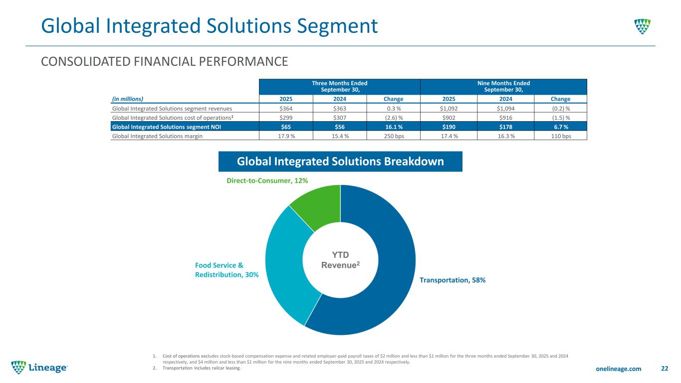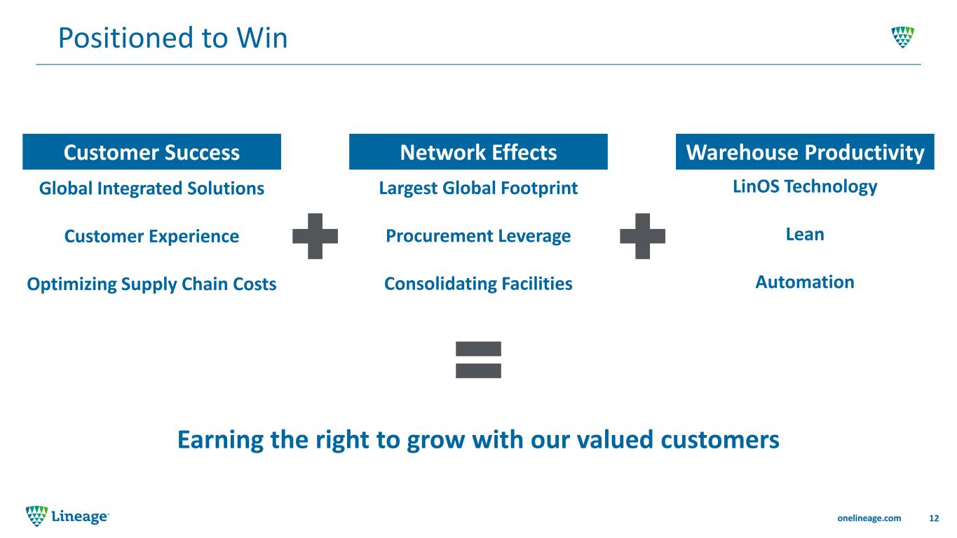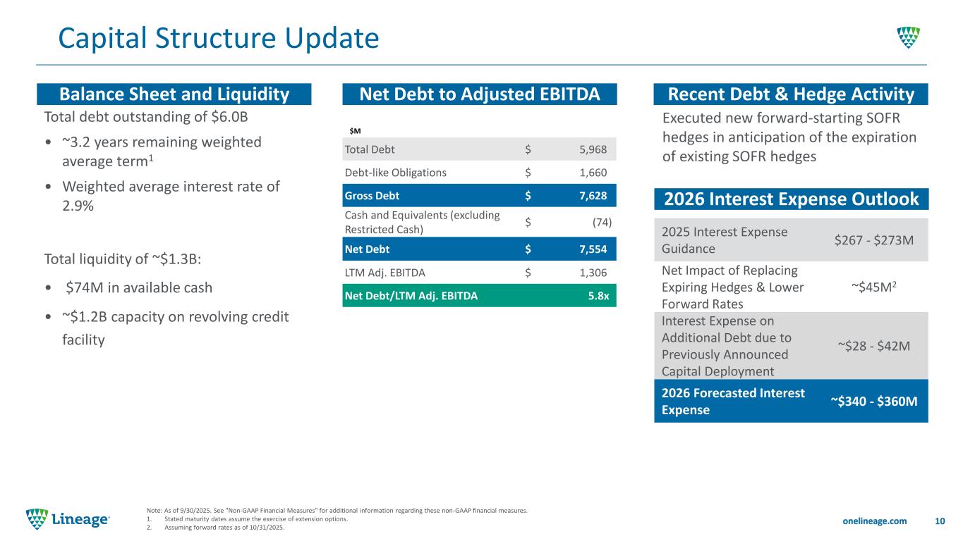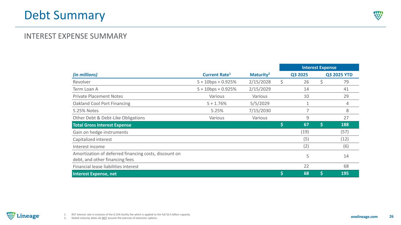 Forward-Looking Statements. Certain statements contained in this Presentation, other than historical facts, may be considered forward-looking statements within the meaning of the Private Securities Litigation Reform Act of 1995. These forward-looking statements are based on current expectations, estimates and projections about the industry and markets in which Lineage operates, and beliefs of, and assumptions made by, the Company and involve uncertainties that could significantly affect Lineage’s financial results. Such forward-looking statements generally can be identified by the use of forward-looking terminology such as “may,” “will,” “can,” “intend,” “anticipate,” “estimate,” “believe,” “continue,” “possible,” “initiatives,” “measures,” “poised,” “focus,” “seek,” “objective,” “goal,” “vision,” “drive,” “opportunity,” “target,” “strategy,” “expect,” “plan,” “potential,” “potentially,” “preparing,” “projected,” “future,” “tomorrow,” “long-term,” “should,” “could,” “would,” “might,” “help,” “aimed”, or other similar words. You are cautioned not to place undue reliance on these forward-looking statements, which speak only as of the date of this Presentation. Such statements include, but are not limited to statements about Lineage’s plans, strategies, initiatives, and prospects and statements about its future results of operations, capital expenditures and liquidity. Such statements are subject to known and unknown risks and uncertainties, which could cause actual results to differ materially from those projected or anticipated, including, without limitation: general business and economic conditions; continued volatility and uncertainty in the credit markets and broader financial markets, including potential fluctuations in the Consumer Price Index and changes in foreign currency exchange rates; the impact of tariffs and global trade disruptions on us and our customers; other risks inherent in the real estate business, including customer defaults, potential liability related to environmental matters, illiquidity of real estate investments and potential damages from natural disasters; the availability of suitable acquisitions and our ability to acquire properties or businesses on favorable terms; our success in implementing our business strategy and our ability to identify, underwrite, finance, consummate, integrate and manage diversifying acquisitions or investments; our ability to meet budgeted or stabilized returns on our development and expansion projects within expected time frames, or at all; our ability to manage our expanded operations, including expansion into new markets or business lines; our failure to realize the intended benefits from, or disruptions to our plans and operations or unknown or contingent liabilities related to, our recent and future acquisitions and greenfield developments; our failure to successfully integrate and operate acquired or developed properties or businesses; our ability to renew significant customer contracts; the impact of supply chain disruptions, including the impact on labor availability, raw material availability, manufacturing and food production, and transportation; difficulties managing an international business and acquiring or operating properties in foreign jurisdictions and unfamiliar metropolitan areas; changes in political conditions, geopolitical turmoil, political instability, civil disturbances, restrictive governmental actions or nationalization in the countries in which we operate; the degree and nature of our competition; our failure to generate sufficient cash flows to service our outstanding indebtedness; our ability to access debt and equity capital markets; continued volatility in interest rates; increased power, labor, or construction costs; changes in consumer demand or preferences for products we store in our warehouses; decreased storage rates or increased vacancy rates; labor shortages or our inability to attract and retain talent; changes in, or the failure or inability to comply with, government regulation; a failure of our information technology systems, systems conversions and integrations, cybersecurity attacks or a breach of our information security systems, networks, or processes; our failure to maintain our status as a real estate investment trust (“REIT”) for U.S. federal income tax purposes; changes in local, state, federal, and international laws and regulations, including related to taxation, tariffs, real estate and zoning laws, and increases in real property tax rates; the impact of any financial, accounting, legal, tax or regulatory issues or litigation that may affect us; and any other risks discussed in the Company’s filings with the SEC, including our Annual Report on Form 10-K for the year ended December 31, 2024. Should one of more of the risks or uncertainties described above occur, or should underlying assumptions prove incorrect, actual results and plans could differ materially from those expressed in any forward-looking statements. Forward-looking statements in this Presentation speak only as of the date of this Presentation, and undue reliance should not be placed on such statements. We undertake no obligation to, nor do we intend to, update, or otherwise revise, any such statements that may become untrue because of subsequent events. There can be no assurance that the forward-looking statements can or will be attained or maintained. The forward-looking statements included in this Presentation have been included for purposes of illustration only, and no assurance can be given that the actual results will correspond with the results contemplated in the forward-looking statements. Market Data. We use market data throughout this Presentation that has generally been obtained from external, independent, and publicly available information and industry
