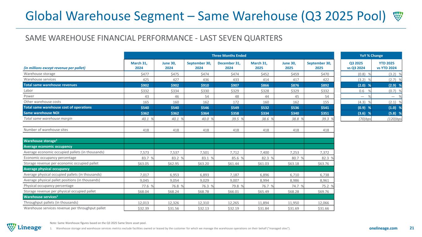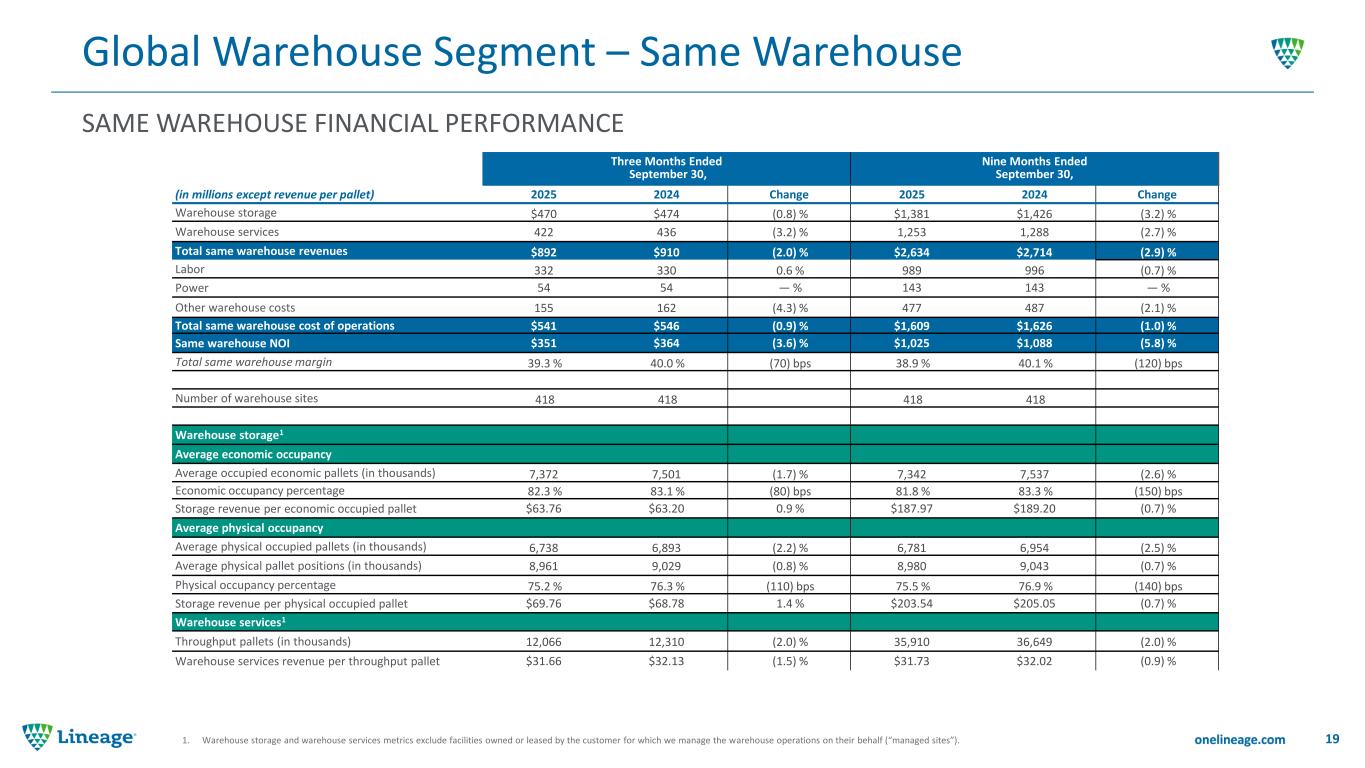 SAME WAREHOUSE FINANCIAL PERFORMANCE Global Warehouse Segment – Same Warehouse 191. Warehouse storage and warehouse services metrics exclude facilities owned or leased by the customer for which we manage the warehouse operations on their behalf (“managed sites”). Three Months Ended September 30, Nine Months Ended September 30, (in millions except revenue per pallet) 2025 2024 Change 2025 2024 Change Warehouse storage $470 $474 (0.8) % $1,381 $1,426 (3.2) % Warehouse services 422 436 (3.2) % 1,253 1,288 (2.7) % Total same warehouse revenues $892 $910 (2.0) % $2,634 $2,714 (2.9) % Labor 332 330 0.6 % 989 996 (0.7) % Power 54 54 — % 143 143 — % Other warehouse costs 155 162 (4.3) % 477 487 (2.1) % Total same warehouse cost of operations $541 $546 (0.9) % $1,609 $1,626 (1.0) % Same warehouse NOI $351 $364 (3.6) % $1,025 $1,088 (5.8) % Total same warehouse margin 39.3 % 40.0 % (70) bps 38.9 % 40.1 % (120) bps Number of warehouse sites 418 418 418 418 Warehouse storage1 Average economic occupancy Average occupied economic pallets (in thousands) 7,372 7,501 (1.7) % 7,342 7,537 (2.6) % Economic occupancy percentage 82.3 % 83.1 % (80) bps 81.8 % 83.3 % (150) bps Storage revenue per economic occupied pallet $63.76 $63.20 0.9 % $187.97 $189.20 (0.7) % Average physical occupancy Average physical occupied pallets (in thousands) 6,738 6,893 (2.2) % 6,781 6,954 (2.5) % Average physical pallet positions (in thousands) 8,961 9,029 (0.8) % 8,980 9,043 (0.7) % Physical occupancy percentage 75.2 % 76.3 % (110) bps 75.5 % 76.9 % (140) bps Storage revenue per physical occupied pallet $69.76 $68.78 1.4 % $203.54 $205.05 (0.7) % Warehouse services1 Throughput pallets (in thousands) 12,066 12,310 (2.0) % 35,910 36,649 (2.0) % Warehouse services revenue per throughput pallet $31.66 $32.13 (1.5) % $31.73 $32.02 (0.9) %