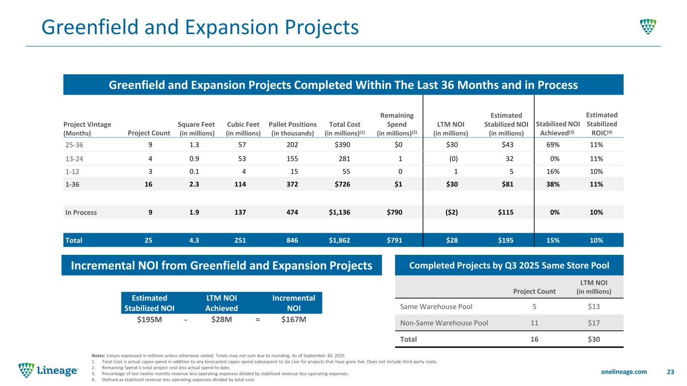 Greenfield and Expansion Projects 23 Notes: Values expressed in millions unless otherwise stated. Totals may not sum due to rounding. As of September 30, 2025. 1. Total Cost is actual capex spend in addition to any forecasted capex spend subsequent to Go Live for projects that have gone live. Does not include third-party costs. 2. Remaining Spend is total project cost less actual spend to date. 3. Percentage of last twelve months revenue less operating expenses divided by stabilized revenue less operating expenses. 4. Defined as stabilized revenue less operating expenses divided by total cost. Greenfield and Expansion Projects Completed Within The Last 36 Months and in Process Project Vintage (Months) Project Count Square Feet (in millions) Cubic Feet (in millions) Pallet Positions (in thousands) Total Cost (in millions)(1) Remaining Spend (in millions)(2) LTM NOI (in millions) Estimated Stabilized NOI (in millions) Stabilized NOI Achieved(3) Estimated Stabilized ROIC(4) 25-36 9 1.3 57 202 $390 $0 $30 $43 69% 11% 13-24 4 0.9 53 155 281 1 (0) 32 0% 11% 1-12 3 0.1 4 15 55 0 1 5 16% 10% 1-36 16 2.3 114 372 $726 $1 $30 $81 38% 11% In Process 9 1.9 137 474 $1,136 $790 ($2) $115 0% 10% Total 25 4.3 251 846 $1,862 $791 $28 $195 15% 10% Incremental NOI from Greenfield and Expansion Projects Estimated Stabilized NOI LTM NOI Achieved Incremental NOI $195M - $28M = $167M Completed Projects by Q3 2025 Same Store Pool Project Count LTM NOI (in millions) Same Warehouse Pool 5 $13 Non-Same Warehouse Pool 11 $17 Total 16 $30