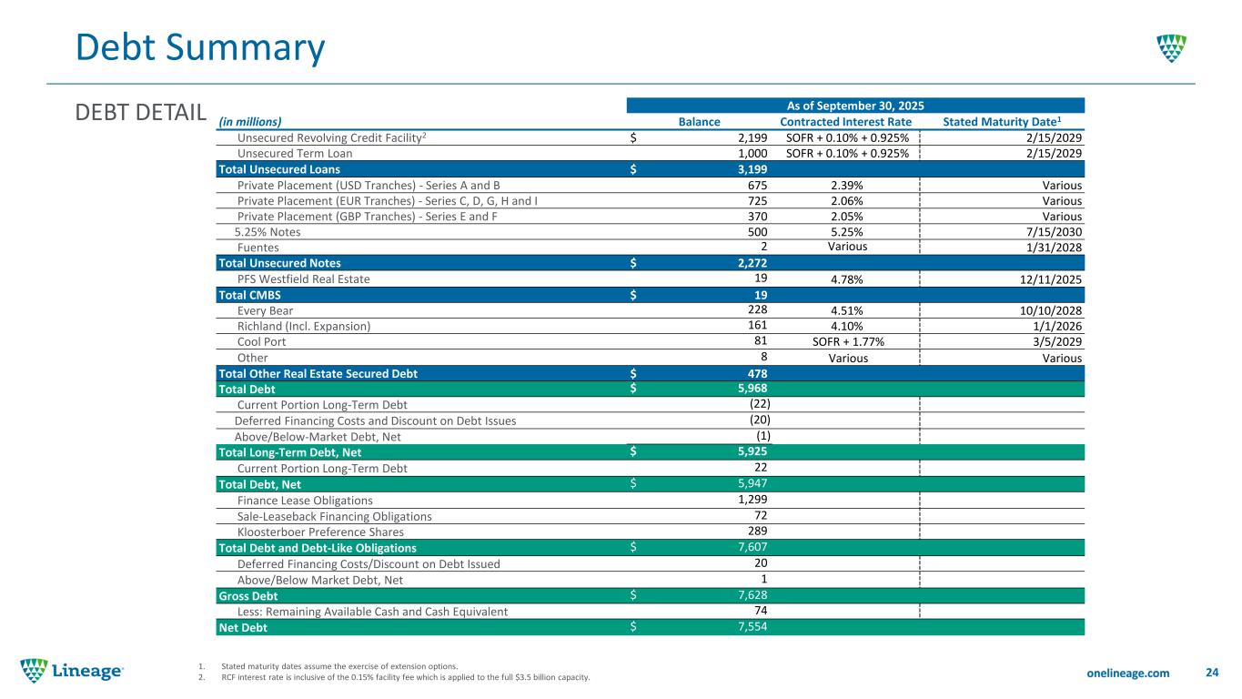 DEBT DETAIL Debt Summary 24 1. Stated maturity dates assume the exercise of extension options. 2. RCF interest rate is inclusive of the 0.15% facility fee which is applied to the full $3.5 billion capacity. As of September 30, 2025 (in millions) Balance Contracted Interest Rate Stated Maturity Date1 Unsecured Revolving Credit Facility2 $ 2,199 SOFR + 0.10% + 0.925% 2/15/2029 Unsecured Term Loan 1,000 SOFR + 0.10% + 0.925% 2/15/2029 Total Unsecured Loans $ 3,199 Private Placement (USD Tranches) - Series A and B 675 2.39% Various Private Placement (EUR Tranches) - Series C, D, G, H and I 725 2.06% Various Private Placement (GBP Tranches) - Series E and F 370 2.05% Various 5.25% Notes 500 5.25% 7/15/2030 Fuentes 2 Various 1/31/2028 Total Unsecured Notes $ 2,272 PFS Westfield Real Estate 19 4.78% 12/11/2025 Total CMBS $ 19 Every Bear 228 4.51% 10/10/2028 Richland (Incl. Expansion) 161 4.10% 1/1/2026 Cool Port 81 SOFR + 1.77% 3/5/2029 Other 8 Various Various Total Other Real Estate Secured Debt $ 478 Total Debt $ 5,968 Current Portion Long-Term Debt (22) Deferred Financing Costs and Discount on Debt Issues (20) Above/Below-Market Debt, Net (1) Total Long-Term Debt, Net $ 5,925 Current Portion Long-Term Debt 22 Total Debt, Net $ 5,947 Finance Lease Obligations 1,299 Sale-Leaseback Financing Obligations 72 Kloosterboer Preference Shares 289 Total Debt and Debt-Like Obligations $ 7,607 Deferred Financing Costs/Discount on Debt Issued 20 Above/Below Market Debt, Net 1 Gross Debt $ 7,628 Less: Remaining Available Cash and Cash Equivalent 74 Net Debt $ 7,554