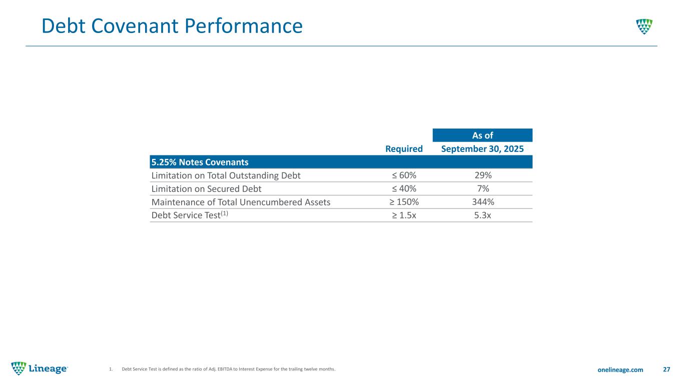 Debt Covenant Performance 271. Debt Service Test is defined as the ratio of Adj. EBITDA to Interest Expense for the trailing twelve months. As of Required September 30, 2025 5.25% Notes Covenants Limitation on Total Outstanding Debt ≤ 60% 29% Limitation on Secured Debt ≤ 40% 7% Maintenance of Total Unencumbered Assets ≥ 150% 344% Debt Service Test(1) ≥ 1.5x 5.3x