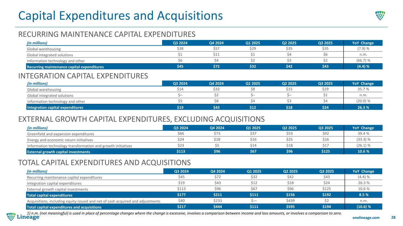 RECURRING MAINTENANCE CAPITAL EXPENDITURES Capital Expenditures and Acquisitions 28 (in millions) Q3 2024 Q4 2024 Q1 2025 Q2 2025 Q3 2025 YoY Change Global warehousing $38 $57 $29 $35 $35 (7.9) % Global integrated solutions $1 $11 $1 $4 $6 n.m. Information technology and other $6 $4 $2 $3 $2 (66.7) % Recurring maintenance capital expenditures $45 $72 $32 $42 $43 (4.4) % INTEGRATION CAPITAL EXPENDITURES (in millions) Q3 2024 Q4 2024 Q1 2025 Q2 2025 Q3 2025 YoY Change Global warehousing $14 $33 $8 $15 $19 35.7 % Global integrated solutions $– $2 $– $– $1 n.m. Information technology and other $5 $8 $4 $3 $4 (20.0) % Integration capital expenditures $19 $43 $12 $18 $24 26.3 % EXTERNAL GROWTH CAPITAL EXPENDITURES, EXCLUDING ACQUISITIONS (in millions) Q3 2024 Q4 2024 Q1 2025 Q2 2025 Q3 2025 YoY Change Greenfield and expansion expenditures $66 $73 $37 $53 $92 39.4 % Energy and economic return initiatives $24 $18 $16 $25 $16 (33.3) % Information technology transformation and growth initiatives $23 $5 $14 $18 $17 (26.1) % External growth capital investments $113 $96 $67 $96 $125 10.6 % TOTAL CAPITAL EXPENDITURES AND ACQUISITIONS (in millions) Q3 2024 Q4 2024 Q1 2025 Q2 2025 Q3 2025 YoY Change Recurring maintenance capital expenditures $45 $72 $32 $42 $43 (4.4) % Integration capital expenditures $19 $43 $12 $18 $24 26.3 % External growth capital investments $113 $96 $67 $96 $125 10.6 % Total capital expenditures $177 $211 $111 $156 $192 8.5 % Acquisitions, including equity issued and net of cash acquired and adjustments $40 $233 $— $439 $2 n.m. Total capital expenditures and acquisitions $217 $444 $111 $595 $194 (10.6) % 1) n.m. (not meaningful) is used in place of percentage changes where the change is excessive, involves a comparison between income and loss amounts, or involves a comparison to zero.