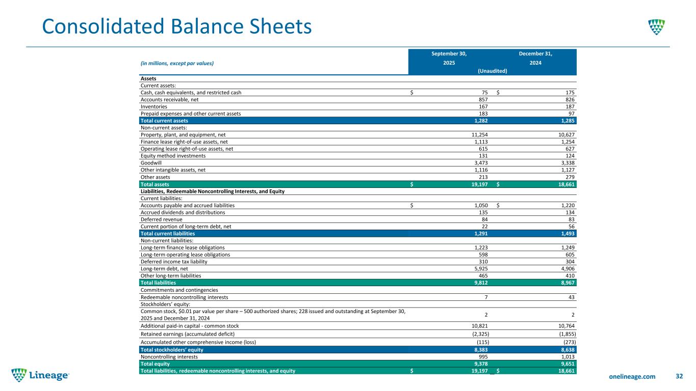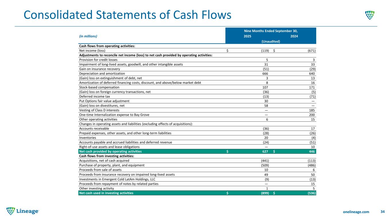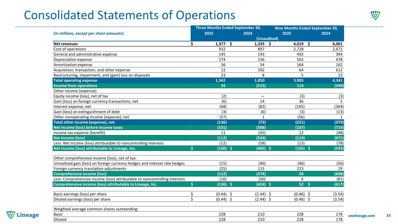 Consolidated Statements of Operations 33 Three Months Ended September 30, Nine Months Ended September 30, (in millions, except per share amounts) 2025 2024 2025 2024 (Unaudited) Net revenues $ 1,377 $ 1,335 $ 4,019 $ 4,001 Cost of operations 932 897 2,728 2,672 General and administrative expense 145 143 442 394 Depreciation expense 174 156 502 478 Amortization expense 56 54 164 162 Acquisition, transaction, and other expense 12 592 64 612 Restructuring, impairment, and (gain) loss on disposals 23 8 5 23 Total operating expense 1,342 1,850 3,905 4,341 Income from operations 35 (515) 114 (340) Other income (expense): Equity income (loss), net of tax (2) — (3) (3) Gain (loss) on foreign currency transactions, net (6) 14 36 5 Interest expense, net (68) (82) (195) (369) Gain (loss) on extinguishment of debt (3) (6) (3) (13) Other nonoperating income (expense), net (57) 1 (56) 1 Total other income (expense), net (136) (73) (221) (379) Net income (loss) before income taxes (101) (588) (107) (719) Income tax expense (benefit) 11 (45) 12 (48) Net income (loss) (112) (543) (119) (671) Less: Net income (loss) attributable to noncontrolling interests (12) (58) (13) (78) Net income (loss) attributable to Lineage, Inc. $ (100) $ (485) $ (106) $ (593) Other comprehensive income (loss), net of tax: Unrealized gain (loss) on foreign currency hedges and interest rate hedges (15) (46) (46) (56) Foreign currency translation adjustments (25) 115 223 29 Comprehensive income (loss) (152) (474) 58 (698) Less: Comprehensive income (loss) attributable to noncontrolling interests (16) (50) 6 (81) Comprehensive income (loss) attributable to Lineage, Inc. $ (136) $ (424) $ 52 $ (617) Basic earnings (loss) per share $ (0.44) $ (2.44) $ (0.46) $ (3.54) Diluted earnings (loss) per share $ (0.44) $ (2.44) $ (0.46) $ (3.54) Weighted average common shares outstanding: Basic 228 210 228 178 Diluted 228 210 228 178