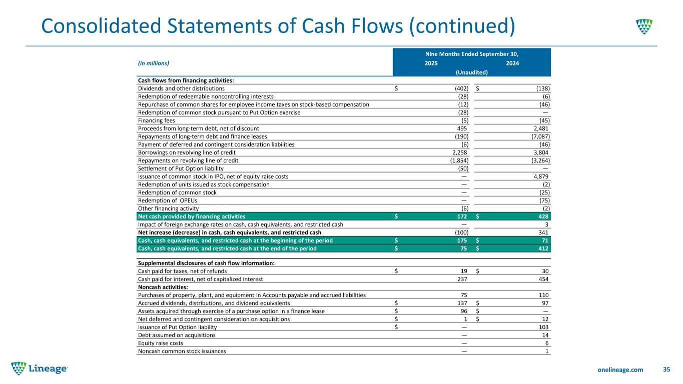 Consolidated Statements of Cash Flows 34 Nine Months Ended September 30, (in millions) 2025 2024 (Unaudited) Cash flows from operating activities: Net income (loss) $ (119) $ (671) Adjustments to reconcile net income (loss) to net cash provided by operating activities: Provision for credit losses 5 3 Impairment of long-lived assets, goodwill, and other intangible assets 31 33 Gain on insurance recovery (51) (29) Depreciation and amortization 666 640 (Gain) loss on extinguishment of debt, net 3 13 Amortization of deferred financing costs, discount, and above/below market debt 8 16 Stock-based compensation 107 171 (Gain) loss on foreign currency transactions, net (36) (5) Deferred income tax (13) (71) Put Options fair value adjustment 30 — (Gain) loss on divestitures, net 58 — Vesting of Class D interests — 185 One-time Internalization expense to Bay Grove — 200 Other operating activities 6 15 Changes in operating assets and liabilities (excluding effects of acquisitions): Accounts receivable (36) 17 Prepaid expenses, other assets, and other long-term liabilities (28) (26) Inventories 20 (4) Accounts payable and accrued liabilities and deferred revenue (24) (51) Right-of-use assets and lease obligations — 10 Net cash provided by operating activities $ 627 $ 446 Cash flows from investing activities: Acquisitions, net of cash acquired (441) (113) Purchase of property, plant, and equipment (509) (486) Proceeds from sale of assets 10 6 Proceeds from insurance recovery on impaired long-lived assets 49 50 Investments in Emergent Cold LatAm Holdings, LLC (9) (13) Proceeds from repayment of notes by related parties — 15 Other investing activity 1 5 Net cash used in investing activities $ (899) $ (536)