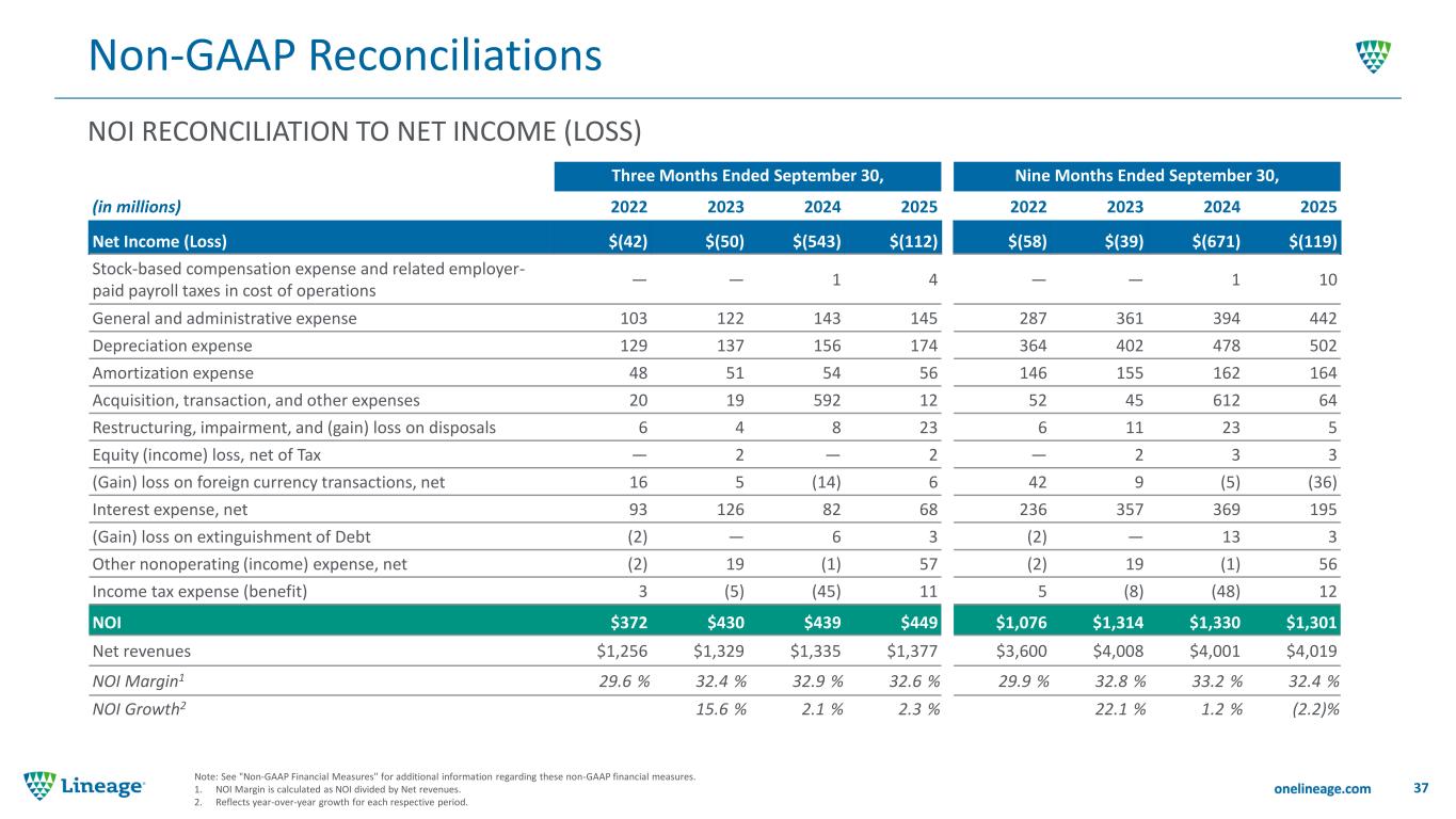NOI RECONCILIATION TO NET INCOME (LOSS) Non-GAAP Reconciliations 37 Note: See "Non-GAAP Financial Measures" for additional information regarding these non-GAAP financial measures. 1. NOI Margin is calculated as NOI divided by Net revenues. 2. Reflects year-over-year growth for each respective period. Three Months Ended September 30, Nine Months Ended September 30, (in millions) 2022 2023 2024 2025 2022 2023 2024 2025 Net Income (Loss) $(42) $(50) $(543) $(112) $(58) $(39) $(671) $(119) Stock-based compensation expense and related employer- paid payroll taxes in cost of operations — — 1 4 — — 1 10 General and administrative expense 103 122 143 145 287 361 394 442 Depreciation expense 129 137 156 174 364 402 478 502 Amortization expense 48 51 54 56 146 155 162 164 Acquisition, transaction, and other expenses 20 19 592 12 52 45 612 64 Restructuring, impairment, and (gain) loss on disposals 6 4 8 23 6 11 23 5 Equity (income) loss, net of Tax — 2 — 2 — 2 3 3 (Gain) loss on foreign currency transactions, net 16 5 (14) 6 42 9 (5) (36) Interest expense, net 93 126 82 68 236 357 369 195 (Gain) loss on extinguishment of Debt (2) — 6 3 (2) — 13 3 Other nonoperating (income) expense, net (2) 19 (1) 57 (2) 19 (1) 56 Income tax expense (benefit) 3 (5) (45) 11 5 (8) (48) 12 NOI $372 $430 $439 $449 $1,076 $1,314 $1,330 $1,301 Net revenues $1,256 $1,329 $1,335 $1,377 $3,600 $4,008 $4,001 $4,019 NOI Margin1 29.6 % 32.4 % 32.9 % 32.6 % 29.9 % 32.8 % 33.2 % 32.4 % NOI Growth2 15.6 % 2.1 % 2.3 % 22.1 % 1.2 % (2.2)%