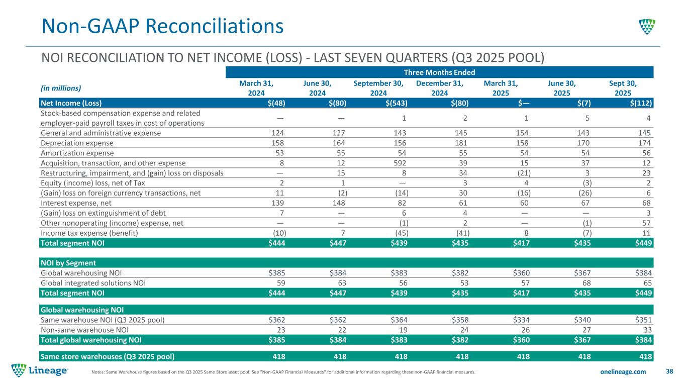 NOI RECONCILIATION TO NET INCOME (LOSS) - LAST SEVEN QUARTERS (Q3 2025 POOL) Non-GAAP Reconciliations 38Notes: Same Warehouse figures based on the Q3 2025 Same Store asset pool. See "Non-GAAP Financial Measures" for additional information regarding these non-GAAP financial measures. Three Months Ended (in millions) March 31, 2024 June 30, 2024 September 30, 2024 December 31, 2024 March 31, 2025 June 30, 2025 Sept 30, 2025 Net Income (Loss) $(48) $(80) $(543) $(80) $— $(7) $(112) Stock-based compensation expense and related employer-paid payroll taxes in cost of operations — — 1 2 1 5 4 General and administrative expense 124 127 143 145 154 143 145 Depreciation expense 158 164 156 181 158 170 174 Amortization expense 53 55 54 55 54 54 56 Acquisition, transaction, and other expense 8 12 592 39 15 37 12 Restructuring, impairment, and (gain) loss on disposals — 15 8 34 (21) 3 23 Equity (income) loss, net of Tax 2 1 — 3 4 (3) 2 (Gain) loss on foreign currency transactions, net 11 (2) (14) 30 (16) (26) 6 Interest expense, net 139 148 82 61 60 67 68 (Gain) loss on extinguishment of debt 7 — 6 4 — — 3 Other nonoperating (income) expense, net — — (1) 2 — (1) 57 Income tax expense (benefit) (10) 7 (45) (41) 8 (7) 11 Total segment NOI $444 $447 $439 $435 $417 $435 $449 NOI by Segment Global warehousing NOI $385 $384 $383 $382 $360 $367 $384 Global integrated solutions NOI 59 63 56 53 57 68 65 Total segment NOI $444 $447 $439 $435 $417 $435 $449 Global warehousing NOI Same warehouse NOI (Q3 2025 pool) $362 $362 $364 $358 $334 $340 $351 Non-same warehouse NOI 23 22 19 24 26 27 33 Total global warehousing NOI $385 $384 $383 $382 $360 $367 $384 Same store warehouses (Q3 2025 pool) 418 418 418 418 418 418 418