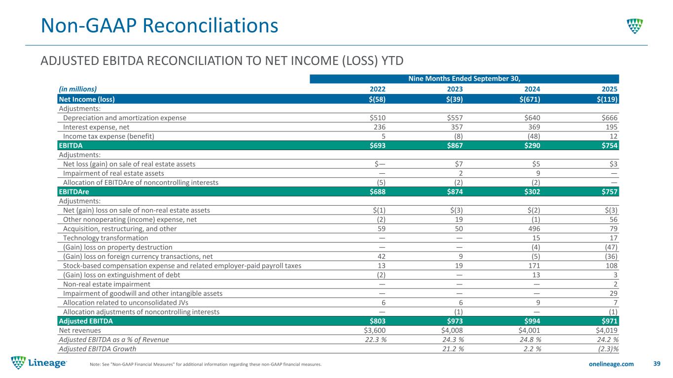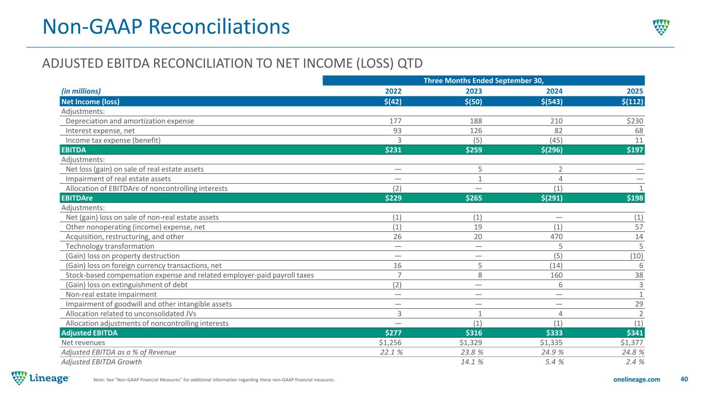 ADJUSTED EBITDA RECONCILIATION TO NET INCOME (LOSS) YTD Non-GAAP Reconciliations 39Note: See "Non-GAAP Financial Measures" for additional information regarding these non-GAAP financial measures. Nine Months Ended September 30, (in millions) 2022 2023 2024 2025 Net Income (loss) $(58) $(39) $(671) $(119) Adjustments: Depreciation and amortization expense $510 $557 $640 $666 Interest expense, net 236 357 369 195 Income tax expense (benefit) 5 (8) (48) 12 EBITDA $693 $867 $290 $754 Adjustments: Net loss (gain) on sale of real estate assets $— $7 $5 $3 Impairment of real estate assets — 2 9 — Allocation of EBITDAre of noncontrolling interests (5) (2) (2) — EBITDAre $688 $874 $302 $757 Adjustments: Net (gain) loss on sale of non-real estate assets $(1) $(3) $(2) $(3) Other nonoperating (income) expense, net (2) 19 (1) 56 Acquisition, restructuring, and other 59 50 496 79 Technology transformation — — 15 17 (Gain) loss on property destruction — — (4) (47) (Gain) loss on foreign currency transactions, net 42 9 (5) (36) Stock-based compensation expense and related employer-paid payroll taxes 13 19 171 108 (Gain) loss on extinguishment of debt (2) — 13 3 Non-real estate impairment — — — 2 Impairment of goodwill and other intangible assets — — — 29 Allocation related to unconsolidated JVs 6 6 9 7 Allocation adjustments of noncontrolling interests — (1) — (1) Adjusted EBITDA $803 $973 $994 $971 Net revenues $3,600 $4,008 $4,001 $4,019 Adjusted EBITDA as a % of Revenue 22.3 % 24.3 % 24.8 % 24.2 % Adjusted EBITDA Growth 21.2 % 2.2 % (2.3)%