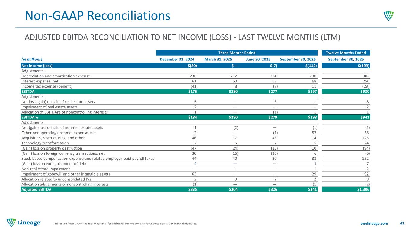 ADJUSTED EBITDA RECONCILIATION TO NET INCOME (LOSS) - LAST TWELVE MONTHS (LTM) Non-GAAP Reconciliations 41Note: See "Non-GAAP Financial Measures" for additional information regarding these non-GAAP financial measures. Three Months Ended Twelve Months Ended (in millions) December 31, 2024 March 31, 2025 June 30, 2025 September 30, 2025 September 30, 2025 Net Income (loss) $(80) $— $(7) $(112) $(199) Adjustments: Depreciation and amortization expense 236 212 224 230 902 Interest expense, net 61 60 67 68 256 Income tax expense (benefit) (41) 8 (7) 11 (29) EBITDA $176 $280 $277 $197 $930 Adjustments: Net loss (gain) on sale of real estate assets 5 — 3 — 8 Impairment of real estate assets 2 — — — 2 Allocation of EBITDAre of noncontrolling interests 1 — (1) 1 1 EBITDAre $184 $280 $279 $198 $941 Adjustments: Net (gain) loss on sale of non-real estate assets 1 (2) — (1) (2) Other nonoperating (income) expense, net 2 — (1) 57 58 Acquisition, restructuring, and other 46 17 48 14 125 Technology transformation 7 5 7 5 24 (Gain) loss on property destruction (47) (24) (13) (10) (94) (Gain) loss on foreign currency transactions, net 30 (16) (26) 6 (6) Stock-based compensation expense and related employer-paid payroll taxes 44 40 30 38 152 (Gain) loss on extinguishment of debt 4 — — 3 7 Non-real estate impairment — 1 — 1 2 Impairment of goodwill and other intangible assets 63 — — 29 92 Allocation related to unconsolidated JVs 2 3 2 2 9 Allocation adjustments of noncontrolling interests (1) — — (1) (2) Adjusted EBITDA $335 $304 $326 $341 $1,306