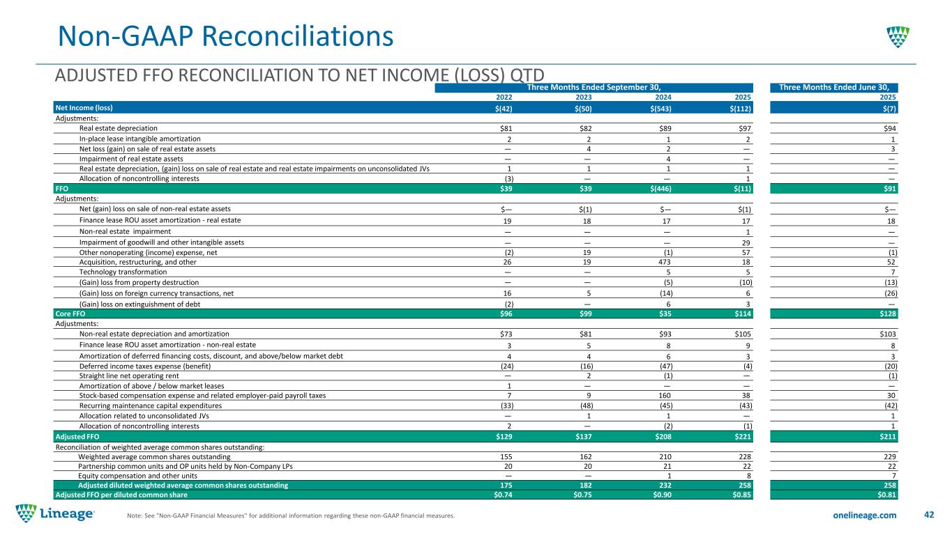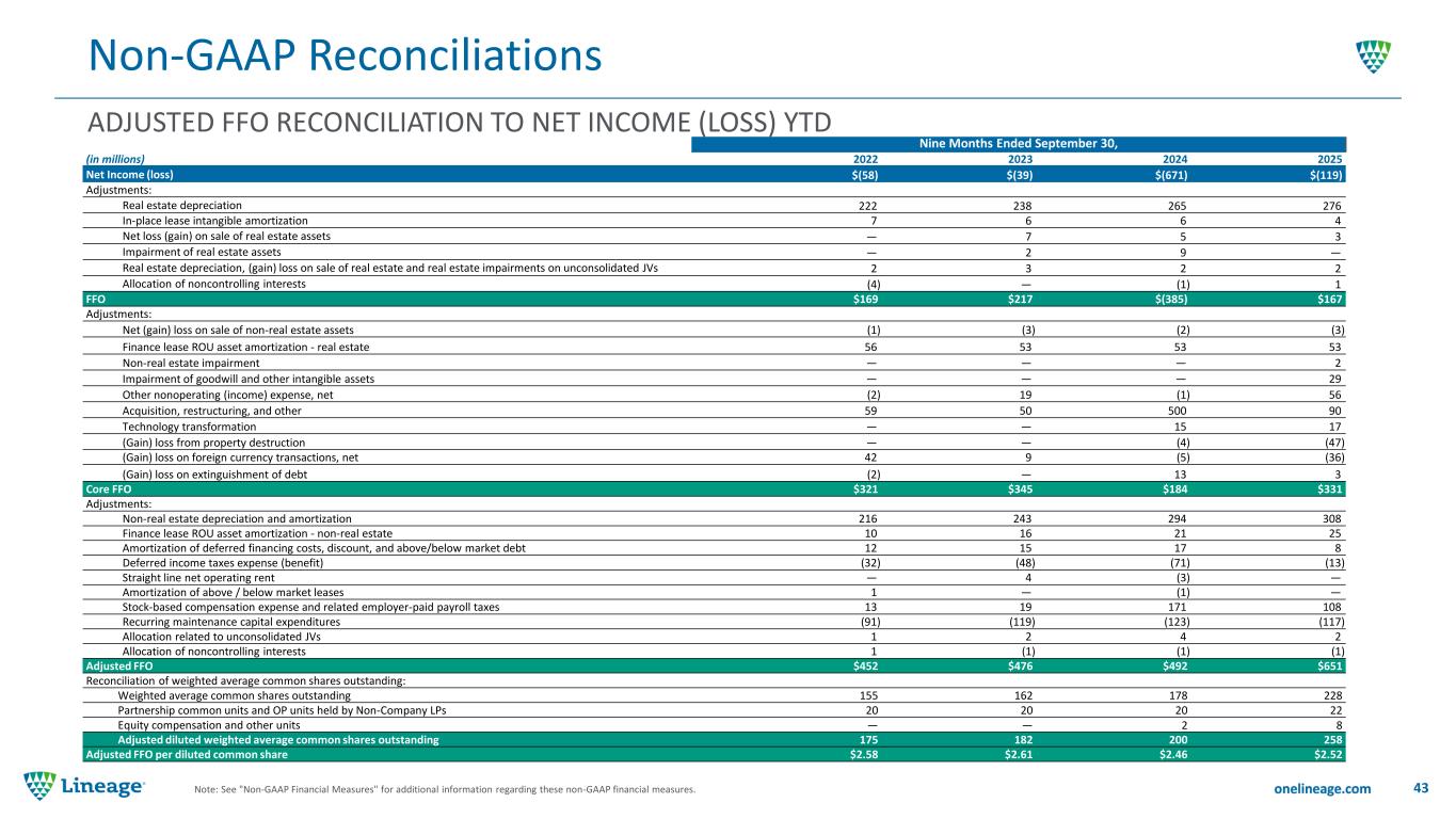 ADJUSTED FFO RECONCILIATION TO NET INCOME (LOSS) QTD Non-GAAP Reconciliations 42Note: See "Non-GAAP Financial Measures" for additional information regarding these non-GAAP financial measures. Three Months Ended September 30, Three Months Ended June 30, 2022 2023 2024 2025 2025 Net Income (loss) $(42) $(50) $(543) $(112) $(7) Adjustments: Real estate depreciation $81 $82 $89 $97 $94 In-place lease intangible amortization 2 2 1 2 1 Net loss (gain) on sale of real estate assets — 4 2 — 3 Impairment of real estate assets — — 4 — — Real estate depreciation, (gain) loss on sale of real estate and real estate impairments on unconsolidated JVs 1 1 1 1 — Allocation of noncontrolling interests (3) — — 1 — FFO $39 $39 $(446) $(11) $91 Adjustments: Net (gain) loss on sale of non-real estate assets $— $(1) $— $(1) $— Finance lease ROU asset amortization - real estate 19 18 17 17 18 Non-real estate impairment — — — 1 — Impairment of goodwill and other intangible assets — — — 29 — Other nonoperating (income) expense, net (2) 19 (1) 57 (1) Acquisition, restructuring, and other 26 19 473 18 52 Technology transformation — — 5 5 7 (Gain) loss from property destruction — — (5) (10) (13) (Gain) loss on foreign currency transactions, net 16 5 (14) 6 (26) (Gain) loss on extinguishment of debt (2) — 6 3 — Core FFO $96 $99 $35 $114 $128 Adjustments: Non-real estate depreciation and amortization $73 $81 $93 $105 $103 Finance lease ROU asset amortization - non-real estate 3 5 8 9 8 Amortization of deferred financing costs, discount, and above/below market debt 4 4 6 3 3 Deferred income taxes expense (benefit) (24) (16) (47) (4) (20) Straight line net operating rent — 2 (1) — (1) Amortization of above / below market leases 1 — — — — Stock-based compensation expense and related employer-paid payroll taxes 7 9 160 38 30 Recurring maintenance capital expenditures (33) (48) (45) (43) (42) Allocation related to unconsolidated JVs — 1 1 — 1 Allocation of noncontrolling interests 2 — (2) (1) 1 Adjusted FFO $129 $137 $208 $221 $211 Reconciliation of weighted average common shares outstanding: Weighted average common shares outstanding 155 162 210 228 229 Partnership common units and OP units held by Non-Company LPs 20 20 21 22 22 Equity compensation and other units — — 1 8 7 Adjusted diluted weighted average common shares outstanding 175 182 232 258 258 Adjusted FFO per diluted common share $0.74 $0.75 $0.90 $0.85 $0.81