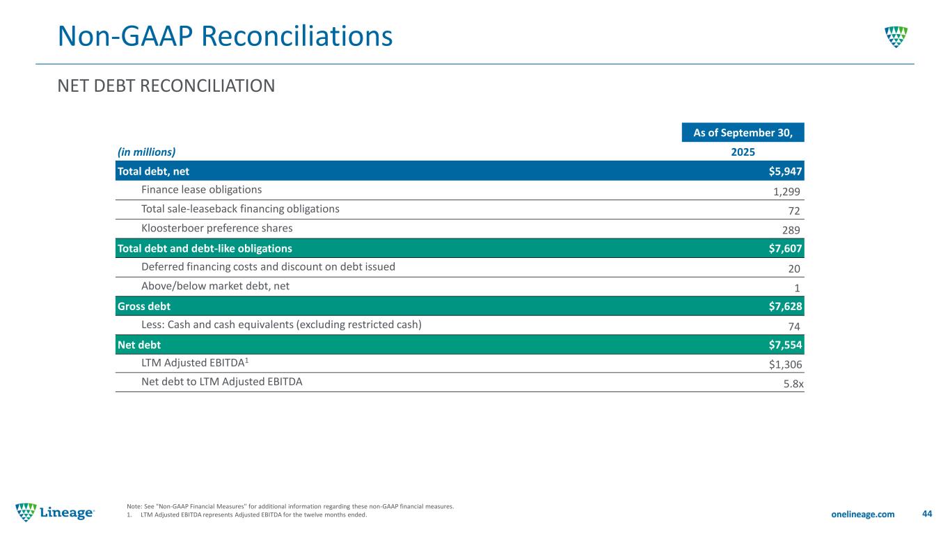 NET DEBT RECONCILIATION Non-GAAP Reconciliations 44 Note: See "Non-GAAP Financial Measures" for additional information regarding these non-GAAP financial measures. 1. LTM Adjusted EBITDA represents Adjusted EBITDA for the twelve months ended. As of September 30, (in millions) 2025 Total debt, net $5,947 Finance lease obligations 1,299 Total sale-leaseback financing obligations 72 Kloosterboer preference shares 289 Total debt and debt-like obligations $7,607 Deferred financing costs and discount on debt issued 20 Above/below market debt, net 1 Gross debt $7,628 Less: Cash and cash equivalents (excluding restricted cash) 74 Net debt $7,554 LTM Adjusted EBITDA1 $1,306 Net debt to LTM Adjusted EBITDA 5.8x