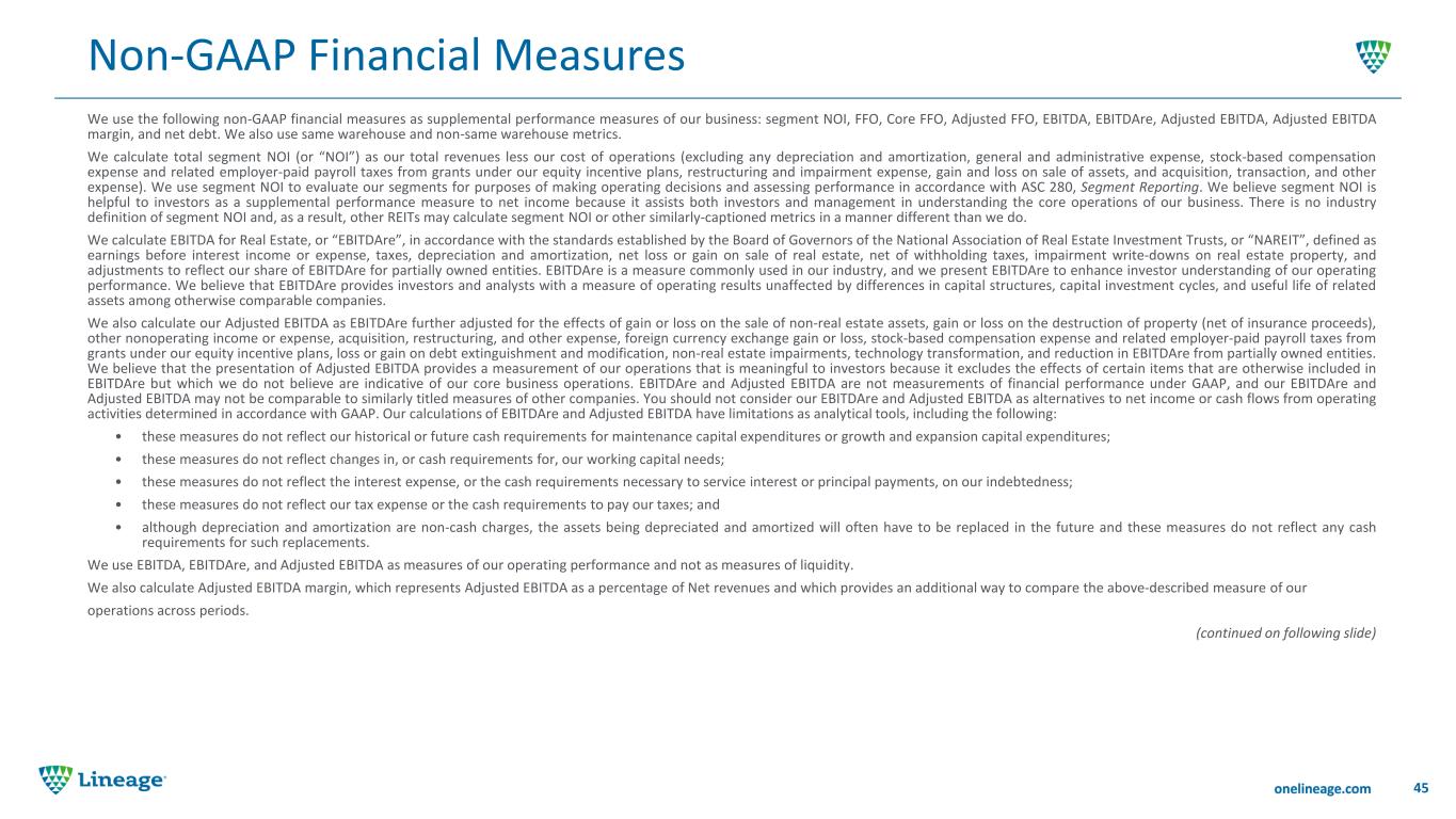 We use the following non-GAAP financial measures as supplemental performance measures of our business: segment NOI, FFO, Core FFO, Adjusted FFO, EBITDA, EBITDAre, Adjusted EBITDA, Adjusted EBITDA margin, and net debt. We also use same warehouse and non-same warehouse metrics. We calculate total segment NOI (or “NOI”) as our total revenues less our cost of operations (excluding any depreciation and amortization, general and administrative expense, stock-based compensation expense and related employer-paid payroll taxes from grants under our equity incentive plans, restructuring and impairment expense, gain and loss on sale of assets, and acquisition, transaction, and other expense). We use segment NOI to evaluate our segments for purposes of making operating decisions and assessing performance in accordance with ASC 280, Segment Reporting. We believe segment NOI is helpful to investors as a supplemental performance measure to net income because it assists both investors and management in understanding the core operations of our business. There is no industry definition of segment NOI and, as a result, other REITs may calculate segment NOI or other similarly-captioned metrics in a manner different than we do. We calculate EBITDA for Real Estate, or “EBITDAre”, in accordance with the standards established by the Board of Governors of the National Association of Real Estate Investment Trusts, or “NAREIT”, defined as earnings before interest income or expense, taxes, depreciation and amortization, net loss or gain on sale of real estate, net of withholding taxes, impairment write-downs on real estate property, and adjustments to reflect our share of EBITDAre for partially owned entities. EBITDAre is a measure commonly used in our industry, and we present EBITDAre to enhance investor understanding of our operating performance. We believe that EBITDAre provides investors and analysts with a measure of operating results unaffected by differences in capital structures, capital investment cycles, and useful life of related assets among otherwise comparable companies. We also calculate our Adjusted EBITDA as EBITDAre further adjusted for the effects of gain or loss on the sale of non-real estate assets, gain or loss on the destruction of property (net of insurance proceeds), other nonoperating income or expense, acquisition, restructuring, and other expense, foreign currency exchange gain or loss, stock-based compensation expense and related employer-paid payroll taxes from grants under our equity incentive plans, loss or gain on debt extinguishment and modification, non-real estate impairments, technology transformation, and reduction in EBITDAre from partially owned entities. We believe that the presentation of Adjusted EBITDA provides a measurement of our operations that is meaningful to investors because it excludes the effects of certain items that are otherwise included in EBITDAre but which we do not believe are indicative of our core business operations. EBITDAre and Adjusted EBITDA are not measurements of financial performance under GAAP, and our EBITDAre and Adjusted EBITDA may not be comparable to similarly titled measures of other companies. You should not consider our EBITDAre and Adjusted EBITDA as alternatives to net income or cash flows from operating activities determined in accordance with GAAP. Our calculations of EBITDAre and Adjusted EBITDA have limitations as analytical tools, including the following: • these measures do not reflect our historical or future cash requirements for maintenance capital expenditures or growth and expansion capital expenditures; • these measures do not reflect changes in, or cash requirements for, our working capital needs; • these measures do not reflect the interest expense, or the cash requirements necessary to service interest or principal payments, on our indebtedness; • these measures do not reflect our tax expense or the cash requirements to pay our taxes; and • although depreciation and amortization are non-cash charges, the assets being depreciated and amortized will often have to be replaced in the future and these measures do not reflect any cash requirements for such replacements. We use EBITDA, EBITDAre, and Adjusted EBITDA as measures of our operating performance and not as measures of liquidity. We also calculate Adjusted EBITDA margin, which represents Adjusted EBITDA as a percentage of Net revenues and which provides an additional way to compare the above-described measure of our operations across periods. (continued on following slide) Non-GAAP Financial Measures 45