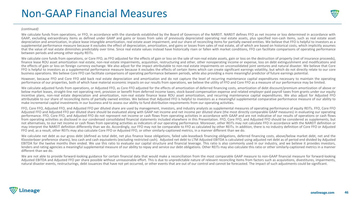 (continued) We calculate funds from operations, or FFO, in accordance with the standards established by the Board of Governors of the NAREIT. NAREIT defines FFO as net income or loss determined in accordance with GAAP, excluding extraordinary items as defined under GAAP and gains or losses from sales of previously depreciated operating real estate assets, plus specified non-cash items, such as real estate asset depreciation and amortization, in-place lease intangible amortization, real estate asset impairment, and our share of reconciling items for partially owned entities. We believe that FFO is helpful to investors as a supplemental performance measure because it excludes the effect of depreciation, amortization, and gains or losses from sales of real estate, all of which are based on historical costs, which implicitly assumes that the value of real estate diminishes predictably over time. Since real estate values instead have historically risen or fallen with market conditions, FFO can facilitate comparisons of operating performance between periods and among other equity REITs. We calculate core funds from operations, or Core FFO, as FFO adjusted for the effects of gain or loss on the sale of non-real estate assets, gain or loss on the destruction of property (net of insurance proceeds), finance lease ROU asset amortization real estate, non-real estate impairments, acquisition, restructuring and other, other nonoperating income or expense, loss on debt extinguishment and modifications and the effects of gain or loss on foreign currency exchange. We also adjust for the impact attributable to non-real estate impairments on unconsolidated joint ventures and natural disaster. We believe that Core FFO is helpful to investors as a supplemental performance measure because it excludes the effects of certain items which can create significant earnings volatility, but which do not directly relate to our core business operations. We believe Core FFO can facilitate comparisons of operating performance between periods, while also providing a more meaningful predictor of future earnings potential. However, because FFO and Core FFO add back real estate depreciation and amortization and do not capture the level of recurring maintenance capital expenditures necessary to maintain the operating performance of our properties, both of which have material economic impacts on our results from operations, we believe the utility of FFO and Core FFO as a measure of our performance may be limited. We calculate adjusted funds from operations, or Adjusted FFO, as Core FFO adjusted for the effects of amortization of deferred financing costs, amortization of debt discount/premium amortization of above or below market leases, straight-line net operating rent, provision or benefit from deferred income taxes, stock-based compensation expense and related employer-paid payroll taxes from grants under our equity incentive plans, non-real estate depreciation and amortization, non-real estate finance lease ROU asset amortization, and recurring maintenance capital expenditures. We also adjust for Adjusted FFO attributable to our share of reconciling items of partially owned entities. We believe that Adjusted FFO is helpful to investors as a meaningful supplemental comparative performance measure of our ability to make incremental capital investments in our business and to assess our ability to fund distribution requirements from our operating activities. FFO, Core FFO, Adjusted FFO, and Adjusted FFO per diluted share are used by management, investors, and industry analysts as supplemental measures of operating performance of equity REITs. FFO, Core FFO Adjusted FFO and Adjusted FFO per diluted share should be evaluated along with GAAP net income and net income per diluted share (the most directly comparable GAAP measures) in evaluating our operating performance. FFO, Core FFO, and Adjusted FFO do not represent net income or cash flows from operating activities in accordance with GAAP and are not indicative of our results of operations or cash flows from operating activities as disclosed in our condensed consolidated financial statements included elsewhere in this Presentation. FFO, Core FFO, and Adjusted FFO should be considered as supplements, but not alternatives, to our net income or cash flows from operating activities as indicators of our operating performance. Moreover, other REITs may not calculate FFO in accordance with the NAREIT definition or may interpret the NAREIT definition differently than we do. Accordingly, our FFO may not be comparable to FFO as calculated by other REITs. In addition, there is no industry definition of Core FFO or Adjusted FFO and, as a result, other REITs may also calculate Core FFO or Adjusted FFO, or other similarly-captioned metrics, in a manner different than we do. We calculate net debt as our gross debt (defined as total debt, net plus finance lease obligations, failed sale-leaseback financing obligations, deferred financing costs, above/below market debt, net and the Kloosterboer preference shares), less cash and cash equivalents (excluding restricted cash). Adjusted net debt to LTM Adjusted EBITDA is calculated using adjusted net debt as of period end divided by Adjusted EBITDA for the twelve months then ended. We use this ratio to evaluate our capital structure and financial leverage. This ratio is also commonly used in our industry, and we believe it provides investors, lenders and rating agencies a meaningful supplemental measure of our ability to repay and service our debt obligations. Other REITs may also calculate this ratio or other similarly-captioned metrics in a manner different than we do. We are not able to provide forward-looking guidance for certain financial data that would make a reconciliation from the most comparable GAAP measure to non-GAAP financial measure for forward-looking Adjusted EBITDA and Adjusted FFO per share possible without unreasonable effort. This