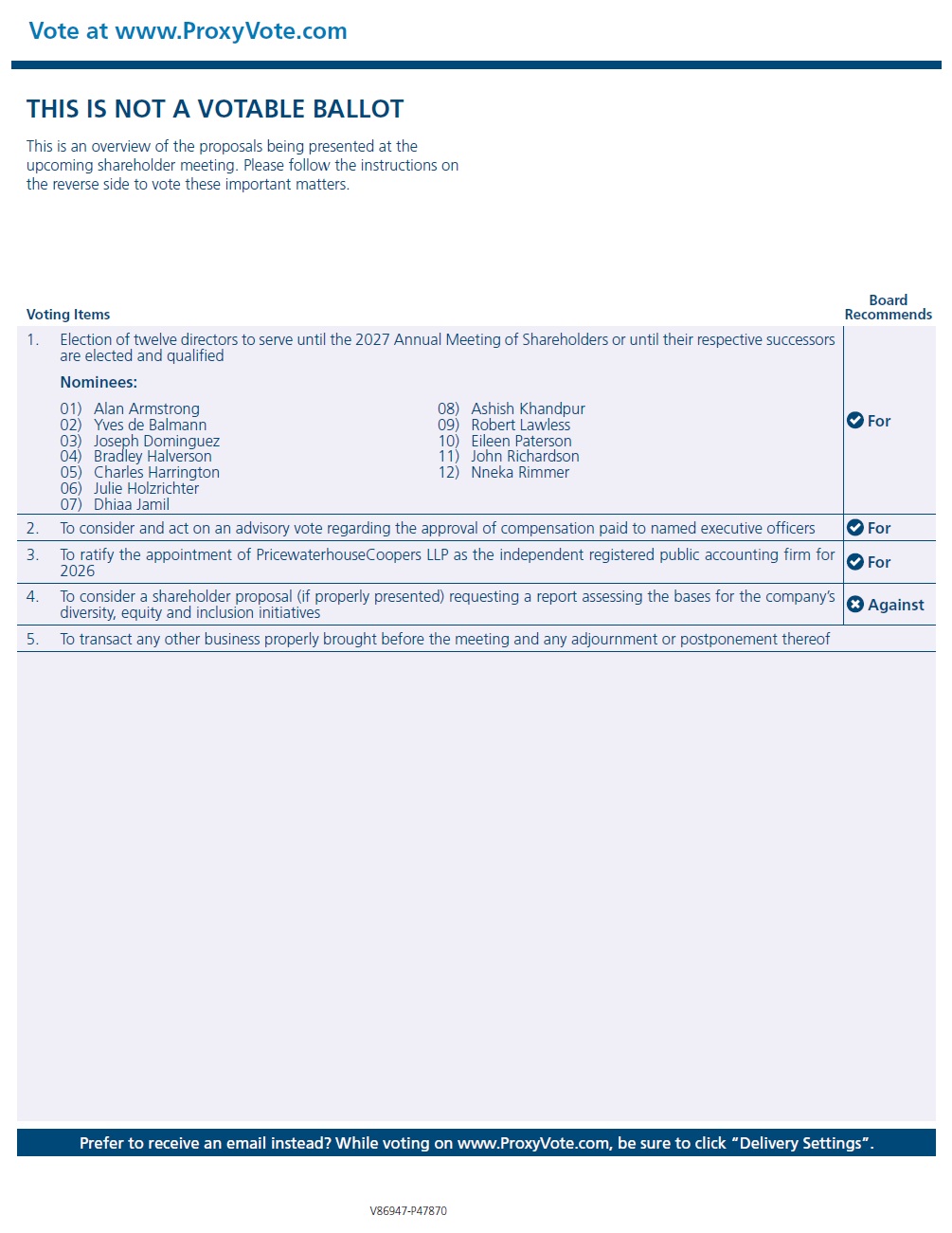 Vote at www.ProxyVote.com Prefer to receive an email instead? While voting on www.ProxyVote.com, be sure to click “Delivery Settings”. Voting Items Board Recommends V86947-P47870 THIS IS NOT A VOTABLE BALLOT This is an overview of the proposals being presented at the upcoming shareholder meeting. Please follow the instructions on the reverse side to vote these important matters. 1. Election of twelve directors to serve until the 2027 Annual Meeting of Shareholders or until their respective successors are elected and qualified For Nominees: 01) Alan Armstrong 02) Yves de Balmann 03) Joseph Dominguez 04) Bradley Halverson 05) Charles Harrington 06) Julie Holzrichter 07) Dhiaa Jamil 08) Ashish Khandpur 09) Robert Lawless 10) Eileen Paterson 11) John Richardson 12) Nneka Rimmer 2. To consider and act on an advisory vote regarding the approval of compensation paid to named executive officers For 3. To ratify the appointment of PricewaterhouseCoopers LLP as the independent registered public accounting firm for 2026 For 4. To consider a shareholder proposal (if properly presented) requesting a report assessing the bases for the company’s diversity, equity and inclusion initiatives Against 5. To transact any other business properly brought before the meeting and any adjournment or postponement thereof
