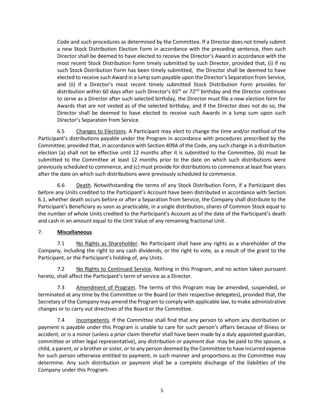 5 Code and such procedures as determined by the Committee. If a Director does not timely submit a new Stock Distribution Election Form in accordance with the preceding sentence, then such Director shall be deemed to have elected to receive the Director’s Award in accordance with the most recent Stock Distribution Form timely submitted by such Director, provided that, (i) if no such Stock Distribution Form has been timely submitted, the Director shall be deemed to have elected to receive such Award in a lump sum payable upon the Director’s Separation from Service, and (ii) if a Director’s most recent timely submitted Stock Distribution Form provides for distribution within 60 days after such Director’s 65th or 72nd birthday and the Director continues to serve as a Director after such selected birthday, the Director must file a new election form for Awards that are not vested as of the selected birthday, and if the Director does not do so, the Director shall be deemed to have elected to receive such Awards in a lump sum upon such Director’s Separation from Service. 6.5 Changes to Elections. A Participant may elect to change the time and/or method of the Participant’s distributions payable under the Program in accordance with procedures prescribed by the Committee; provided that, in accordance with Section 409A of the Code, any such change in a distribution election (a) shall not be effective until 12 months after it is submitted to the Committee, (b) must be submitted to the Committee at least 12 months prior to the date on which such distributions were previously scheduled to commence, and (c) must provide for distributions to commence at least five years after the date on which such distributions were previously scheduled to commence. 6.6 Death. Notwithstanding the terms of any Stock Distribution Form, if a Participant dies before any Units credited to the Participant’s Account have been distributed in accordance with Section 6.1, whether death occurs before or after a Separation from Service, the Company shall distribute to the Participant’s Beneficiary as soon as practicable, in a single distribution, shares of Common Stock equal to the number of whole Units credited to the Participant’s Account as of the date of the Participant’s death and cash in an amount equal to the Unit Value of any remaining fractional Unit. 7. Miscellaneous. 7.1 No Rights as Shareholder. No Participant shall have any rights as a shareholder of the Company, including the right to any cash dividends, or the right to vote, as a result of the grant to the Participant, or the Participant’s holding of, any Units. 7.2 No Rights to Continued Service. Nothing in this Program, and no action taken pursuant hereto, shall affect the Participant’s term of service as a Director. 7.3 Amendment of Program. The terms of this Program may be amended, suspended, or terminated at any time by the Committee or the Board (or their respective delegates), provided that, the Secretary of the Company may amend the Program to comply with applicable law, to make administrative changes or to carry out directives of the Board or the Committee. 7.4 Incompetents. If the Committee shall find that any person to whom any distribution or payment is payable under this Program is unable to care for such person’s affairs because of illness or accident, or is a minor (unless a prior claim therefor shall have been made by a duly appointed guardian, committee or other legal representative), any distribution or payment due may be paid to the spouse, a child, a parent, or a brother or sister, or to any person deemed by the Committee to have incurred expense for such person otherwise entitled to payment, in such manner and proportions as the Committee may determine. Any such distribution or payment shall be a complete discharge of the liabilities of the Company under this Program.