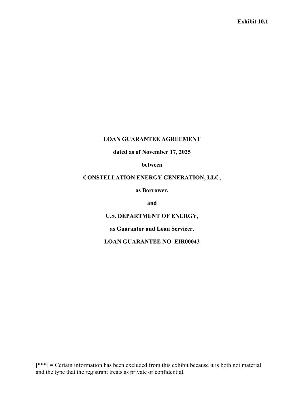Exhibit 10.1 [***] = Certain information has been excluded from this exhibit because it is both not material and the type that the registrant treats as private or confidential. LOAN GUARANTEE AGREEMENT dated as of November 17, 2025 between CONSTELLATION ENERGY GENERATION, LLC, as Borrower, and U.S. DEPARTMENT OF ENERGY, as Guarantor and Loan Servicer, LOAN GUARANTEE NO. EIR00043
