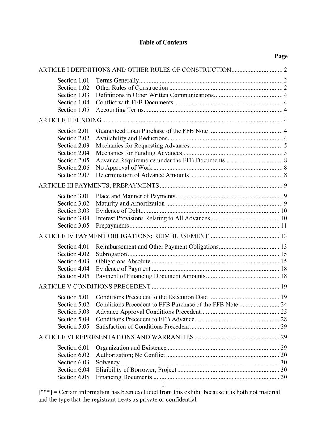 i [***] = Certain information has been excluded from this exhibit because it is both not material and the type that the registrant treats as private or confidential. Table of Contents Page ARTICLE I DEFINITIONS AND OTHER RULES OF CONSTRUCTION ................................ 2 Section 1.01 Terms Generally.......................................................................................... 2 Section 1.02 Other Rules of Construction ....................................................................... 2 Section 1.03 Definitions in Other Written Communications ........................................... 4 Section 1.04 Conflict with FFB Documents .................................................................... 4 Section 1.05 Accounting Terms ....................................................................................... 4 ARTICLE II FUNDING ................................................................................................................. 4 Section 2.01 Guaranteed Loan Purchase of the FFB Note .............................................. 4 Section 2.02 Availability and Reductions ........................................................................ 4 Section 2.03 Mechanics for Requesting Advances .......................................................... 5 Section 2.04 Mechanics for Funding Advances .............................................................. 5 Section 2.05 Advance Requirements under the FFB Documents .................................... 8 Section 2.06 No Approval of Work ................................................................................. 8 Section 2.07 Determination of Advance Amounts .......................................................... 8 ARTICLE III PAYMENTS; PREPAYMENTS ............................................................................. 9 Section 3.01 Place and Manner of Payments ................................................................... 9 Section 3.02 Maturity and Amortization ......................................................................... 9 Section 3.03 Evidence of Debt....................................................................................... 10 Section 3.04 Interest Provisions Relating to All Advances ........................................... 10 Section 3.05 Prepayments .............................................................................................. 11 ARTICLE IV PAYMENT OBLIGATIONS; REIMBURSEMENT ............................................ 13 Section 4.01 Reimbursement and Other Payment Obligations. ..................................... 13 Section 4.02 Subrogation ............................................................................................... 15 Section 4.03 Obligations Absolute ................................................................................ 15 Section 4.04 Evidence of Payment ................................................................................ 18 Section 4.05 Payment of Financing Document Amounts .............................................. 18 ARTICLE V CONDITIONS PRECEDENT ................................................................................ 19 Section 5.01 Conditions Precedent to the Execution Date ............................................ 19 Section 5.02 Conditions Precedent to FFB Purchase of the FFB Note ......................... 24 Section 5.03 Advance Approval Conditions Precedent ................................................. 25 Section 5.04 Conditions Precedent to FFB Advance ..................................................... 28 Section 5.05 Satisfaction of Conditions Precedent ........................................................ 29 ARTICLE VI REPRESENTATIONS AND WARRANTIES ..................................................... 29 Section 6.01 Organization and Existence ...................................................................... 29 Section 6.02 Authorization; No Conflict ....................................................................... 30 Section 6.03 Solvency .................................................................................................... 30 Section 6.04 Eligibility of Borrower; Project ................................................................ 30 Section 6.05 Financing Documents ............................................................................... 30
