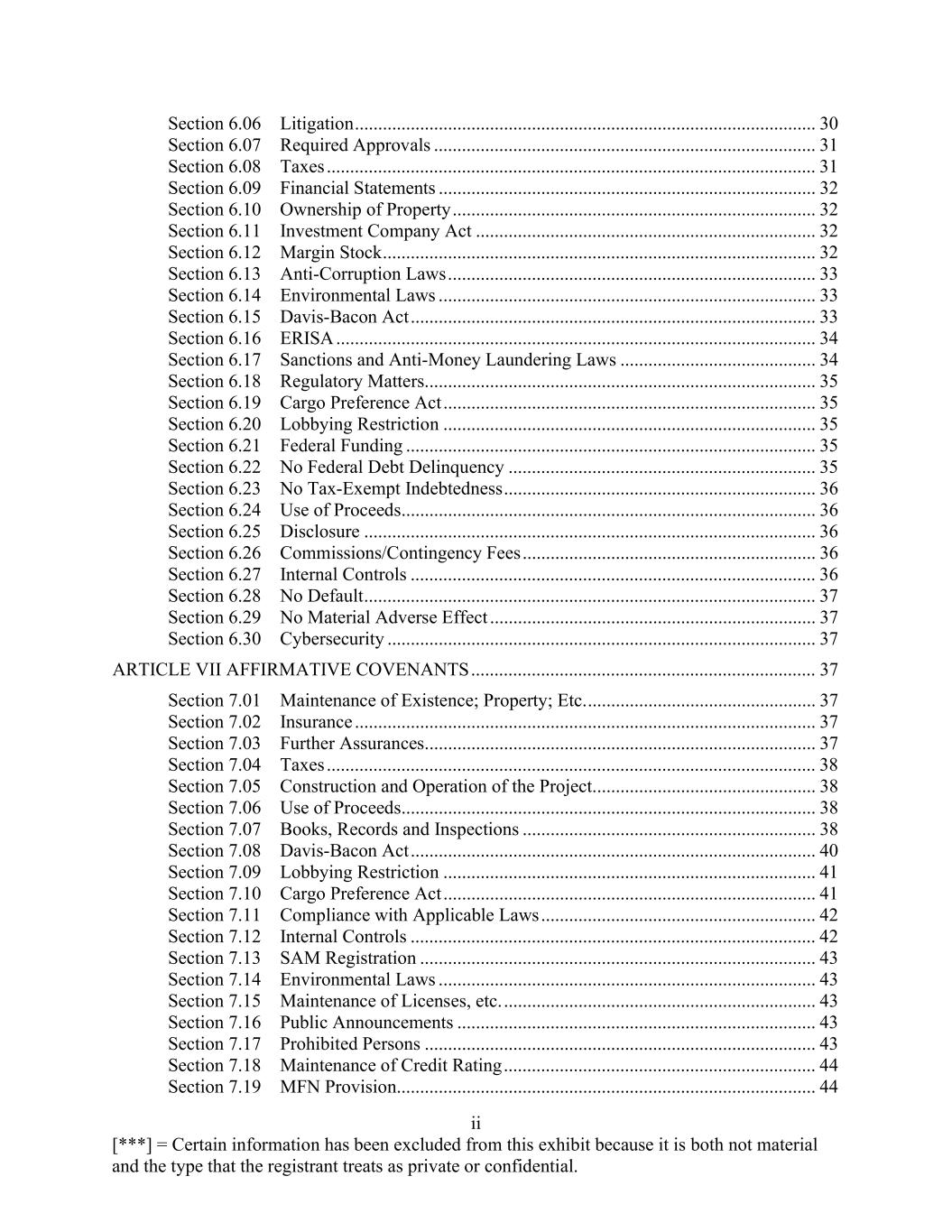 ii [***] = Certain information has been excluded from this exhibit because it is both not material and the type that the registrant treats as private or confidential. Section 6.06 Litigation ................................................................................................... 30 Section 6.07 Required Approvals .................................................................................. 31 Section 6.08 Taxes ......................................................................................................... 31 Section 6.09 Financial Statements ................................................................................. 32 Section 6.10 Ownership of Property .............................................................................. 32 Section 6.11 Investment Company Act ......................................................................... 32 Section 6.12 Margin Stock ............................................................................................. 32 Section 6.13 Anti-Corruption Laws ............................................................................... 33 Section 6.14 Environmental Laws ................................................................................. 33 Section 6.15 Davis-Bacon Act ....................................................................................... 33 Section 6.16 ERISA ....................................................................................................... 34 Section 6.17 Sanctions and Anti-Money Laundering Laws .......................................... 34 Section 6.18 Regulatory Matters.................................................................................... 35 Section 6.19 Cargo Preference Act ................................................................................ 35 Section 6.20 Lobbying Restriction ................................................................................ 35 Section 6.21 Federal Funding ........................................................................................ 35 Section 6.22 No Federal Debt Delinquency .................................................................. 35 Section 6.23 No Tax-Exempt Indebtedness ................................................................... 36 Section 6.24 Use of Proceeds......................................................................................... 36 Section 6.25 Disclosure ................................................................................................. 36 Section 6.26 Commissions/Contingency Fees ............................................................... 36 Section 6.27 Internal Controls ....................................................................................... 36 Section 6.28 No Default ................................................................................................. 37 Section 6.29 No Material Adverse Effect ...................................................................... 37 Section 6.30 Cybersecurity ............................................................................................ 37 ARTICLE VII AFFIRMATIVE COVENANTS .......................................................................... 37 Section 7.01 Maintenance of Existence; Property; Etc. ................................................. 37 Section 7.02 Insurance ................................................................................................... 37 Section 7.03 Further Assurances.................................................................................... 37 Section 7.04 Taxes ......................................................................................................... 38 Section 7.05 Construction and Operation of the Project................................................ 38 Section 7.06 Use of Proceeds......................................................................................... 38 Section 7.07 Books, Records and Inspections ............................................................... 38 Section 7.08 Davis-Bacon Act ....................................................................................... 40 Section 7.09 Lobbying Restriction ................................................................................ 41 Section 7.10 Cargo Preference Act ................................................................................ 41 Section 7.11 Compliance with Applicable Laws ........................................................... 42 Section 7.12 Internal Controls ....................................................................................... 42 Section 7.13 SAM Registration ..................................................................................... 43 Section 7.14 Environmental Laws ................................................................................. 43 Section 7.15 Maintenance of Licenses, etc. ................................................................... 43 Section 7.16 Public Announcements ............................................................................. 43 Section 7.17 Prohibited Persons .................................................................................... 43 Section 7.18 Maintenance of Credit Rating ................................................................... 44 Section 7.19 MFN Provision.......................................................................................... 44