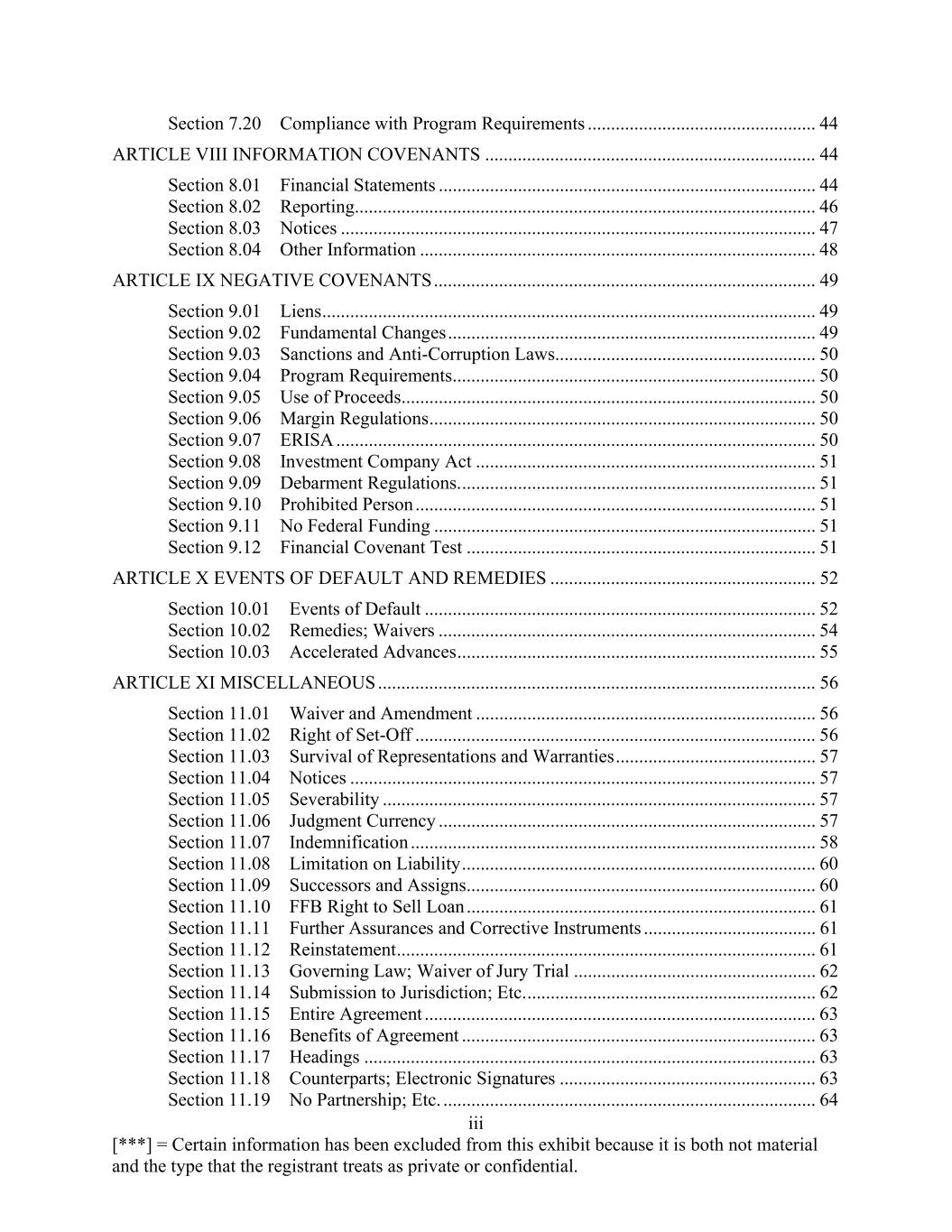 iii [***] = Certain information has been excluded from this exhibit because it is both not material and the type that the registrant treats as private or confidential. Section 7.20 Compliance with Program Requirements ................................................. 44 ARTICLE VIII INFORMATION COVENANTS ....................................................................... 44 Section 8.01 Financial Statements ................................................................................. 44 Section 8.02 Reporting................................................................................................... 46 Section 8.03 Notices ...................................................................................................... 47 Section 8.04 Other Information ..................................................................................... 48 ARTICLE IX NEGATIVE COVENANTS .................................................................................. 49 Section 9.01 Liens .......................................................................................................... 49 Section 9.02 Fundamental Changes ............................................................................... 49 Section 9.03 Sanctions and Anti-Corruption Laws........................................................ 50 Section 9.04 Program Requirements.............................................................................. 50 Section 9.05 Use of Proceeds......................................................................................... 50 Section 9.06 Margin Regulations ................................................................................... 50 Section 9.07 ERISA ....................................................................................................... 50 Section 9.08 Investment Company Act ......................................................................... 51 Section 9.09 Debarment Regulations. ............................................................................ 51 Section 9.10 Prohibited Person ...................................................................................... 51 Section 9.11 No Federal Funding .................................................................................. 51 Section 9.12 Financial Covenant Test ........................................................................... 51 ARTICLE X EVENTS OF DEFAULT AND REMEDIES ......................................................... 52 Section 10.01 Events of Default .................................................................................... 52 Section 10.02 Remedies; Waivers ................................................................................. 54 Section 10.03 Accelerated Advances ............................................................................. 55 ARTICLE XI MISCELLANEOUS .............................................................................................. 56 Section 11.01 Waiver and Amendment ......................................................................... 56 Section 11.02 Right of Set-Off ...................................................................................... 56 Section 11.03 Survival of Representations and Warranties ........................................... 57 Section 11.04 Notices .................................................................................................... 57 Section 11.05 Severability ............................................................................................. 57 Section 11.06 Judgment Currency ................................................................................. 57 Section 11.07 Indemnification ....................................................................................... 58 Section 11.08 Limitation on Liability ............................................................................ 60 Section 11.09 Successors and Assigns........................................................................... 60 Section 11.10 FFB Right to Sell Loan ........................................................................... 61 Section 11.11 Further Assurances and Corrective Instruments ..................................... 61 Section 11.12 Reinstatement .......................................................................................... 61 Section 11.13 Governing Law; Waiver of Jury Trial .................................................... 62 Section 11.14 Submission to Jurisdiction; Etc. .............................................................. 62 Section 11.15 Entire Agreement .................................................................................... 63 Section 11.16 Benefits of Agreement ............................................................................ 63 Section 11.17 Headings ................................................................................................. 63 Section 11.18 Counterparts; Electronic Signatures ....................................................... 63 Section 11.19 No Partnership; Etc. ................................................................................ 64