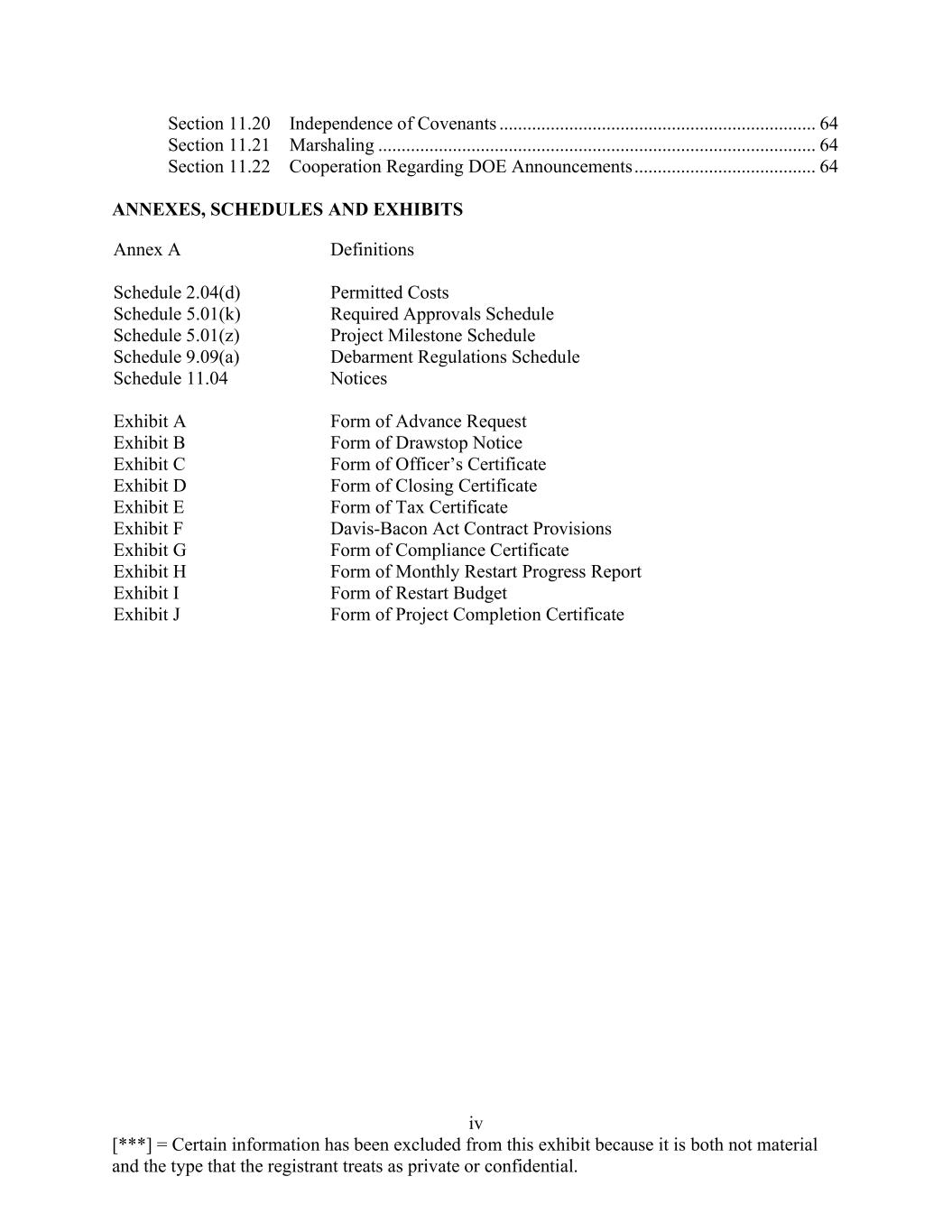 iv [***] = Certain information has been excluded from this exhibit because it is both not material and the type that the registrant treats as private or confidential. Section 11.20 Independence of Covenants .................................................................... 64 Section 11.21 Marshaling .............................................................................................. 64 Section 11.22 Cooperation Regarding DOE Announcements ....................................... 64 ANNEXES, SCHEDULES AND EXHIBITS Annex A Definitions Schedule 2.04(d) Permitted Costs Schedule 5.01(k) Required Approvals Schedule Schedule 5.01(z) Project Milestone Schedule Schedule 9.09(a) Debarment Regulations Schedule Schedule 11.04 Notices Exhibit A Form of Advance Request Exhibit B Form of Drawstop Notice Exhibit C Form of Officer’s Certificate Exhibit D Form of Closing Certificate Exhibit E Form of Tax Certificate Exhibit F Davis-Bacon Act Contract Provisions Exhibit G Form of Compliance Certificate Exhibit H Form of Monthly Restart Progress Report Exhibit I Form of Restart Budget Exhibit J Form of Project Completion Certificate