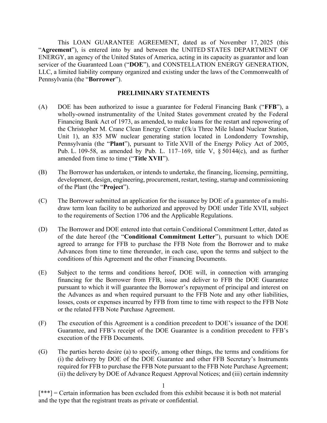 1 [***] = Certain information has been excluded from this exhibit because it is both not material and the type that the registrant treats as private or confidential. This LOAN GUARANTEE AGREEMENT, dated as of November 17, 2025 (this “Agreement”), is entered into by and between the UNITED STATES DEPARTMENT OF ENERGY, an agency of the United States of America, acting in its capacity as guarantor and loan servicer of the Guaranteed Loan (“DOE”), and CONSTELLATION ENERGY GENERATION, LLC, a limited liability company organized and existing under the laws of the Commonwealth of Pennsylvania (the “Borrower”). PRELIMINARY STATEMENTS (A) DOE has been authorized to issue a guarantee for Federal Financing Bank (“FFB”), a wholly-owned instrumentality of the United States government created by the Federal Financing Bank Act of 1973, as amended, to make loans for the restart and repowering of the Christopher M. Crane Clean Energy Center (f/k/a Three Mile Island Nuclear Station, Unit 1), an 835 MW nuclear generating station located in Londonderry Township, Pennsylvania (the “Plant”), pursuant to Title XVII of the Energy Policy Act of 2005, Pub. L. 109-58, as amended by Pub. L. 117–169, title V, § 50144(c), and as further amended from time to time (“Title XVII”). (B) The Borrower has undertaken, or intends to undertake, the financing, licensing, permitting, development, design, engineering, procurement, restart, testing, startup and commissioning of the Plant (the “Project”). (C) The Borrower submitted an application for the issuance by DOE of a guarantee of a multi- draw term loan facility to be authorized and approved by DOE under Title XVII, subject to the requirements of Section 1706 and the Applicable Regulations. (D) The Borrower and DOE entered into that certain Conditional Commitment Letter, dated as of the date hereof (the “Conditional Commitment Letter”), pursuant to which DOE agreed to arrange for FFB to purchase the FFB Note from the Borrower and to make Advances from time to time thereunder, in each case, upon the terms and subject to the conditions of this Agreement and the other Financing Documents. (E) Subject to the terms and conditions hereof, DOE will, in connection with arranging financing for the Borrower from FFB, issue and deliver to FFB the DOE Guarantee pursuant to which it will guarantee the Borrower’s repayment of principal and interest on the Advances as and when required pursuant to the FFB Note and any other liabilities, losses, costs or expenses incurred by FFB from time to time with respect to the FFB Note or the related FFB Note Purchase Agreement. (F) The execution of this Agreement is a condition precedent to DOE’s issuance of the DOE Guarantee, and FFB’s receipt of the DOE Guarantee is a condition precedent to FFB’s execution of the FFB Documents. (G) The parties hereto desire (a) to specify, among other things, the terms and conditions for (i) the delivery by DOE of the DOE Guarantee and other FFB Secretary’s Instruments required for FFB to purchase the FFB Note pursuant to the FFB Note Purchase Agreement; (ii) the delivery by DOE of Advance Request Approval Notices; and (iii) certain indemnity