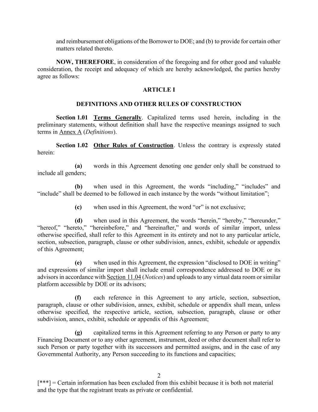 2 [***] = Certain information has been excluded from this exhibit because it is both not material and the type that the registrant treats as private or confidential. and reimbursement obligations of the Borrower to DOE; and (b) to provide for certain other matters related thereto. NOW, THEREFORE, in consideration of the foregoing and for other good and valuable consideration, the receipt and adequacy of which are hereby acknowledged, the parties hereby agree as follows: ARTICLE I DEFINITIONS AND OTHER RULES OF CONSTRUCTION Section 1.01 Terms Generally. Capitalized terms used herein, including in the preliminary statements, without definition shall have the respective meanings assigned to such terms in Annex A (Definitions). Section 1.02 Other Rules of Construction. Unless the contrary is expressly stated herein: (a) words in this Agreement denoting one gender only shall be construed to include all genders; (b) when used in this Agreement, the words “including,” “includes” and “include” shall be deemed to be followed in each instance by the words “without limitation”; (c) when used in this Agreement, the word “or” is not exclusive; (d) when used in this Agreement, the words “herein,” “hereby,” “hereunder,” “hereof,” “hereto,” “hereinbefore,” and “hereinafter,” and words of similar import, unless otherwise specified, shall refer to this Agreement in its entirety and not to any particular article, section, subsection, paragraph, clause or other subdivision, annex, exhibit, schedule or appendix of this Agreement; (e) when used in this Agreement, the expression “disclosed to DOE in writing” and expressions of similar import shall include email correspondence addressed to DOE or its advisors in accordance with Section 11.04 (Notices) and uploads to any virtual data room or similar platform accessible by DOE or its advisors; (f) each reference in this Agreement to any article, section, subsection, paragraph, clause or other subdivision, annex, exhibit, schedule or appendix shall mean, unless otherwise specified, the respective article, section, subsection, paragraph, clause or other subdivision, annex, exhibit, schedule or appendix of this Agreement; (g) capitalized terms in this Agreement referring to any Person or party to any Financing Document or to any other agreement, instrument, deed or other document shall refer to such Person or party together with its successors and permitted assigns, and in the case of any Governmental Authority, any Person succeeding to its functions and capacities;