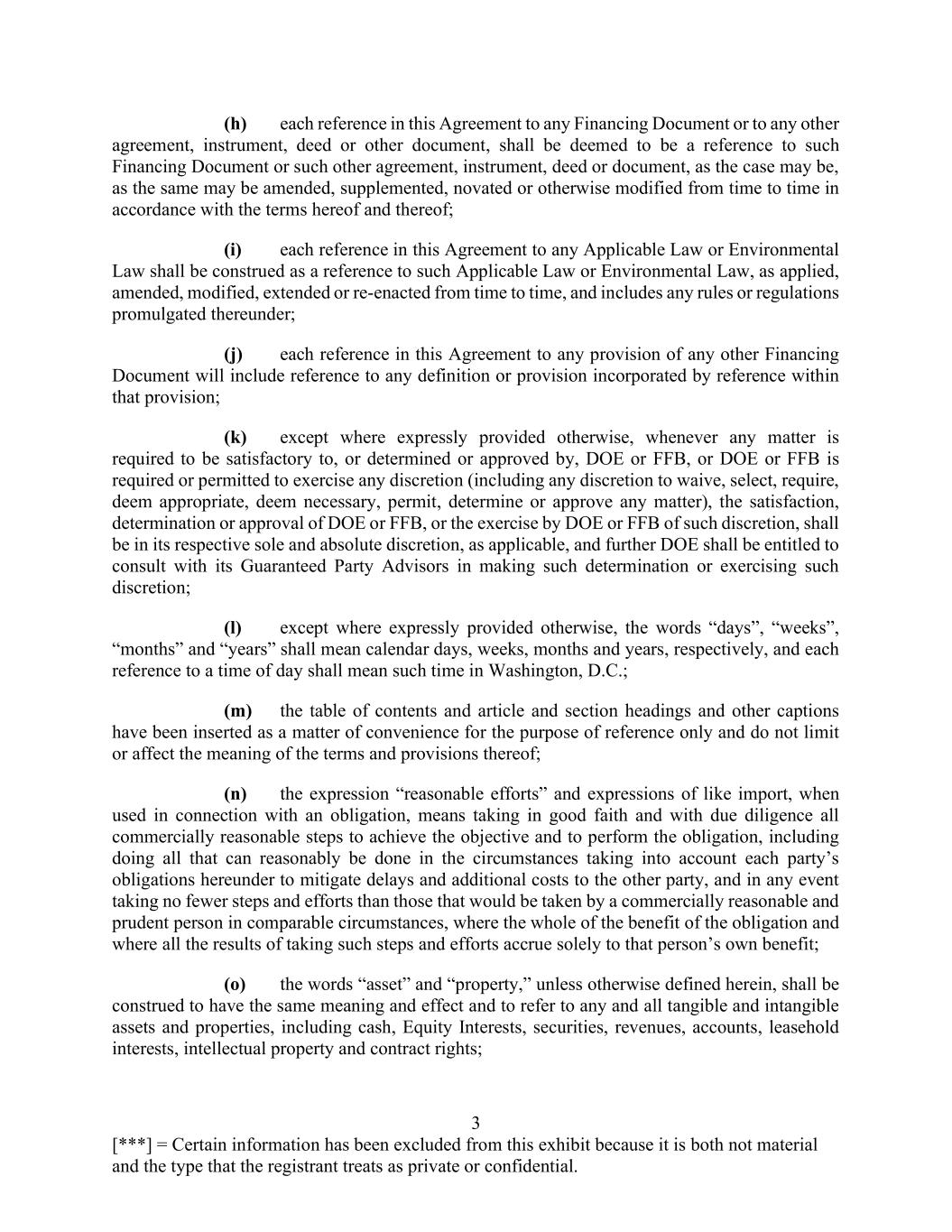 3 [***] = Certain information has been excluded from this exhibit because it is both not material and the type that the registrant treats as private or confidential. (h) each reference in this Agreement to any Financing Document or to any other agreement, instrument, deed or other document, shall be deemed to be a reference to such Financing Document or such other agreement, instrument, deed or document, as the case may be, as the same may be amended, supplemented, novated or otherwise modified from time to time in accordance with the terms hereof and thereof; (i) each reference in this Agreement to any Applicable Law or Environmental Law shall be construed as a reference to such Applicable Law or Environmental Law, as applied, amended, modified, extended or re-enacted from time to time, and includes any rules or regulations promulgated thereunder; (j) each reference in this Agreement to any provision of any other Financing Document will include reference to any definition or provision incorporated by reference within that provision; (k) except where expressly provided otherwise, whenever any matter is required to be satisfactory to, or determined or approved by, DOE or FFB, or DOE or FFB is required or permitted to exercise any discretion (including any discretion to waive, select, require, deem appropriate, deem necessary, permit, determine or approve any matter), the satisfaction, determination or approval of DOE or FFB, or the exercise by DOE or FFB of such discretion, shall be in its respective sole and absolute discretion, as applicable, and further DOE shall be entitled to consult with its Guaranteed Party Advisors in making such determination or exercising such discretion; (l) except where expressly provided otherwise, the words “days”, “weeks”, “months” and “years” shall mean calendar days, weeks, months and years, respectively, and each reference to a time of day shall mean such time in Washington, D.C.; (m) the table of contents and article and section headings and other captions have been inserted as a matter of convenience for the purpose of reference only and do not limit or affect the meaning of the terms and provisions thereof; (n) the expression “reasonable efforts” and expressions of like import, when used in connection with an obligation, means taking in good faith and with due diligence all commercially reasonable steps to achieve the objective and to perform the obligation, including doing all that can reasonably be done in the circumstances taking into account each party’s obligations hereunder to mitigate delays and additional costs to the other party, and in any event taking no fewer steps and efforts than those that would be taken by a commercially reasonable and prudent person in comparable circumstances, where the whole of the benefit of the obligation and where all the results of taking such steps and efforts accrue solely to that person’s own benefit; (o) the words “asset” and “property,” unless otherwise defined herein, shall be construed to have the same meaning and effect and to refer to any and all tangible and intangible assets and properties, including cash, Equity Interests, securities, revenues, accounts, leasehold interests, intellectual property and contract rights;