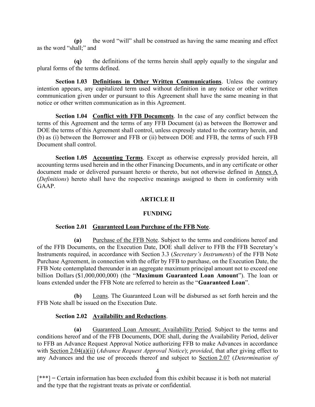 4 [***] = Certain information has been excluded from this exhibit because it is both not material and the type that the registrant treats as private or confidential. (p) the word “will” shall be construed as having the same meaning and effect as the word “shall;” and (q) the definitions of the terms herein shall apply equally to the singular and plural forms of the terms defined. Section 1.03 Definitions in Other Written Communications. Unless the contrary intention appears, any capitalized term used without definition in any notice or other written communication given under or pursuant to this Agreement shall have the same meaning in that notice or other written communication as in this Agreement. Section 1.04 Conflict with FFB Documents. In the case of any conflict between the terms of this Agreement and the terms of any FFB Document (a) as between the Borrower and DOE the terms of this Agreement shall control, unless expressly stated to the contrary herein, and (b) as (i) between the Borrower and FFB or (ii) between DOE and FFB, the terms of such FFB Document shall control. Section 1.05 Accounting Terms. Except as otherwise expressly provided herein, all accounting terms used herein and in the other Financing Documents, and in any certificate or other document made or delivered pursuant hereto or thereto, but not otherwise defined in Annex A (Definitions) hereto shall have the respective meanings assigned to them in conformity with GAAP. ARTICLE II FUNDING Section 2.01 Guaranteed Loan Purchase of the FFB Note. (a) Purchase of the FFB Note. Subject to the terms and conditions hereof and of the FFB Documents, on the Execution Date, DOE shall deliver to FFB the FFB Secretary’s Instruments required, in accordance with Section 3.3 (Secretary’s Instruments) of the FFB Note Purchase Agreement, in connection with the offer by FFB to purchase, on the Execution Date, the FFB Note contemplated thereunder in an aggregate maximum principal amount not to exceed one billion Dollars ($1,000,000,000) (the “Maximum Guaranteed Loan Amount”). The loan or loans extended under the FFB Note are referred to herein as the “Guaranteed Loan”. (b) Loans. The Guaranteed Loan will be disbursed as set forth herein and the FFB Note shall be issued on the Execution Date. Section 2.02 Availability and Reductions. (a) Guaranteed Loan Amount; Availability Period. Subject to the terms and conditions hereof and of the FFB Documents, DOE shall, during the Availability Period, deliver to FFB an Advance Request Approval Notice authorizing FFB to make Advances in accordance with Section 2.04(a)(ii) (Advance Request Approval Notice); provided, that after giving effect to any Advances and the use of proceeds thereof and subject to Section 2.07 (Determination of