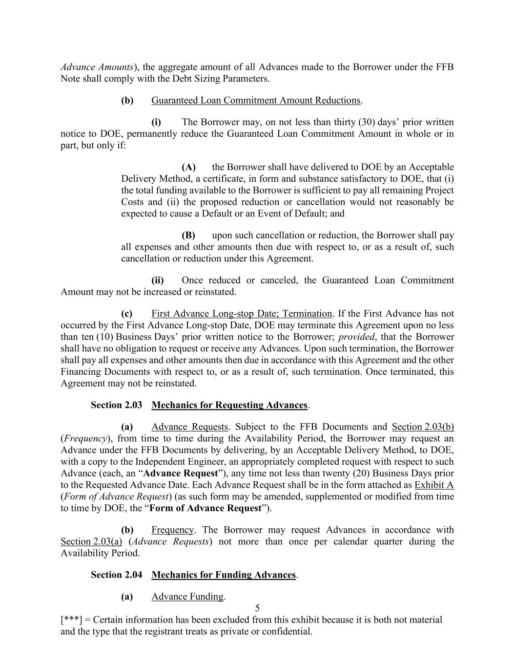 5 [***] = Certain information has been excluded from this exhibit because it is both not material and the type that the registrant treats as private or confidential. Advance Amounts), the aggregate amount of all Advances made to the Borrower under the FFB Note shall comply with the Debt Sizing Parameters. (b) Guaranteed Loan Commitment Amount Reductions. (i) The Borrower may, on not less than thirty (30) days’ prior written notice to DOE, permanently reduce the Guaranteed Loan Commitment Amount in whole or in part, but only if: (A) the Borrower shall have delivered to DOE by an Acceptable Delivery Method, a certificate, in form and substance satisfactory to DOE, that (i) the total funding available to the Borrower is sufficient to pay all remaining Project Costs and (ii) the proposed reduction or cancellation would not reasonably be expected to cause a Default or an Event of Default; and (B) upon such cancellation or reduction, the Borrower shall pay all expenses and other amounts then due with respect to, or as a result of, such cancellation or reduction under this Agreement. (ii) Once reduced or canceled, the Guaranteed Loan Commitment Amount may not be increased or reinstated. (c) First Advance Long-stop Date; Termination. If the First Advance has not occurred by the First Advance Long-stop Date, DOE may terminate this Agreement upon no less than ten (10) Business Days’ prior written notice to the Borrower; provided, that the Borrower shall have no obligation to request or receive any Advances. Upon such termination, the Borrower shall pay all expenses and other amounts then due in accordance with this Agreement and the other Financing Documents with respect to, or as a result of, such termination. Once terminated, this Agreement may not be reinstated. Section 2.03 Mechanics for Requesting Advances. (a) Advance Requests. Subject to the FFB Documents and Section 2.03(b) (Frequency), from time to time during the Availability Period, the Borrower may request an Advance under the FFB Documents by delivering, by an Acceptable Delivery Method, to DOE, with a copy to the Independent Engineer, an appropriately completed request with respect to such Advance (each, an “Advance Request”), any time not less than twenty (20) Business Days prior to the Requested Advance Date. Each Advance Request shall be in the form attached as Exhibit A (Form of Advance Request) (as such form may be amended, supplemented or modified from time to time by DOE, the “Form of Advance Request”). (b) Frequency. The Borrower may request Advances in accordance with Section 2.03(a) (Advance Requests) not more than once per calendar quarter during the Availability Period. Section 2.04 Mechanics for Funding Advances. (a) Advance Funding.