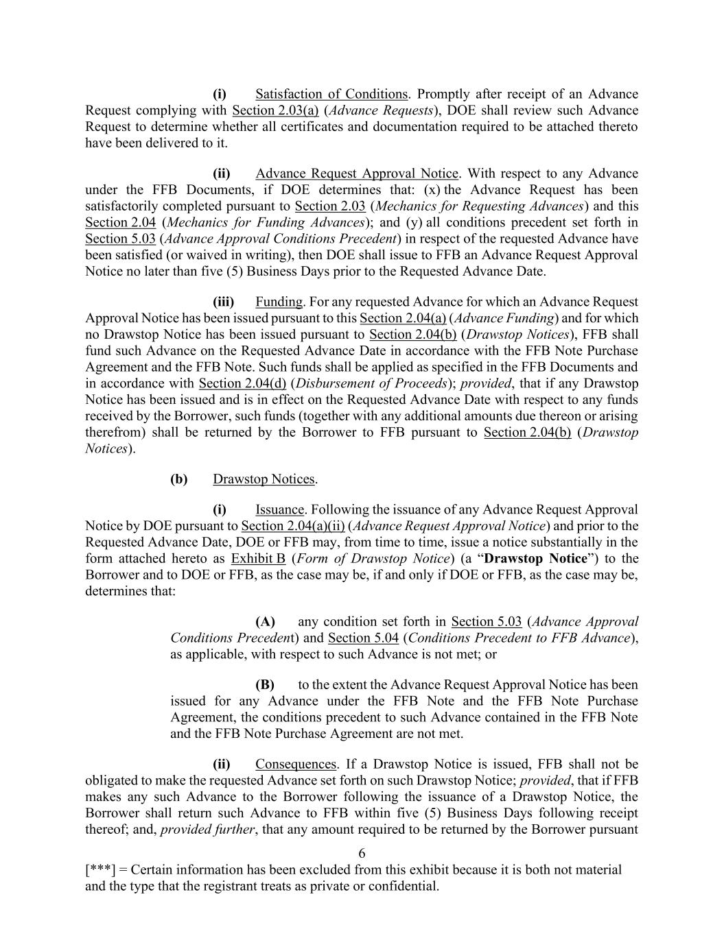 6 [***] = Certain information has been excluded from this exhibit because it is both not material and the type that the registrant treats as private or confidential. (i) Satisfaction of Conditions. Promptly after receipt of an Advance Request complying with Section 2.03(a) (Advance Requests), DOE shall review such Advance Request to determine whether all certificates and documentation required to be attached thereto have been delivered to it. (ii) Advance Request Approval Notice. With respect to any Advance under the FFB Documents, if DOE determines that: (x) the Advance Request has been satisfactorily completed pursuant to Section 2.03 (Mechanics for Requesting Advances) and this Section 2.04 (Mechanics for Funding Advances); and (y) all conditions precedent set forth in Section 5.03 (Advance Approval Conditions Precedent) in respect of the requested Advance have been satisfied (or waived in writing), then DOE shall issue to FFB an Advance Request Approval Notice no later than five (5) Business Days prior to the Requested Advance Date. (iii) Funding. For any requested Advance for which an Advance Request Approval Notice has been issued pursuant to this Section 2.04(a) (Advance Funding) and for which no Drawstop Notice has been issued pursuant to Section 2.04(b) (Drawstop Notices), FFB shall fund such Advance on the Requested Advance Date in accordance with the FFB Note Purchase Agreement and the FFB Note. Such funds shall be applied as specified in the FFB Documents and in accordance with Section 2.04(d) (Disbursement of Proceeds); provided, that if any Drawstop Notice has been issued and is in effect on the Requested Advance Date with respect to any funds received by the Borrower, such funds (together with any additional amounts due thereon or arising therefrom) shall be returned by the Borrower to FFB pursuant to Section 2.04(b) (Drawstop Notices). (b) Drawstop Notices. (i) Issuance. Following the issuance of any Advance Request Approval Notice by DOE pursuant to Section 2.04(a)(ii) (Advance Request Approval Notice) and prior to the Requested Advance Date, DOE or FFB may, from time to time, issue a notice substantially in the form attached hereto as Exhibit B (Form of Drawstop Notice) (a “Drawstop Notice”) to the Borrower and to DOE or FFB, as the case may be, if and only if DOE or FFB, as the case may be, determines that: (A) any condition set forth in Section 5.03 (Advance Approval Conditions Precedent) and Section 5.04 (Conditions Precedent to FFB Advance), as applicable, with respect to such Advance is not met; or (B) to the extent the Advance Request Approval Notice has been issued for any Advance under the FFB Note and the FFB Note Purchase Agreement, the conditions precedent to such Advance contained in the FFB Note and the FFB Note Purchase Agreement are not met. (ii) Consequences. If a Drawstop Notice is issued, FFB shall not be obligated to make the requested Advance set forth on such Drawstop Notice; provided, that if FFB makes any such Advance to the Borrower following the issuance of a Drawstop Notice, the Borrower shall return such Advance to FFB within five (5) Business Days following receipt thereof; and, provided further, that any amount required to be returned by the Borrower pursuant