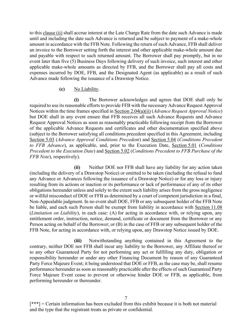 7 [***] = Certain information has been excluded from this exhibit because it is both not material and the type that the registrant treats as private or confidential. to this clause (ii) shall accrue interest at the Late Charge Rate from the date such Advance is made until and including the date such Advance is returned and be subject to payment of a make-whole amount in accordance with the FFB Note. Following the return of such Advance, FFB shall deliver an invoice to the Borrower setting forth the interest and other applicable make-whole amount due and payable with respect to such returned amount. The Borrower shall pay promptly, but in no event later than five (5) Business Days following delivery of such invoice, such interest and other applicable make-whole amounts as directed by FFB, and the Borrower shall pay all costs and expenses incurred by DOE, FFB, and the Designated Agent (as applicable) as a result of such Advance made following the issuance of a Drawstop Notice. (c) No Liability. (i) The Borrower acknowledges and agrees that DOE shall only be required to use its reasonable efforts to provide FFB with the necessary Advance Request Approval Notices within the time frames specified in Section 2.04(a)(ii) (Advance Request Approval Notice) but DOE shall in any event ensure that FFB receives all such Advance Requests and Advance Request Approval Notices as soon as reasonably practicable following receipt from the Borrower of the applicable Advance Requests and certificates and other documentation specified above (subject to the Borrower satisfying all conditions precedent specified in this Agreement, including Section 5.03 (Advance Approval Conditions Precedent) and Section 5.04 (Conditions Precedent to FFB Advance), as applicable, and, prior to the Execution Date, Section 5.01 (Conditions Precedent to the Execution Date) and Section 5.02 (Conditions Precedent to FFB Purchase of the FFB Note), respectively). (ii) Neither DOE nor FFB shall have any liability for any action taken (including the delivery of a Drawstop Notice) or omitted to be taken (including the refusal to fund any Advance or Advances following the issuance of a Drawstop Notice) or for any loss or injury resulting from its actions or inaction or its performance or lack of performance of any of its other obligations hereunder unless and solely to the extent such liability arises from the gross negligence or willful misconduct of DOE or FFB as determined by a court of competent jurisdiction in a final, Non-Appealable judgment. In no event shall DOE, FFB or any subsequent holder of the FFB Note be liable, and each such Person shall be exempt from liability in accordance with Section 11.08 (Limitation on Liability), in each case: (A) for acting in accordance with, or relying upon, any entitlement order, instruction, notice, demand, certificate or document from the Borrower or any Person acting on behalf of the Borrower; or (B) in the case of FFB or any subsequent holder of the FFB Note, for acting in accordance with, or relying upon, any Drawstop Notice issued by DOE. (iii) Notwithstanding anything contained in this Agreement to the contrary, neither DOE nor FFB shall incur any liability to the Borrower, any Affiliate thereof or to any other Guaranteed Party for not performing any act or fulfilling any duty, obligation or responsibility hereunder or under any other Financing Document by reason of any Guaranteed Party Force Majeure Event; it being understood that DOE or FFB, as the case may be, shall resume performance hereunder as soon as reasonably practicable after the effects of such Guaranteed Party Force Majeure Event cease to prevent or otherwise hinder DOE or FFB, as applicable, from performing hereunder or thereunder.