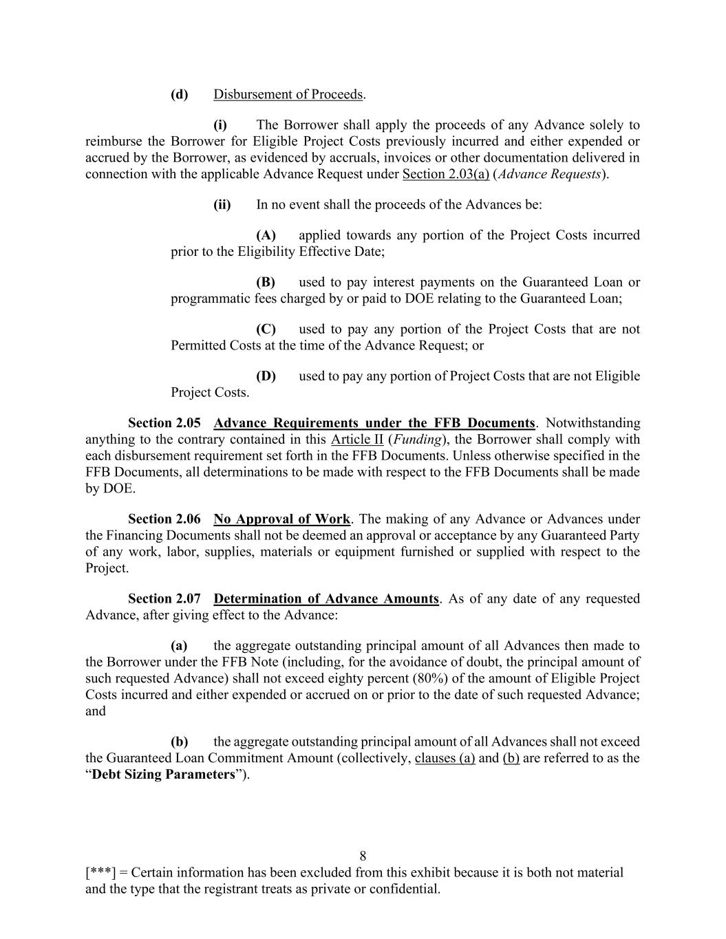 8 [***] = Certain information has been excluded from this exhibit because it is both not material and the type that the registrant treats as private or confidential. (d) Disbursement of Proceeds. (i) The Borrower shall apply the proceeds of any Advance solely to reimburse the Borrower for Eligible Project Costs previously incurred and either expended or accrued by the Borrower, as evidenced by accruals, invoices or other documentation delivered in connection with the applicable Advance Request under Section 2.03(a) (Advance Requests). (ii) In no event shall the proceeds of the Advances be: (A) applied towards any portion of the Project Costs incurred prior to the Eligibility Effective Date; (B) used to pay interest payments on the Guaranteed Loan or programmatic fees charged by or paid to DOE relating to the Guaranteed Loan; (C) used to pay any portion of the Project Costs that are not Permitted Costs at the time of the Advance Request; or (D) used to pay any portion of Project Costs that are not Eligible Project Costs. Section 2.05 Advance Requirements under the FFB Documents. Notwithstanding anything to the contrary contained in this Article II (Funding), the Borrower shall comply with each disbursement requirement set forth in the FFB Documents. Unless otherwise specified in the FFB Documents, all determinations to be made with respect to the FFB Documents shall be made by DOE. Section 2.06 No Approval of Work. The making of any Advance or Advances under the Financing Documents shall not be deemed an approval or acceptance by any Guaranteed Party of any work, labor, supplies, materials or equipment furnished or supplied with respect to the Project. Section 2.07 Determination of Advance Amounts. As of any date of any requested Advance, after giving effect to the Advance: (a) the aggregate outstanding principal amount of all Advances then made to the Borrower under the FFB Note (including, for the avoidance of doubt, the principal amount of such requested Advance) shall not exceed eighty percent (80%) of the amount of Eligible Project Costs incurred and either expended or accrued on or prior to the date of such requested Advance; and (b) the aggregate outstanding principal amount of all Advances shall not exceed the Guaranteed Loan Commitment Amount (collectively, clauses (a) and (b) are referred to as the “Debt Sizing Parameters”).