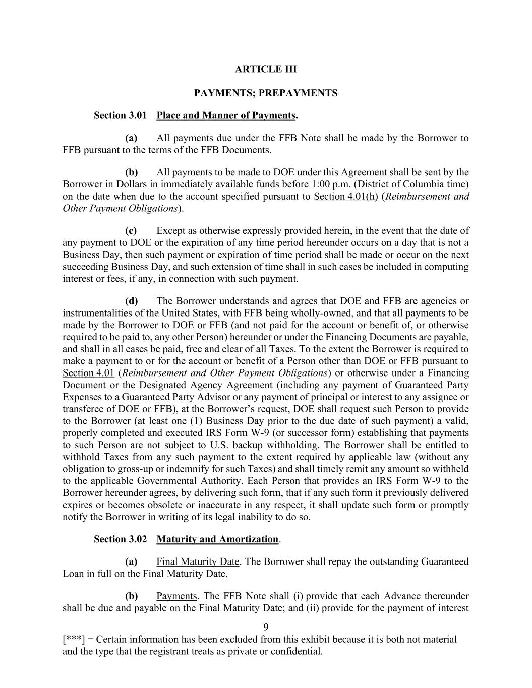 9 [***] = Certain information has been excluded from this exhibit because it is both not material and the type that the registrant treats as private or confidential. ARTICLE III PAYMENTS; PREPAYMENTS Section 3.01 Place and Manner of Payments. (a) All payments due under the FFB Note shall be made by the Borrower to FFB pursuant to the terms of the FFB Documents. (b) All payments to be made to DOE under this Agreement shall be sent by the Borrower in Dollars in immediately available funds before 1:00 p.m. (District of Columbia time) on the date when due to the account specified pursuant to Section 4.01(h) (Reimbursement and Other Payment Obligations). (c) Except as otherwise expressly provided herein, in the event that the date of any payment to DOE or the expiration of any time period hereunder occurs on a day that is not a Business Day, then such payment or expiration of time period shall be made or occur on the next succeeding Business Day, and such extension of time shall in such cases be included in computing interest or fees, if any, in connection with such payment. (d) The Borrower understands and agrees that DOE and FFB are agencies or instrumentalities of the United States, with FFB being wholly-owned, and that all payments to be made by the Borrower to DOE or FFB (and not paid for the account or benefit of, or otherwise required to be paid to, any other Person) hereunder or under the Financing Documents are payable, and shall in all cases be paid, free and clear of all Taxes. To the extent the Borrower is required to make a payment to or for the account or benefit of a Person other than DOE or FFB pursuant to Section 4.01 (Reimbursement and Other Payment Obligations) or otherwise under a Financing Document or the Designated Agency Agreement (including any payment of Guaranteed Party Expenses to a Guaranteed Party Advisor or any payment of principal or interest to any assignee or transferee of DOE or FFB), at the Borrower’s request, DOE shall request such Person to provide to the Borrower (at least one (1) Business Day prior to the due date of such payment) a valid, properly completed and executed IRS Form W-9 (or successor form) establishing that payments to such Person are not subject to U.S. backup withholding. The Borrower shall be entitled to withhold Taxes from any such payment to the extent required by applicable law (without any obligation to gross-up or indemnify for such Taxes) and shall timely remit any amount so withheld to the applicable Governmental Authority. Each Person that provides an IRS Form W-9 to the Borrower hereunder agrees, by delivering such form, that if any such form it previously delivered expires or becomes obsolete or inaccurate in any respect, it shall update such form or promptly notify the Borrower in writing of its legal inability to do so. Section 3.02 Maturity and Amortization. (a) Final Maturity Date. The Borrower shall repay the outstanding Guaranteed Loan in full on the Final Maturity Date. (b) Payments. The FFB Note shall (i) provide that each Advance thereunder shall be due and payable on the Final Maturity Date; and (ii) provide for the payment of interest