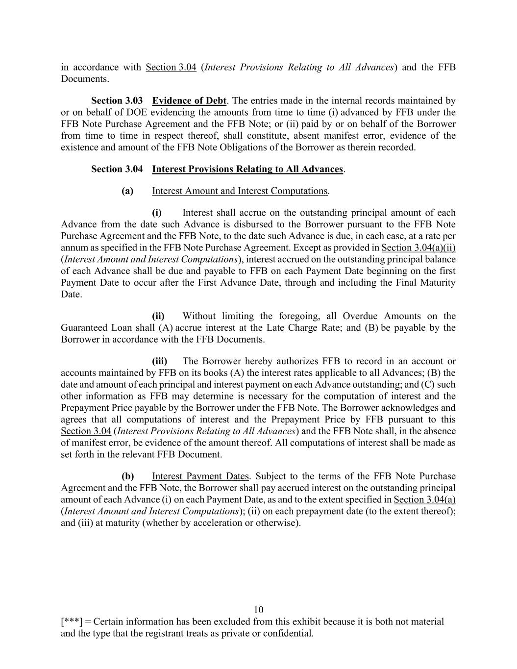 10 [***] = Certain information has been excluded from this exhibit because it is both not material and the type that the registrant treats as private or confidential. in accordance with Section 3.04 (Interest Provisions Relating to All Advances) and the FFB Documents. Section 3.03 Evidence of Debt. The entries made in the internal records maintained by or on behalf of DOE evidencing the amounts from time to time (i) advanced by FFB under the FFB Note Purchase Agreement and the FFB Note; or (ii) paid by or on behalf of the Borrower from time to time in respect thereof, shall constitute, absent manifest error, evidence of the existence and amount of the FFB Note Obligations of the Borrower as therein recorded. Section 3.04 Interest Provisions Relating to All Advances. (a) Interest Amount and Interest Computations. (i) Interest shall accrue on the outstanding principal amount of each Advance from the date such Advance is disbursed to the Borrower pursuant to the FFB Note Purchase Agreement and the FFB Note, to the date such Advance is due, in each case, at a rate per annum as specified in the FFB Note Purchase Agreement. Except as provided in Section 3.04(a)(ii) (Interest Amount and Interest Computations), interest accrued on the outstanding principal balance of each Advance shall be due and payable to FFB on each Payment Date beginning on the first Payment Date to occur after the First Advance Date, through and including the Final Maturity Date. (ii) Without limiting the foregoing, all Overdue Amounts on the Guaranteed Loan shall (A) accrue interest at the Late Charge Rate; and (B) be payable by the Borrower in accordance with the FFB Documents. (iii) The Borrower hereby authorizes FFB to record in an account or accounts maintained by FFB on its books (A) the interest rates applicable to all Advances; (B) the date and amount of each principal and interest payment on each Advance outstanding; and (C) such other information as FFB may determine is necessary for the computation of interest and the Prepayment Price payable by the Borrower under the FFB Note. The Borrower acknowledges and agrees that all computations of interest and the Prepayment Price by FFB pursuant to this Section 3.04 (Interest Provisions Relating to All Advances) and the FFB Note shall, in the absence of manifest error, be evidence of the amount thereof. All computations of interest shall be made as set forth in the relevant FFB Document. (b) Interest Payment Dates. Subject to the terms of the FFB Note Purchase Agreement and the FFB Note, the Borrower shall pay accrued interest on the outstanding principal amount of each Advance (i) on each Payment Date, as and to the extent specified in Section 3.04(a) (Interest Amount and Interest Computations); (ii) on each prepayment date (to the extent thereof); and (iii) at maturity (whether by acceleration or otherwise).