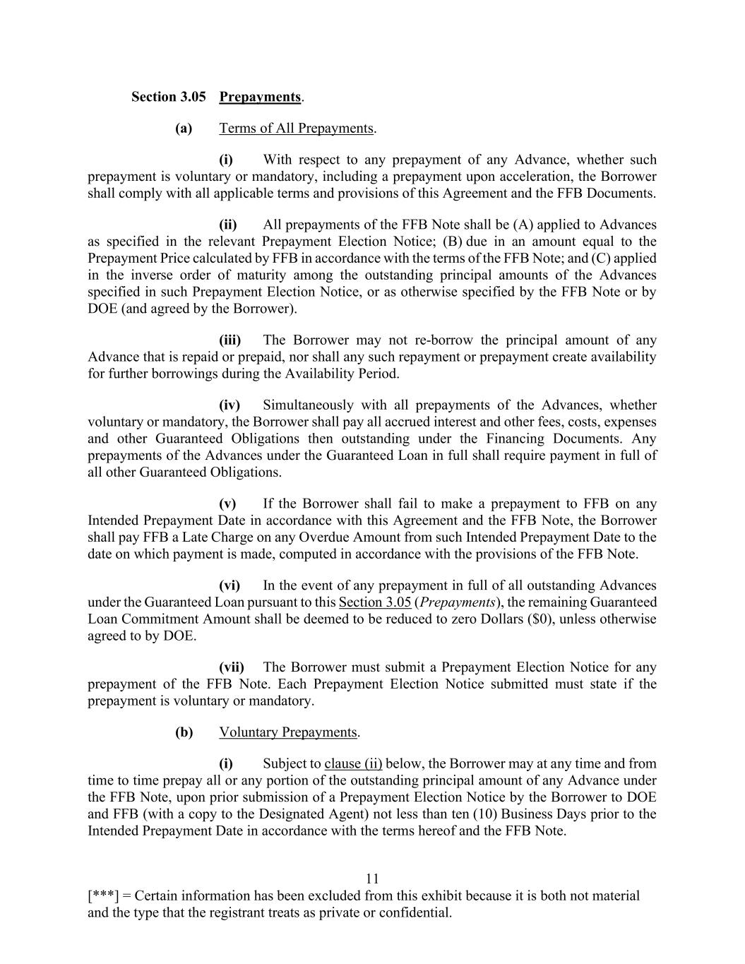 11 [***] = Certain information has been excluded from this exhibit because it is both not material and the type that the registrant treats as private or confidential. Section 3.05 Prepayments. (a) Terms of All Prepayments. (i) With respect to any prepayment of any Advance, whether such prepayment is voluntary or mandatory, including a prepayment upon acceleration, the Borrower shall comply with all applicable terms and provisions of this Agreement and the FFB Documents. (ii) All prepayments of the FFB Note shall be (A) applied to Advances as specified in the relevant Prepayment Election Notice; (B) due in an amount equal to the Prepayment Price calculated by FFB in accordance with the terms of the FFB Note; and (C) applied in the inverse order of maturity among the outstanding principal amounts of the Advances specified in such Prepayment Election Notice, or as otherwise specified by the FFB Note or by DOE (and agreed by the Borrower). (iii) The Borrower may not re-borrow the principal amount of any Advance that is repaid or prepaid, nor shall any such repayment or prepayment create availability for further borrowings during the Availability Period. (iv) Simultaneously with all prepayments of the Advances, whether voluntary or mandatory, the Borrower shall pay all accrued interest and other fees, costs, expenses and other Guaranteed Obligations then outstanding under the Financing Documents. Any prepayments of the Advances under the Guaranteed Loan in full shall require payment in full of all other Guaranteed Obligations. (v) If the Borrower shall fail to make a prepayment to FFB on any Intended Prepayment Date in accordance with this Agreement and the FFB Note, the Borrower shall pay FFB a Late Charge on any Overdue Amount from such Intended Prepayment Date to the date on which payment is made, computed in accordance with the provisions of the FFB Note. (vi) In the event of any prepayment in full of all outstanding Advances under the Guaranteed Loan pursuant to this Section 3.05 (Prepayments), the remaining Guaranteed Loan Commitment Amount shall be deemed to be reduced to zero Dollars ($0), unless otherwise agreed to by DOE. (vii) The Borrower must submit a Prepayment Election Notice for any prepayment of the FFB Note. Each Prepayment Election Notice submitted must state if the prepayment is voluntary or mandatory. (b) Voluntary Prepayments. (i) Subject to clause (ii) below, the Borrower may at any time and from time to time prepay all or any portion of the outstanding principal amount of any Advance under the FFB Note, upon prior submission of a Prepayment Election Notice by the Borrower to DOE and FFB (with a copy to the Designated Agent) not less than ten (10) Business Days prior to the Intended Prepayment Date in accordance with the terms hereof and the FFB Note.