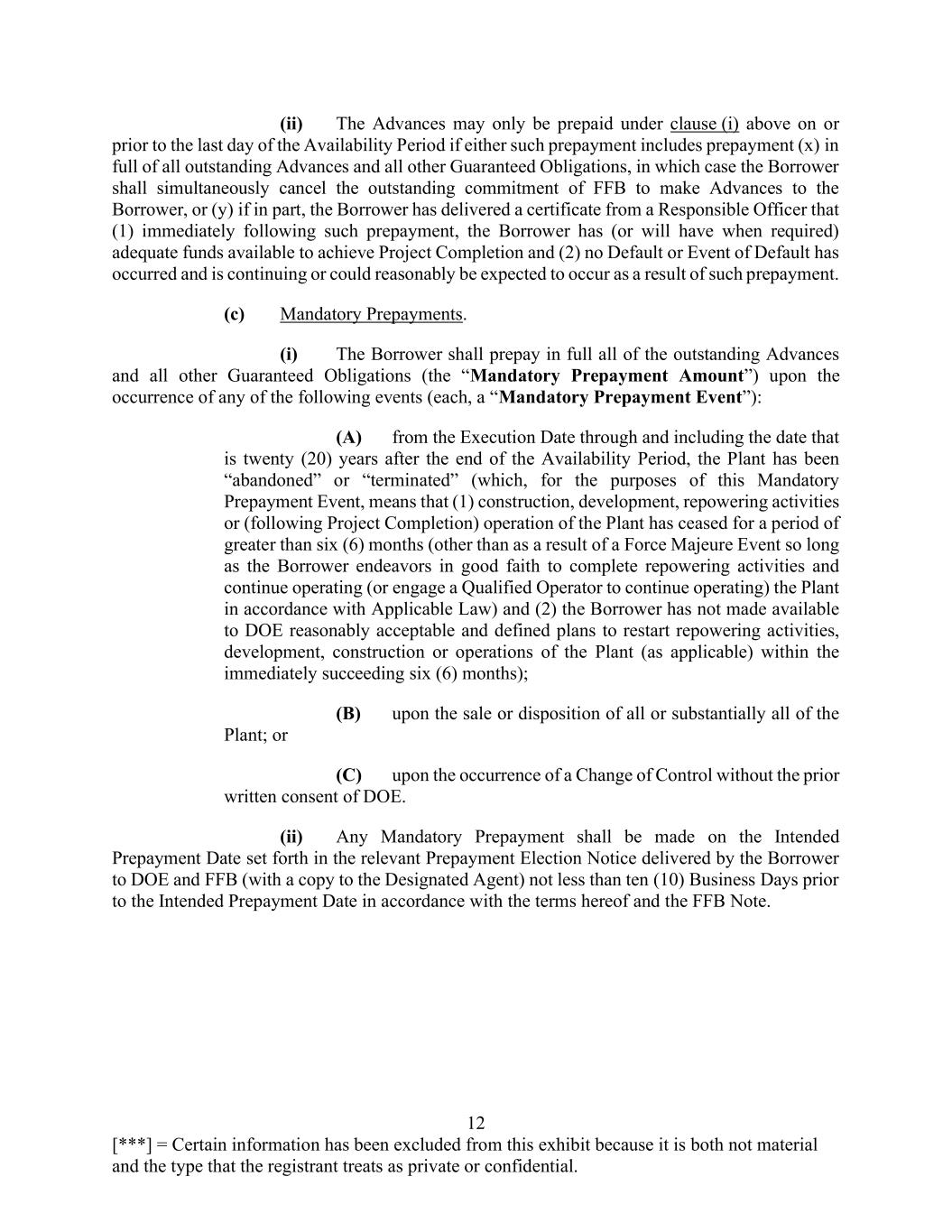 12 [***] = Certain information has been excluded from this exhibit because it is both not material and the type that the registrant treats as private or confidential. (ii) The Advances may only be prepaid under clause (i) above on or prior to the last day of the Availability Period if either such prepayment includes prepayment (x) in full of all outstanding Advances and all other Guaranteed Obligations, in which case the Borrower shall simultaneously cancel the outstanding commitment of FFB to make Advances to the Borrower, or (y) if in part, the Borrower has delivered a certificate from a Responsible Officer that (1) immediately following such prepayment, the Borrower has (or will have when required) adequate funds available to achieve Project Completion and (2) no Default or Event of Default has occurred and is continuing or could reasonably be expected to occur as a result of such prepayment. (c) Mandatory Prepayments. (i) The Borrower shall prepay in full all of the outstanding Advances and all other Guaranteed Obligations (the “Mandatory Prepayment Amount”) upon the occurrence of any of the following events (each, a “Mandatory Prepayment Event”): (A) from the Execution Date through and including the date that is twenty (20) years after the end of the Availability Period, the Plant has been “abandoned” or “terminated” (which, for the purposes of this Mandatory Prepayment Event, means that (1) construction, development, repowering activities or (following Project Completion) operation of the Plant has ceased for a period of greater than six (6) months (other than as a result of a Force Majeure Event so long as the Borrower endeavors in good faith to complete repowering activities and continue operating (or engage a Qualified Operator to continue operating) the Plant in accordance with Applicable Law) and (2) the Borrower has not made available to DOE reasonably acceptable and defined plans to restart repowering activities, development, construction or operations of the Plant (as applicable) within the immediately succeeding six (6) months); (B) upon the sale or disposition of all or substantially all of the Plant; or (C) upon the occurrence of a Change of Control without the prior written consent of DOE. (ii) Any Mandatory Prepayment shall be made on the Intended Prepayment Date set forth in the relevant Prepayment Election Notice delivered by the Borrower to DOE and FFB (with a copy to the Designated Agent) not less than ten (10) Business Days prior to the Intended Prepayment Date in accordance with the terms hereof and the FFB Note.
