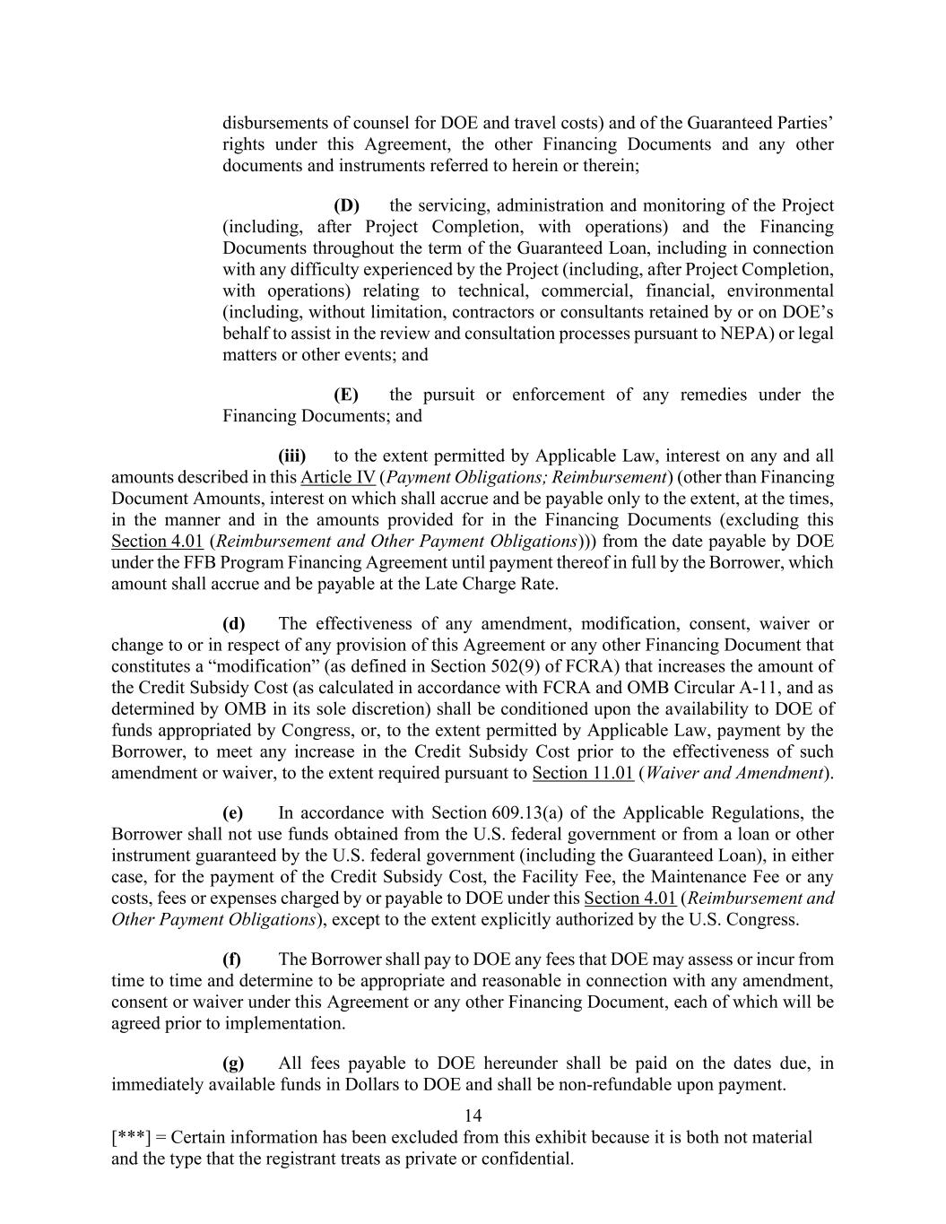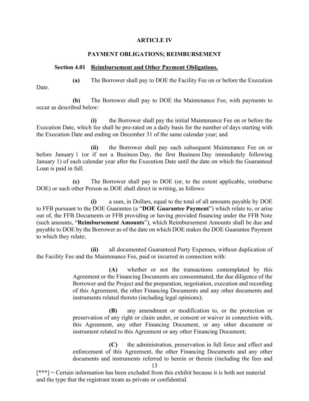 13 [***] = Certain information has been excluded from this exhibit because it is both not material and the type that the registrant treats as private or confidential. ARTICLE IV PAYMENT OBLIGATIONS; REIMBURSEMENT Section 4.01 Reimbursement and Other Payment Obligations. (a) The Borrower shall pay to DOE the Facility Fee on or before the Execution Date. (b) The Borrower shall pay to DOE the Maintenance Fee, with payments to occur as described below: (i) the Borrower shall pay the initial Maintenance Fee on or before the Execution Date, which fee shall be pro-rated on a daily basis for the number of days starting with the Execution Date and ending on December 31 of the same calendar year; and (ii) the Borrower shall pay each subsequent Maintenance Fee on or before January 1 (or if not a Business Day, the first Business Day immediately following January 1) of each calendar year after the Execution Date until the date on which the Guaranteed Loan is paid in full. (c) The Borrower shall pay to DOE (or, to the extent applicable, reimburse DOE) or such other Person as DOE shall direct in writing, as follows: (i) a sum, in Dollars, equal to the total of all amounts payable by DOE to FFB pursuant to the DOE Guarantee (a “DOE Guarantee Payment”) which relate to, or arise out of, the FFB Documents or FFB providing or having provided financing under the FFB Note (such amounts, “Reimbursement Amounts”), which Reimbursement Amounts shall be due and payable to DOE by the Borrower as of the date on which DOE makes the DOE Guarantee Payment to which they relate; (ii) all documented Guaranteed Party Expenses, without duplication of the Facility Fee and the Maintenance Fee, paid or incurred in connection with: (A) whether or not the transactions contemplated by this Agreement or the Financing Documents are consummated, the due diligence of the Borrower and the Project and the preparation, negotiation, execution and recording of this Agreement, the other Financing Documents and any other documents and instruments related thereto (including legal opinions); (B) any amendment or modification to, or the protection or preservation of any right or claim under, or consent or waiver in connection with, this Agreement, any other Financing Document, or any other document or instrument related to this Agreement or any other Financing Document; (C) the administration, preservation in full force and effect and enforcement of this Agreement, the other Financing Documents and any other documents and instruments referred to herein or therein (including the fees and