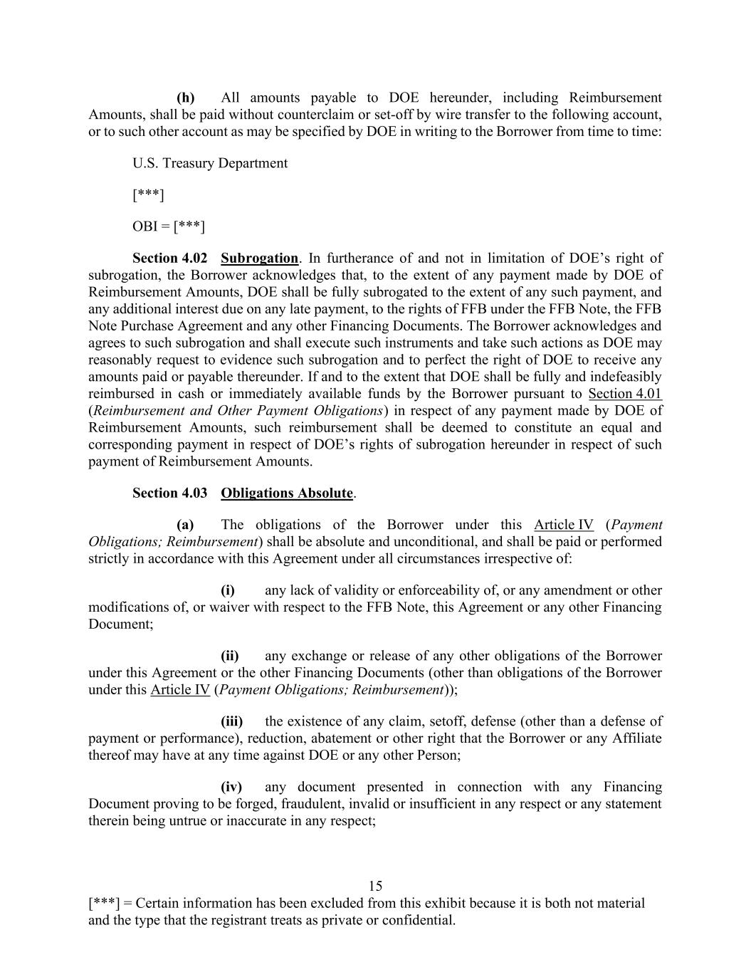 15 [***] = Certain information has been excluded from this exhibit because it is both not material and the type that the registrant treats as private or confidential. (h) All amounts payable to DOE hereunder, including Reimbursement Amounts, shall be paid without counterclaim or set-off by wire transfer to the following account, or to such other account as may be specified by DOE in writing to the Borrower from time to time: U.S. Treasury Department [***] OBI = [***] Section 4.02 Subrogation. In furtherance of and not in limitation of DOE’s right of subrogation, the Borrower acknowledges that, to the extent of any payment made by DOE of Reimbursement Amounts, DOE shall be fully subrogated to the extent of any such payment, and any additional interest due on any late payment, to the rights of FFB under the FFB Note, the FFB Note Purchase Agreement and any other Financing Documents. The Borrower acknowledges and agrees to such subrogation and shall execute such instruments and take such actions as DOE may reasonably request to evidence such subrogation and to perfect the right of DOE to receive any amounts paid or payable thereunder. If and to the extent that DOE shall be fully and indefeasibly reimbursed in cash or immediately available funds by the Borrower pursuant to Section 4.01 (Reimbursement and Other Payment Obligations) in respect of any payment made by DOE of Reimbursement Amounts, such reimbursement shall be deemed to constitute an equal and corresponding payment in respect of DOE’s rights of subrogation hereunder in respect of such payment of Reimbursement Amounts. Section 4.03 Obligations Absolute. (a) The obligations of the Borrower under this Article IV (Payment Obligations; Reimbursement) shall be absolute and unconditional, and shall be paid or performed strictly in accordance with this Agreement under all circumstances irrespective of: (i) any lack of validity or enforceability of, or any amendment or other modifications of, or waiver with respect to the FFB Note, this Agreement or any other Financing Document; (ii) any exchange or release of any other obligations of the Borrower under this Agreement or the other Financing Documents (other than obligations of the Borrower under this Article IV (Payment Obligations; Reimbursement)); (iii) the existence of any claim, setoff, defense (other than a defense of payment or performance), reduction, abatement or other right that the Borrower or any Affiliate thereof may have at any time against DOE or any other Person; (iv) any document presented in connection with any Financing Document proving to be forged, fraudulent, invalid or insufficient in any respect or any statement therein being untrue or inaccurate in any respect;