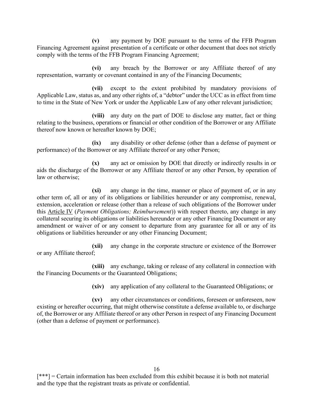 16 [***] = Certain information has been excluded from this exhibit because it is both not material and the type that the registrant treats as private or confidential. (v) any payment by DOE pursuant to the terms of the FFB Program Financing Agreement against presentation of a certificate or other document that does not strictly comply with the terms of the FFB Program Financing Agreement; (vi) any breach by the Borrower or any Affiliate thereof of any representation, warranty or covenant contained in any of the Financing Documents; (vii) except to the extent prohibited by mandatory provisions of Applicable Law, status as, and any other rights of, a “debtor” under the UCC as in effect from time to time in the State of New York or under the Applicable Law of any other relevant jurisdiction; (viii) any duty on the part of DOE to disclose any matter, fact or thing relating to the business, operations or financial or other condition of the Borrower or any Affiliate thereof now known or hereafter known by DOE; (ix) any disability or other defense (other than a defense of payment or performance) of the Borrower or any Affiliate thereof or any other Person; (x) any act or omission by DOE that directly or indirectly results in or aids the discharge of the Borrower or any Affiliate thereof or any other Person, by operation of law or otherwise; (xi) any change in the time, manner or place of payment of, or in any other term of, all or any of its obligations or liabilities hereunder or any compromise, renewal, extension, acceleration or release (other than a release of such obligations of the Borrower under this Article IV (Payment Obligations; Reimbursement)) with respect thereto, any change in any collateral securing its obligations or liabilities hereunder or any other Financing Document or any amendment or waiver of or any consent to departure from any guarantee for all or any of its obligations or liabilities hereunder or any other Financing Document; (xii) any change in the corporate structure or existence of the Borrower or any Affiliate thereof; (xiii) any exchange, taking or release of any collateral in connection with the Financing Documents or the Guaranteed Obligations; (xiv) any application of any collateral to the Guaranteed Obligations; or (xv) any other circumstances or conditions, foreseen or unforeseen, now existing or hereafter occurring, that might otherwise constitute a defense available to, or discharge of, the Borrower or any Affiliate thereof or any other Person in respect of any Financing Document (other than a defense of payment or performance).