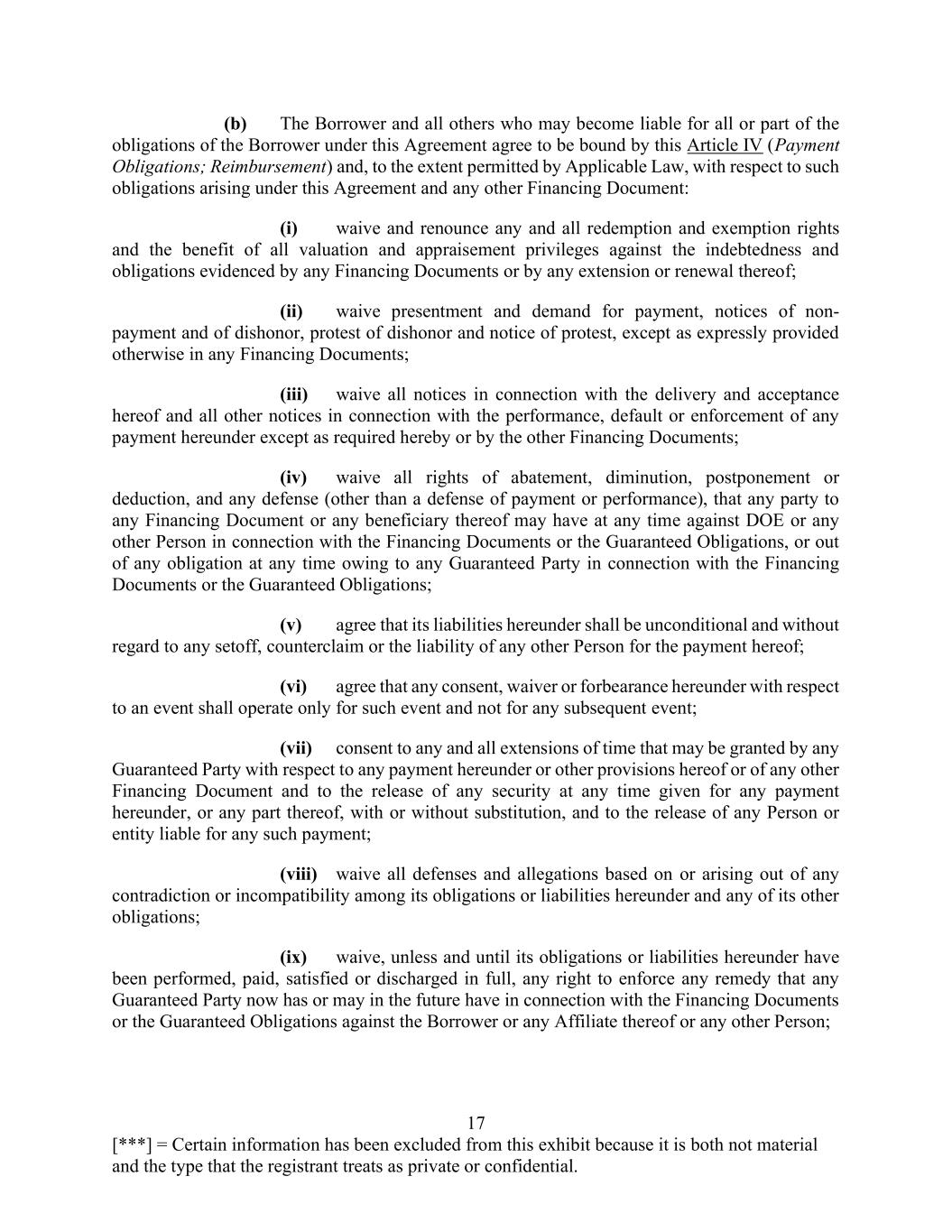 17 [***] = Certain information has been excluded from this exhibit because it is both not material and the type that the registrant treats as private or confidential. (b) The Borrower and all others who may become liable for all or part of the obligations of the Borrower under this Agreement agree to be bound by this Article IV (Payment Obligations; Reimbursement) and, to the extent permitted by Applicable Law, with respect to such obligations arising under this Agreement and any other Financing Document: (i) waive and renounce any and all redemption and exemption rights and the benefit of all valuation and appraisement privileges against the indebtedness and obligations evidenced by any Financing Documents or by any extension or renewal thereof; (ii) waive presentment and demand for payment, notices of non- payment and of dishonor, protest of dishonor and notice of protest, except as expressly provided otherwise in any Financing Documents; (iii) waive all notices in connection with the delivery and acceptance hereof and all other notices in connection with the performance, default or enforcement of any payment hereunder except as required hereby or by the other Financing Documents; (iv) waive all rights of abatement, diminution, postponement or deduction, and any defense (other than a defense of payment or performance), that any party to any Financing Document or any beneficiary thereof may have at any time against DOE or any other Person in connection with the Financing Documents or the Guaranteed Obligations, or out of any obligation at any time owing to any Guaranteed Party in connection with the Financing Documents or the Guaranteed Obligations; (v) agree that its liabilities hereunder shall be unconditional and without regard to any setoff, counterclaim or the liability of any other Person for the payment hereof; (vi) agree that any consent, waiver or forbearance hereunder with respect to an event shall operate only for such event and not for any subsequent event; (vii) consent to any and all extensions of time that may be granted by any Guaranteed Party with respect to any payment hereunder or other provisions hereof or of any other Financing Document and to the release of any security at any time given for any payment hereunder, or any part thereof, with or without substitution, and to the release of any Person or entity liable for any such payment; (viii) waive all defenses and allegations based on or arising out of any contradiction or incompatibility among its obligations or liabilities hereunder and any of its other obligations; (ix) waive, unless and until its obligations or liabilities hereunder have been performed, paid, satisfied or discharged in full, any right to enforce any remedy that any Guaranteed Party now has or may in the future have in connection with the Financing Documents or the Guaranteed Obligations against the Borrower or any Affiliate thereof or any other Person;