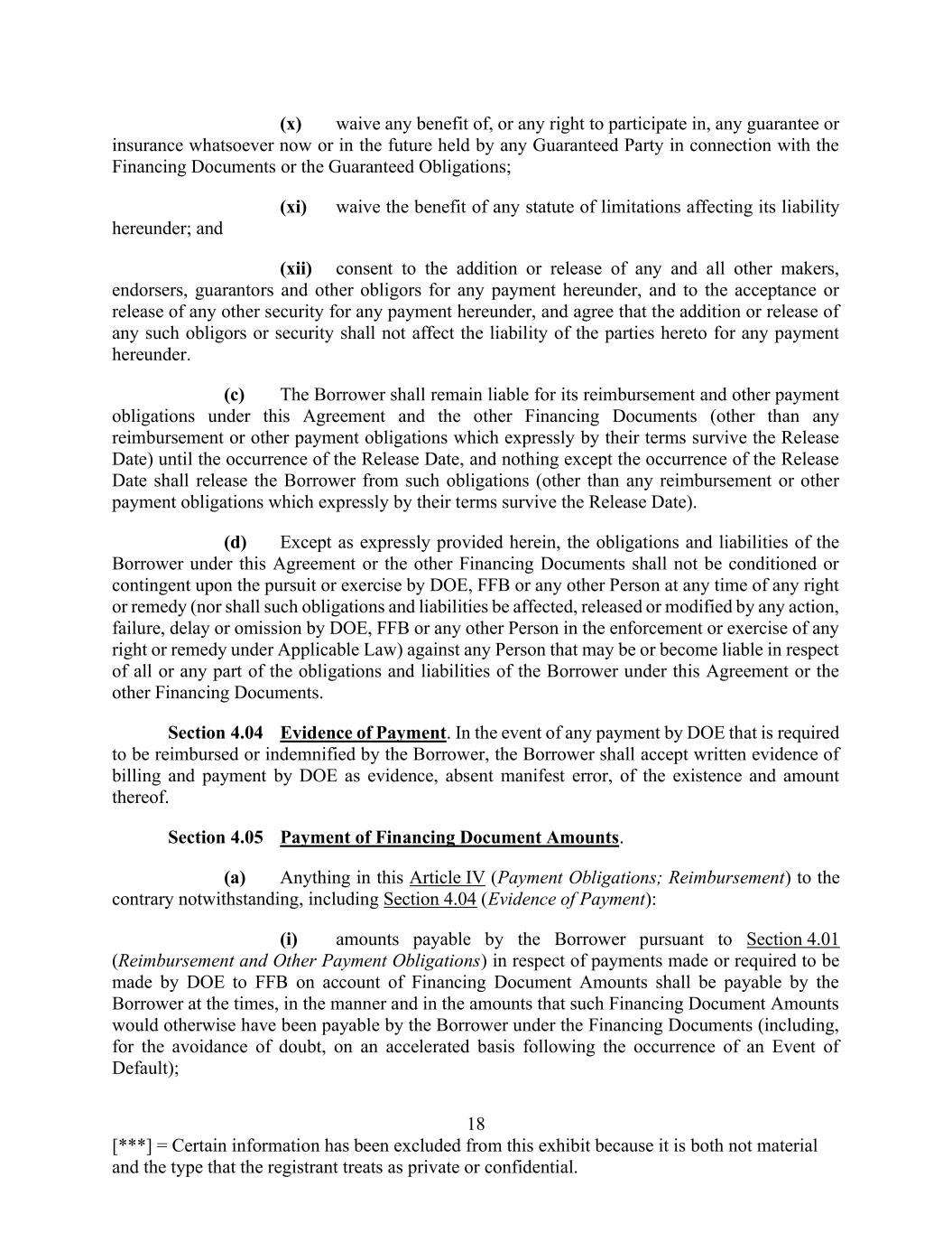 18 [***] = Certain information has been excluded from this exhibit because it is both not material and the type that the registrant treats as private or confidential. (x) waive any benefit of, or any right to participate in, any guarantee or insurance whatsoever now or in the future held by any Guaranteed Party in connection with the Financing Documents or the Guaranteed Obligations; (xi) waive the benefit of any statute of limitations affecting its liability hereunder; and (xii) consent to the addition or release of any and all other makers, endorsers, guarantors and other obligors for any payment hereunder, and to the acceptance or release of any other security for any payment hereunder, and agree that the addition or release of any such obligors or security shall not affect the liability of the parties hereto for any payment hereunder. (c) The Borrower shall remain liable for its reimbursement and other payment obligations under this Agreement and the other Financing Documents (other than any reimbursement or other payment obligations which expressly by their terms survive the Release Date) until the occurrence of the Release Date, and nothing except the occurrence of the Release Date shall release the Borrower from such obligations (other than any reimbursement or other payment obligations which expressly by their terms survive the Release Date). (d) Except as expressly provided herein, the obligations and liabilities of the Borrower under this Agreement or the other Financing Documents shall not be conditioned or contingent upon the pursuit or exercise by DOE, FFB or any other Person at any time of any right or remedy (nor shall such obligations and liabilities be affected, released or modified by any action, failure, delay or omission by DOE, FFB or any other Person in the enforcement or exercise of any right or remedy under Applicable Law) against any Person that may be or become liable in respect of all or any part of the obligations and liabilities of the Borrower under this Agreement or the other Financing Documents. Section 4.04 Evidence of Payment. In the event of any payment by DOE that is required to be reimbursed or indemnified by the Borrower, the Borrower shall accept written evidence of billing and payment by DOE as evidence, absent manifest error, of the existence and amount thereof. Section 4.05 Payment of Financing Document Amounts. (a) Anything in this Article IV (Payment Obligations; Reimbursement) to the contrary notwithstanding, including Section 4.04 (Evidence of Payment): (i) amounts payable by the Borrower pursuant to Section 4.01 (Reimbursement and Other Payment Obligations) in respect of payments made or required to be made by DOE to FFB on account of Financing Document Amounts shall be payable by the Borrower at the times, in the manner and in the amounts that such Financing Document Amounts would otherwise have been payable by the Borrower under the Financing Documents (including, for the avoidance of doubt, on an accelerated basis following the occurrence of an Event of Default);