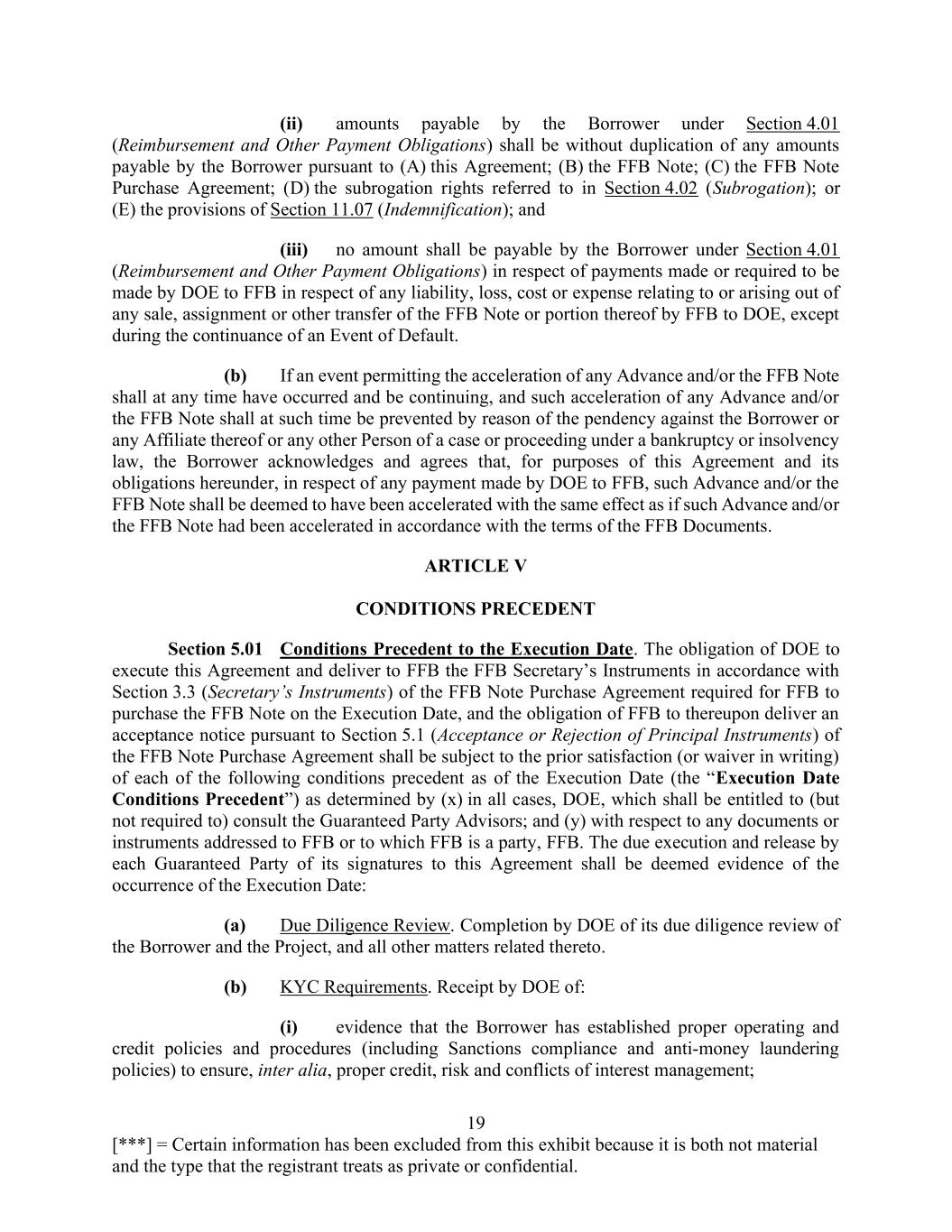 19 [***] = Certain information has been excluded from this exhibit because it is both not material and the type that the registrant treats as private or confidential. (ii) amounts payable by the Borrower under Section 4.01 (Reimbursement and Other Payment Obligations) shall be without duplication of any amounts payable by the Borrower pursuant to (A) this Agreement; (B) the FFB Note; (C) the FFB Note Purchase Agreement; (D) the subrogation rights referred to in Section 4.02 (Subrogation); or (E) the provisions of Section 11.07 (Indemnification); and (iii) no amount shall be payable by the Borrower under Section 4.01 (Reimbursement and Other Payment Obligations) in respect of payments made or required to be made by DOE to FFB in respect of any liability, loss, cost or expense relating to or arising out of any sale, assignment or other transfer of the FFB Note or portion thereof by FFB to DOE, except during the continuance of an Event of Default. (b) If an event permitting the acceleration of any Advance and/or the FFB Note shall at any time have occurred and be continuing, and such acceleration of any Advance and/or the FFB Note shall at such time be prevented by reason of the pendency against the Borrower or any Affiliate thereof or any other Person of a case or proceeding under a bankruptcy or insolvency law, the Borrower acknowledges and agrees that, for purposes of this Agreement and its obligations hereunder, in respect of any payment made by DOE to FFB, such Advance and/or the FFB Note shall be deemed to have been accelerated with the same effect as if such Advance and/or the FFB Note had been accelerated in accordance with the terms of the FFB Documents. ARTICLE V CONDITIONS PRECEDENT Section 5.01 Conditions Precedent to the Execution Date. The obligation of DOE to execute this Agreement and deliver to FFB the FFB Secretary’s Instruments in accordance with Section 3.3 (Secretary’s Instruments) of the FFB Note Purchase Agreement required for FFB to purchase the FFB Note on the Execution Date, and the obligation of FFB to thereupon deliver an acceptance notice pursuant to Section 5.1 (Acceptance or Rejection of Principal Instruments) of the FFB Note Purchase Agreement shall be subject to the prior satisfaction (or waiver in writing) of each of the following conditions precedent as of the Execution Date (the “Execution Date Conditions Precedent”) as determined by (x) in all cases, DOE, which shall be entitled to (but not required to) consult the Guaranteed Party Advisors; and (y) with respect to any documents or instruments addressed to FFB or to which FFB is a party, FFB. The due execution and release by each Guaranteed Party of its signatures to this Agreement shall be deemed evidence of the occurrence of the Execution Date: (a) Due Diligence Review. Completion by DOE of its due diligence review of the Borrower and the Project, and all other matters related thereto. (b) KYC Requirements. Receipt by DOE of: (i) evidence that the Borrower has established proper operating and credit policies and procedures (including Sanctions compliance and anti-money laundering policies) to ensure, inter alia, proper credit, risk and conflicts of interest management;