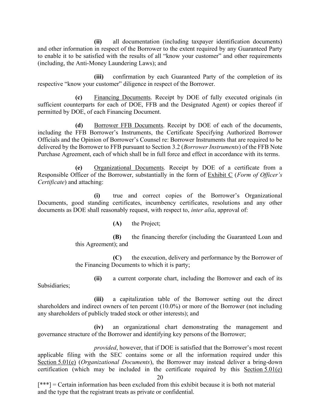 20 [***] = Certain information has been excluded from this exhibit because it is both not material and the type that the registrant treats as private or confidential. (ii) all documentation (including taxpayer identification documents) and other information in respect of the Borrower to the extent required by any Guaranteed Party to enable it to be satisfied with the results of all “know your customer” and other requirements (including, the Anti-Money Laundering Laws); and (iii) confirmation by each Guaranteed Party of the completion of its respective “know your customer” diligence in respect of the Borrower. (c) Financing Documents. Receipt by DOE of fully executed originals (in sufficient counterparts for each of DOE, FFB and the Designated Agent) or copies thereof if permitted by DOE, of each Financing Document. (d) Borrower FFB Documents. Receipt by DOE of each of the documents, including the FFB Borrower’s Instruments, the Certificate Specifying Authorized Borrower Officials and the Opinion of Borrower’s Counsel re: Borrower Instruments that are required to be delivered by the Borrower to FFB pursuant to Section 3.2 (Borrower Instruments) of the FFB Note Purchase Agreement, each of which shall be in full force and effect in accordance with its terms. (e) Organizational Documents. Receipt by DOE of a certificate from a Responsible Officer of the Borrower, substantially in the form of Exhibit C (Form of Officer’s Certificate) and attaching: (i) true and correct copies of the Borrower’s Organizational Documents, good standing certificates, incumbency certificates, resolutions and any other documents as DOE shall reasonably request, with respect to, inter alia, approval of: (A) the Project; (B) the financing therefor (including the Guaranteed Loan and this Agreement); and (C) the execution, delivery and performance by the Borrower of the Financing Documents to which it is party; (ii) a current corporate chart, including the Borrower and each of its Subsidiaries; (iii) a capitalization table of the Borrower setting out the direct shareholders and indirect owners of ten percent (10.0%) or more of the Borrower (not including any shareholders of publicly traded stock or other interests); and (iv) an organizational chart demonstrating the management and governance structure of the Borrower and identifying key persons of the Borrower; provided, however, that if DOE is satisfied that the Borrower’s most recent applicable filing with the SEC contains some or all the information required under this Section 5.01(e) (Organizational Documents), the Borrower may instead deliver a bring-down certification (which may be included in the certificate required by this Section 5.01(e)