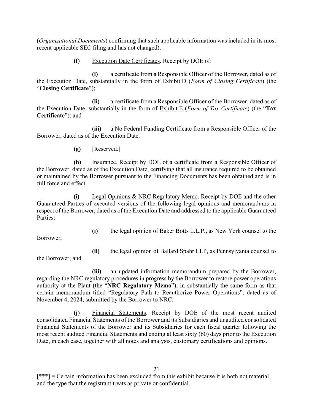 21 [***] = Certain information has been excluded from this exhibit because it is both not material and the type that the registrant treats as private or confidential. (Organizational Documents) confirming that such applicable information was included in its most recent applicable SEC filing and has not changed). (f) Execution Date Certificates. Receipt by DOE of: (i) a certificate from a Responsible Officer of the Borrower, dated as of the Execution Date, substantially in the form of Exhibit D (Form of Closing Certificate) (the “Closing Certificate”); (ii) a certificate from a Responsible Officer of the Borrower, dated as of the Execution Date, substantially in the form of Exhibit E (Form of Tax Certificate) (the “Tax Certificate”); and (iii) a No Federal Funding Certificate from a Responsible Officer of the Borrower, dated as of the Execution Date. (g) [Reserved.] (h) Insurance. Receipt by DOE of a certificate from a Responsible Officer of the Borrower, dated as of the Execution Date, certifying that all insurance required to be obtained or maintained by the Borrower pursuant to the Financing Documents has been obtained and is in full force and effect. (i) Legal Opinions & NRC Regulatory Memo. Receipt by DOE and the other Guaranteed Parties of executed versions of the following legal opinions and memorandums in respect of the Borrower, dated as of the Execution Date and addressed to the applicable Guaranteed Parties: (i) the legal opinion of Baker Botts L.L.P., as New York counsel to the Borrower; (ii) the legal opinion of Ballard Spahr LLP, as Pennsylvania counsel to the Borrower; and (iii) an updated information memorandum prepared by the Borrower, regarding the NRC regulatory procedures in progress by the Borrower to restore power operations authority at the Plant (the “NRC Regulatory Memo”), in substantially the same form as that certain memorandum titled “Regulatory Path to Reauthorize Power Operations”, dated as of November 4, 2024, submitted by the Borrower to NRC. (j) Financial Statements. Receipt by DOE of the most recent audited consolidated Financial Statements of the Borrower and its Subsidiaries and unaudited consolidated Financial Statements of the Borrower and its Subsidiaries for each fiscal quarter following the most recent audited Financial Statements and ending at least sixty (60) days prior to the Execution Date, in each case, together with all notes and analysis, customary certifications and opinions.