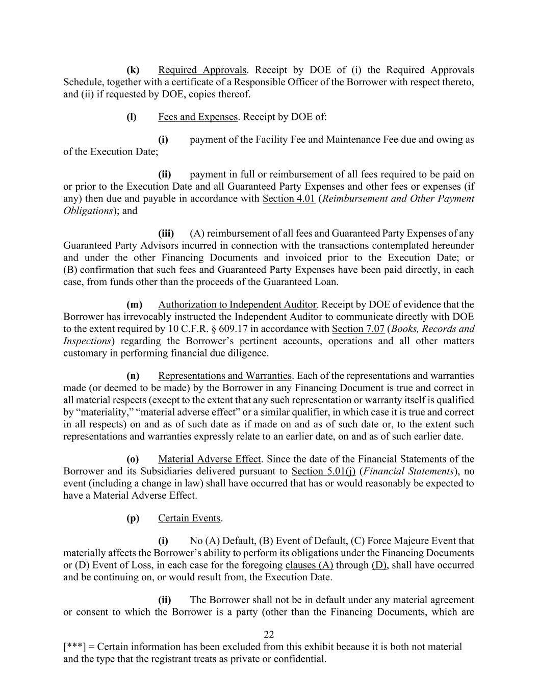 22 [***] = Certain information has been excluded from this exhibit because it is both not material and the type that the registrant treats as private or confidential. (k) Required Approvals. Receipt by DOE of (i) the Required Approvals Schedule, together with a certificate of a Responsible Officer of the Borrower with respect thereto, and (ii) if requested by DOE, copies thereof. (l) Fees and Expenses. Receipt by DOE of: (i) payment of the Facility Fee and Maintenance Fee due and owing as of the Execution Date; (ii) payment in full or reimbursement of all fees required to be paid on or prior to the Execution Date and all Guaranteed Party Expenses and other fees or expenses (if any) then due and payable in accordance with Section 4.01 (Reimbursement and Other Payment Obligations); and (iii) (A) reimbursement of all fees and Guaranteed Party Expenses of any Guaranteed Party Advisors incurred in connection with the transactions contemplated hereunder and under the other Financing Documents and invoiced prior to the Execution Date; or (B) confirmation that such fees and Guaranteed Party Expenses have been paid directly, in each case, from funds other than the proceeds of the Guaranteed Loan. (m) Authorization to Independent Auditor. Receipt by DOE of evidence that the Borrower has irrevocably instructed the Independent Auditor to communicate directly with DOE to the extent required by 10 C.F.R. § 609.17 in accordance with Section 7.07 (Books, Records and Inspections) regarding the Borrower’s pertinent accounts, operations and all other matters customary in performing financial due diligence. (n) Representations and Warranties. Each of the representations and warranties made (or deemed to be made) by the Borrower in any Financing Document is true and correct in all material respects (except to the extent that any such representation or warranty itself is qualified by “materiality,” “material adverse effect” or a similar qualifier, in which case it is true and correct in all respects) on and as of such date as if made on and as of such date or, to the extent such representations and warranties expressly relate to an earlier date, on and as of such earlier date. (o) Material Adverse Effect. Since the date of the Financial Statements of the Borrower and its Subsidiaries delivered pursuant to Section 5.01(j) (Financial Statements), no event (including a change in law) shall have occurred that has or would reasonably be expected to have a Material Adverse Effect. (p) Certain Events. (i) No (A) Default, (B) Event of Default, (C) Force Majeure Event that materially affects the Borrower’s ability to perform its obligations under the Financing Documents or (D) Event of Loss, in each case for the foregoing clauses (A) through (D), shall have occurred and be continuing on, or would result from, the Execution Date. (ii) The Borrower shall not be in default under any material agreement or consent to which the Borrower is a party (other than the Financing Documents, which are