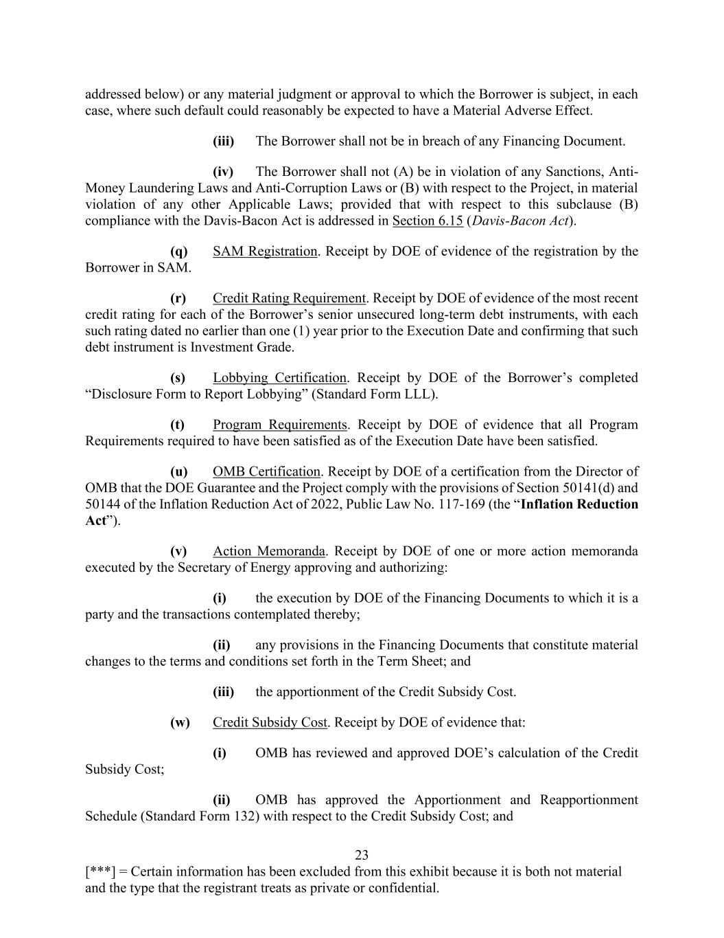 23 [***] = Certain information has been excluded from this exhibit because it is both not material and the type that the registrant treats as private or confidential. addressed below) or any material judgment or approval to which the Borrower is subject, in each case, where such default could reasonably be expected to have a Material Adverse Effect. (iii) The Borrower shall not be in breach of any Financing Document. (iv) The Borrower shall not (A) be in violation of any Sanctions, Anti- Money Laundering Laws and Anti-Corruption Laws or (B) with respect to the Project, in material violation of any other Applicable Laws; provided that with respect to this subclause (B) compliance with the Davis-Bacon Act is addressed in Section 6.15 (Davis-Bacon Act). (q) SAM Registration. Receipt by DOE of evidence of the registration by the Borrower in SAM. (r) Credit Rating Requirement. Receipt by DOE of evidence of the most recent credit rating for each of the Borrower’s senior unsecured long-term debt instruments, with each such rating dated no earlier than one (1) year prior to the Execution Date and confirming that such debt instrument is Investment Grade. (s) Lobbying Certification. Receipt by DOE of the Borrower’s completed “Disclosure Form to Report Lobbying” (Standard Form LLL). (t) Program Requirements. Receipt by DOE of evidence that all Program Requirements required to have been satisfied as of the Execution Date have been satisfied. (u) OMB Certification. Receipt by DOE of a certification from the Director of OMB that the DOE Guarantee and the Project comply with the provisions of Section 50141(d) and 50144 of the Inflation Reduction Act of 2022, Public Law No. 117-169 (the “Inflation Reduction Act”). (v) Action Memoranda. Receipt by DOE of one or more action memoranda executed by the Secretary of Energy approving and authorizing: (i) the execution by DOE of the Financing Documents to which it is a party and the transactions contemplated thereby; (ii) any provisions in the Financing Documents that constitute material changes to the terms and conditions set forth in the Term Sheet; and (iii) the apportionment of the Credit Subsidy Cost. (w) Credit Subsidy Cost. Receipt by DOE of evidence that: (i) OMB has reviewed and approved DOE’s calculation of the Credit Subsidy Cost; (ii) OMB has approved the Apportionment and Reapportionment Schedule (Standard Form 132) with respect to the Credit Subsidy Cost; and